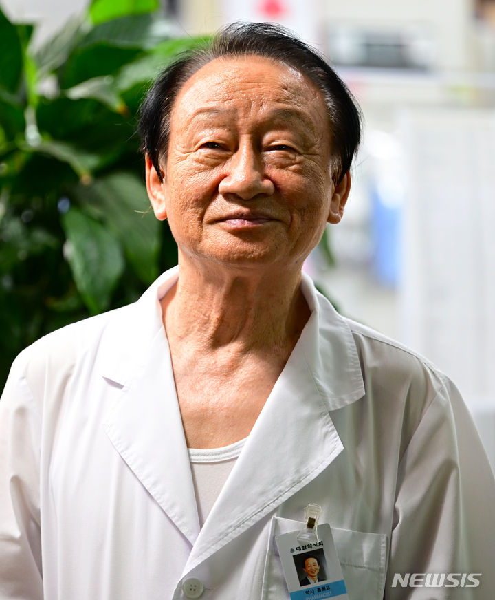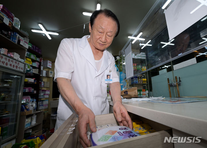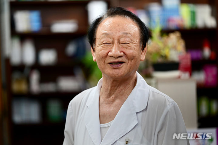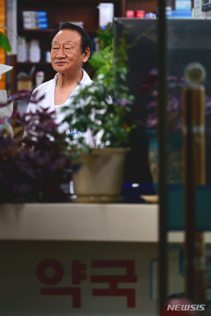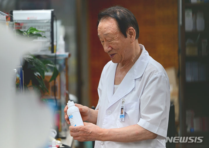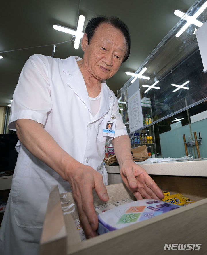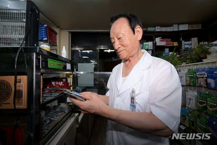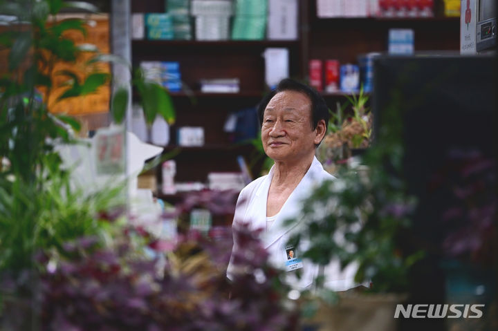 【NEWSIS】25日深夜、光州市東区で、49年間休みなしで深夜営業し、明かりをともし続けているテドン薬局。店主で薬剤師のホン・ウォンピョさん(74)が今日も笑顔で店番をしていた。