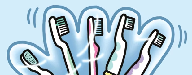 旅行の荷物をつめるとき、家族分の歯ブラシを使い捨てのビニール手袋に入れておくとすっきりする。指を入れる部分にそれぞれ歯ブラシを入れておけばよい。