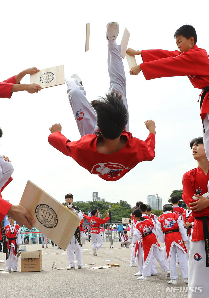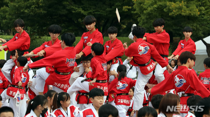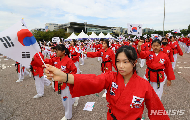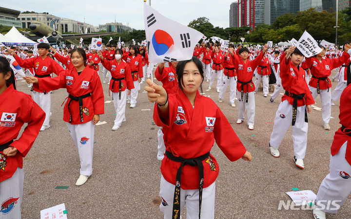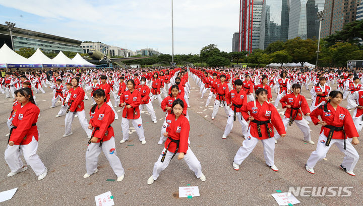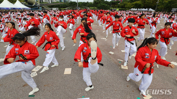 ソウルの汝矣島公園で3日、光復80周年に向けたコリアンドリーム1000万キャンペーンの一環として「2023コリアンドリーム統一実践フェスタ」が開かれ、1000人のテコンドー示範団が演武をしているところ。
