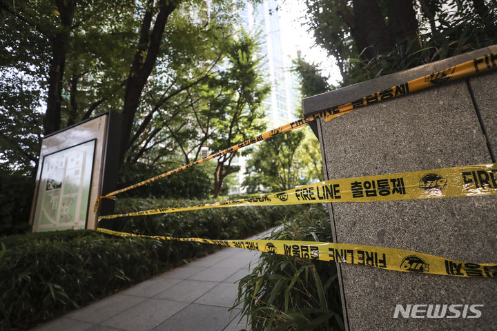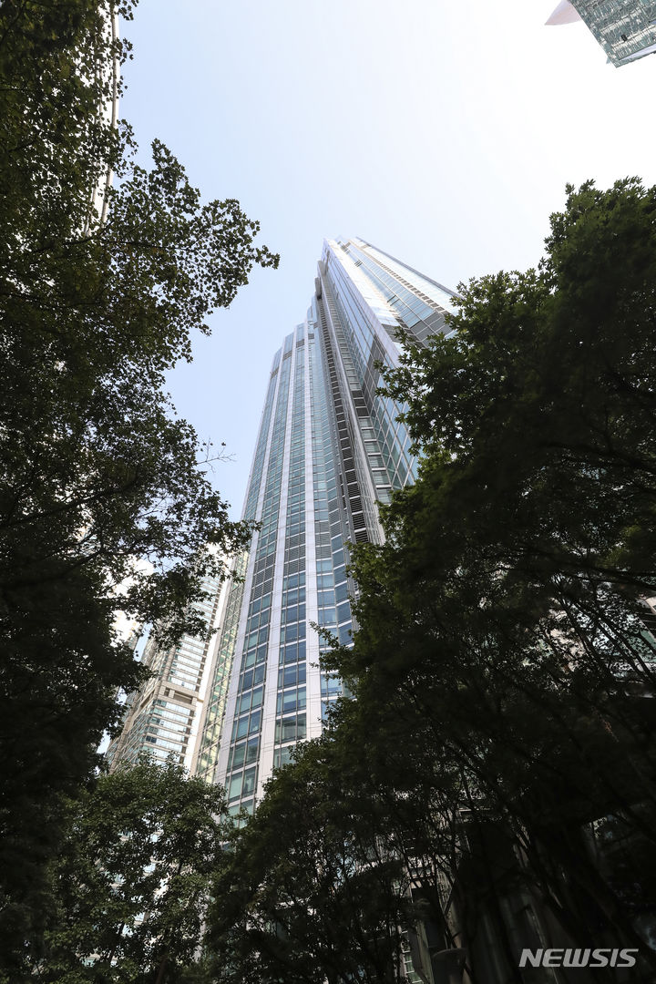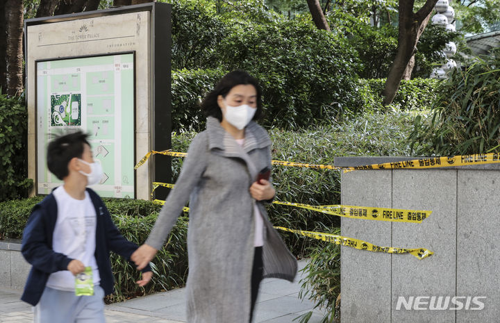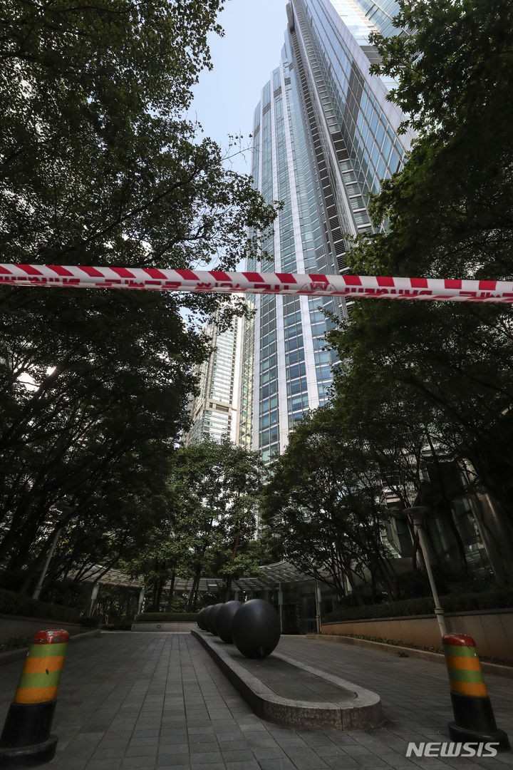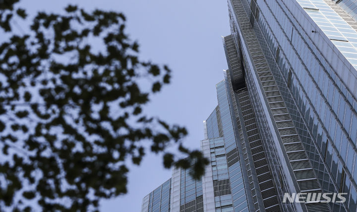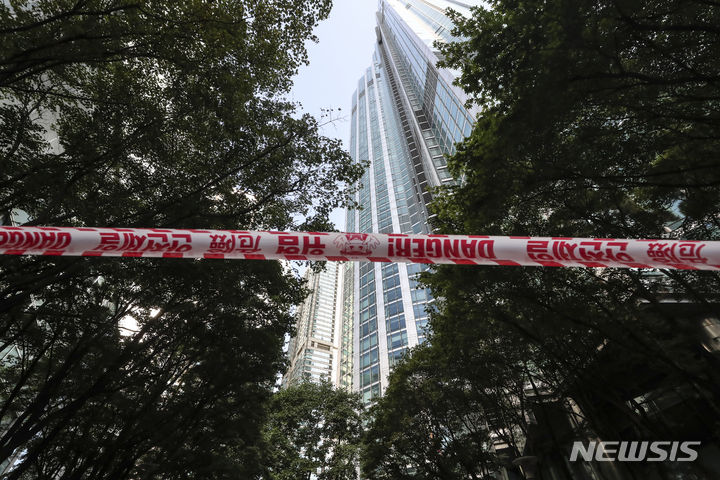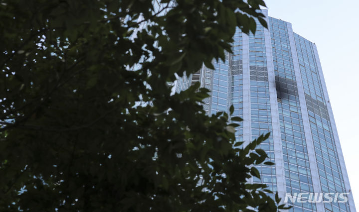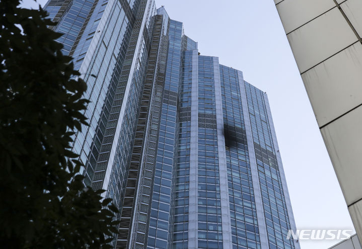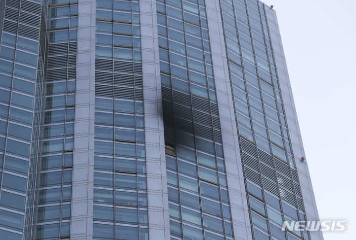 5日、ソウル市江南区道谷洞のタワーパレス53階で火災が発生し、同階の外壁の一部が黒くすすけている様子。ソウル江南消防署は、タワーパレス53階のエアコン室外機から火が出たものと推定され、負傷者および人命被害なく鎮火したと発表した。