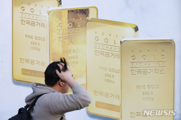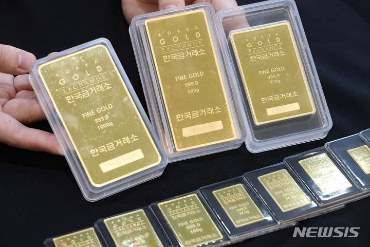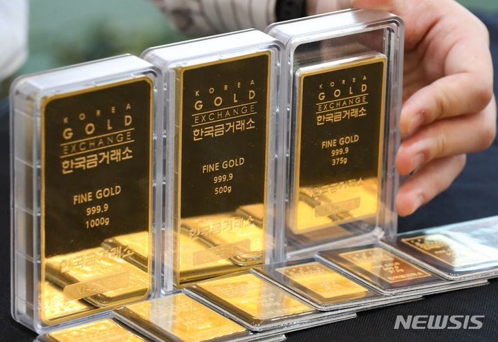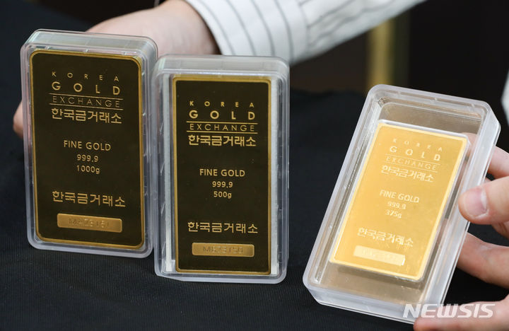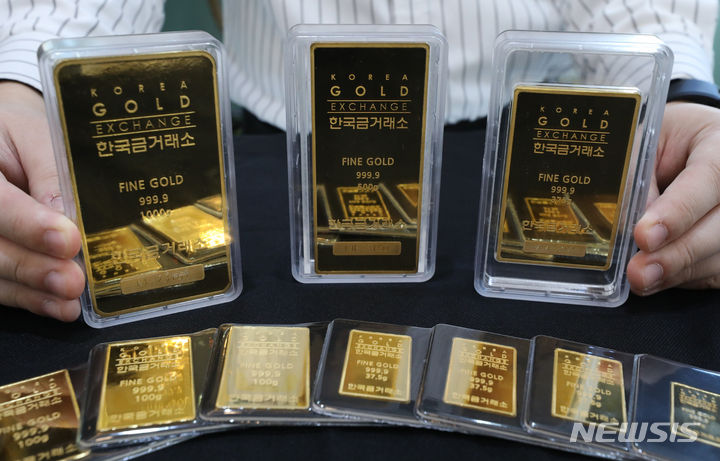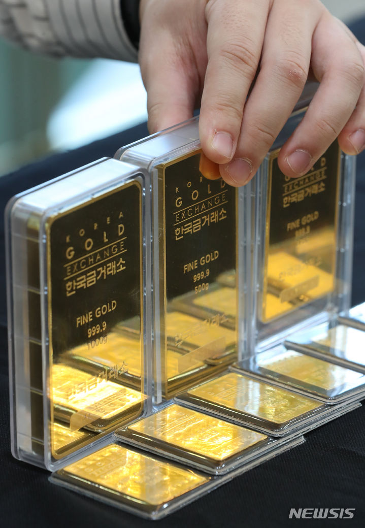 金の価格が8取引日連続で下落し、今年3月以降では最安値を記録した。現地時間4日にウォールストリート・ジャーナルが伝えたところによると、1カ月物の金先物契約は前日より0.3%低い1オンスあたり1818.50ドルで、今年3月以来の最安値を記録した。金価格の下落は、このところ金利が上がっている国債に投資家らの関心が集まったからだと解釈されている。写真は5日午後、ソウル市鍾路区の韓国金取引所に陳列されているゴールドバーの様子。
