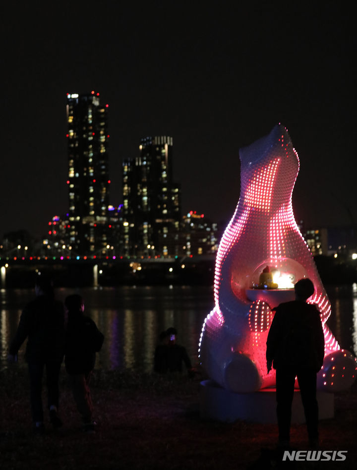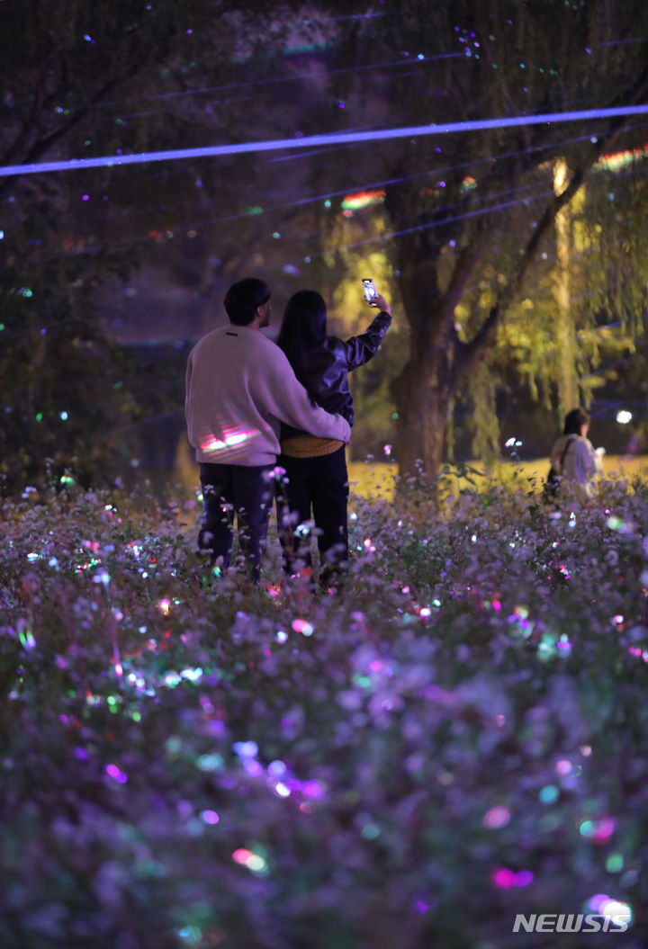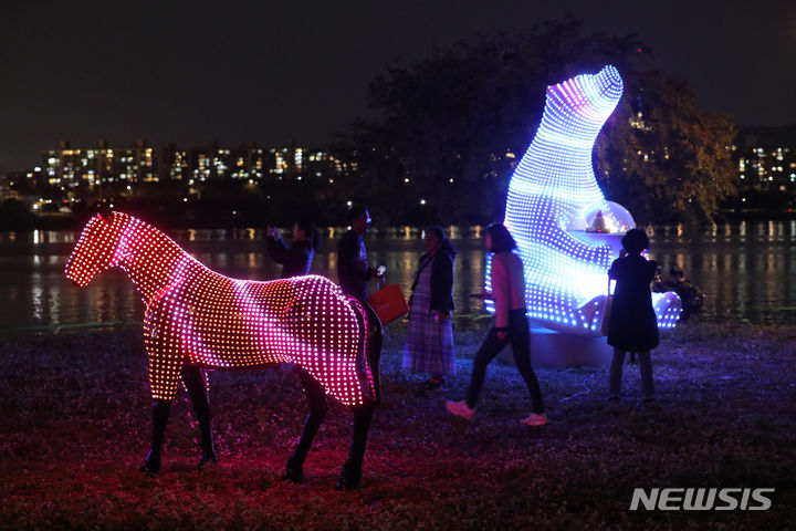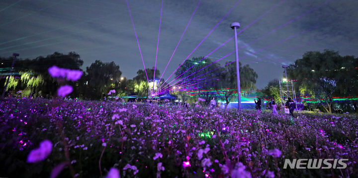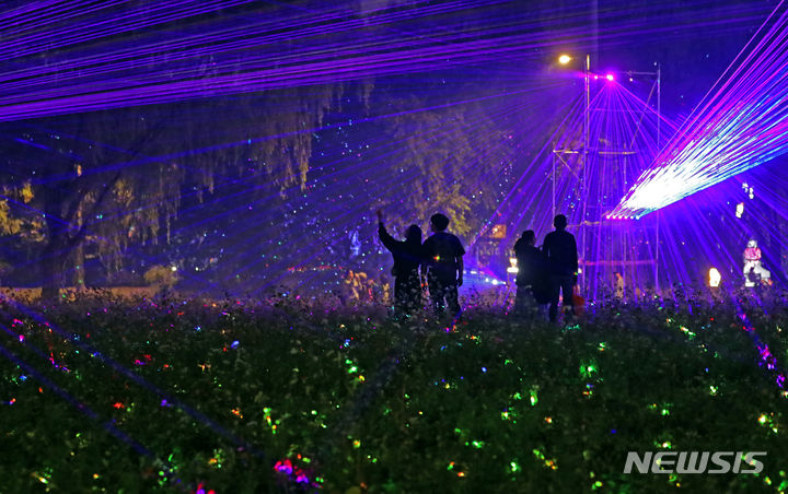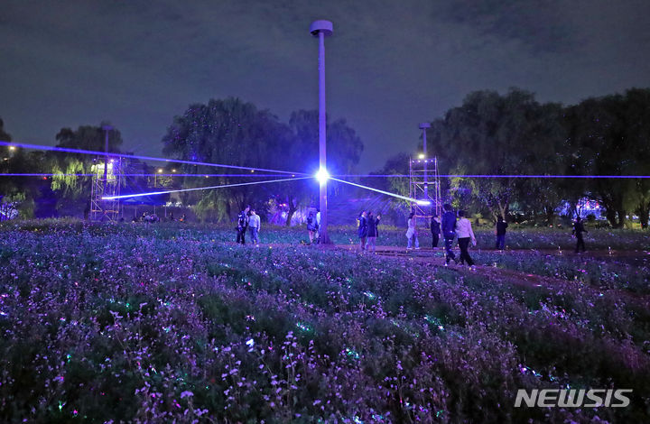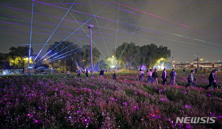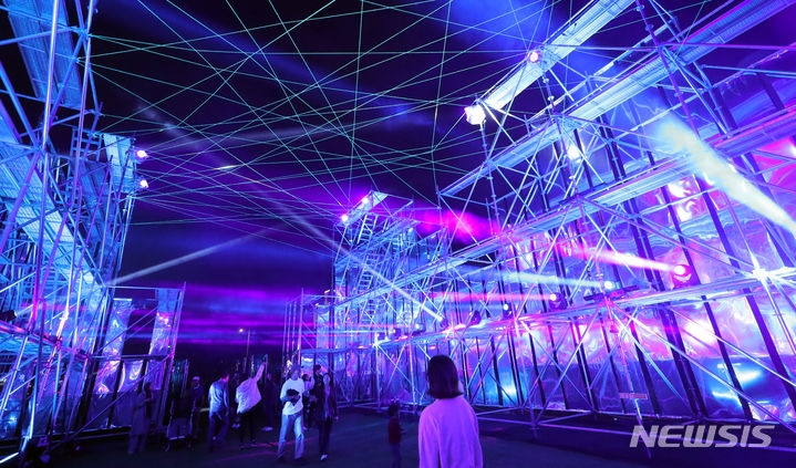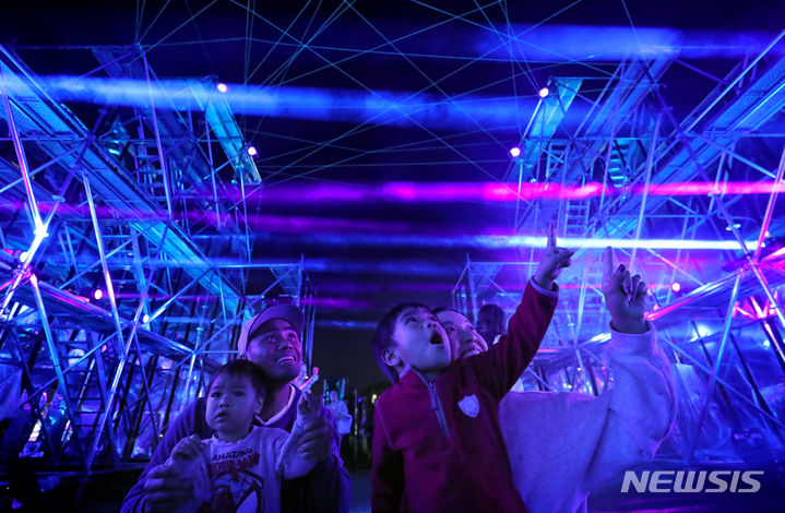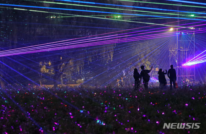 6日午後、ソウル市内の盤浦漢江公園ソレ島一帯で開催された「ソウル・ライト漢江光の島フェスティバル」を訪れた市民たちが、レーザー・アート展示を見て回った。