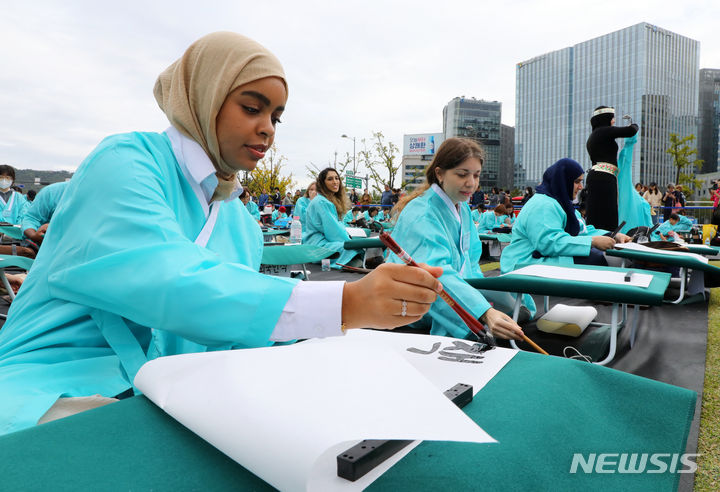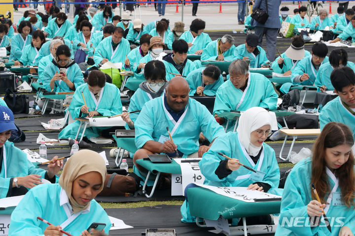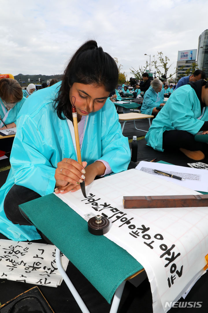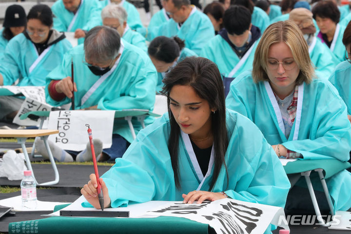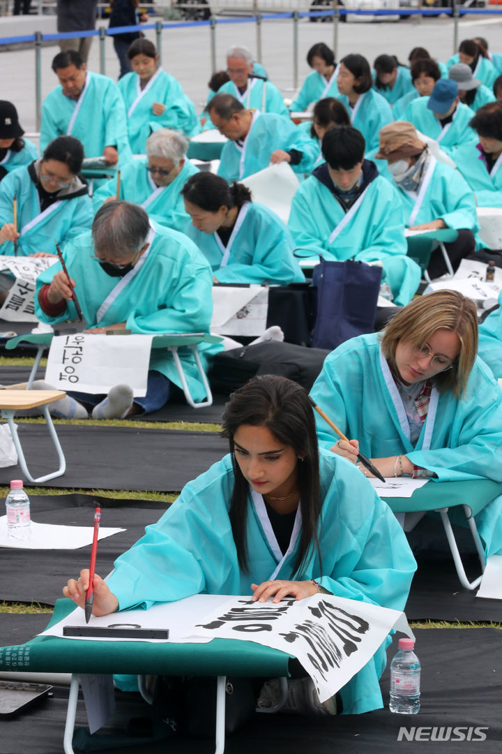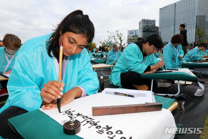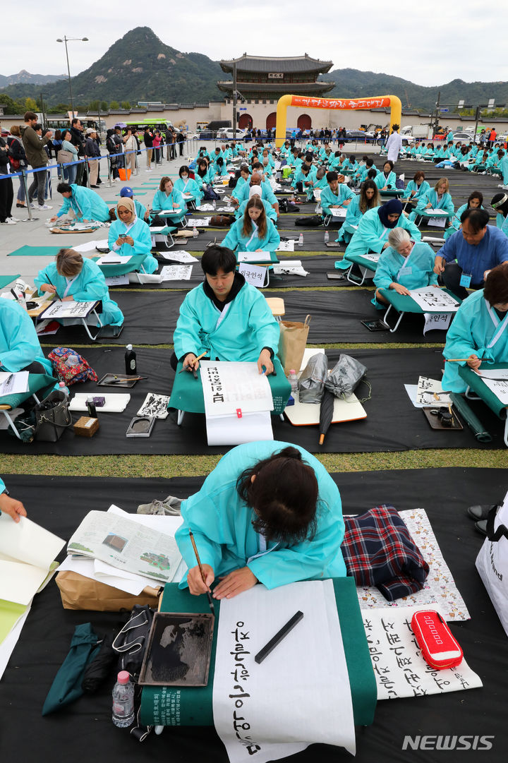 ハングルの日を迎えた9日午前、ソウル市鍾路区の光化門広場で「光化門広場揮毫大会」が行われ、外国人参加者たちが腕前を披露した。