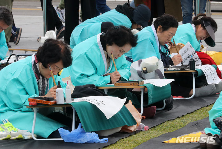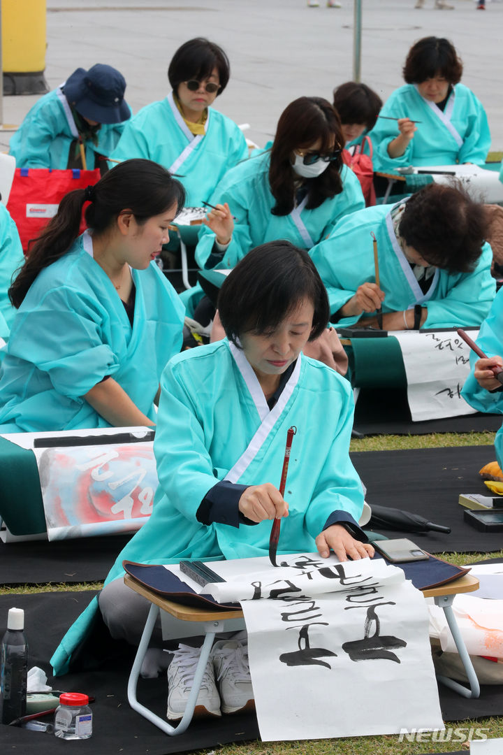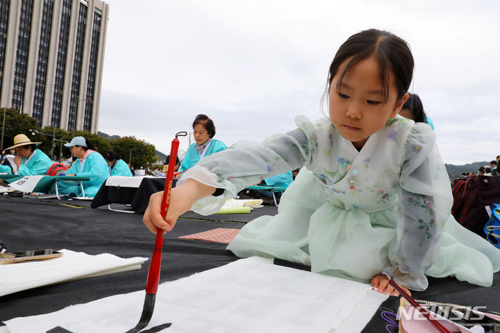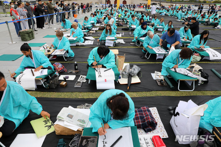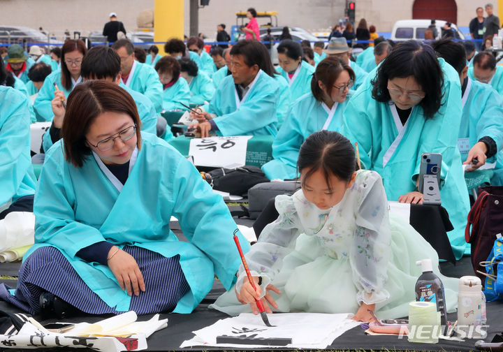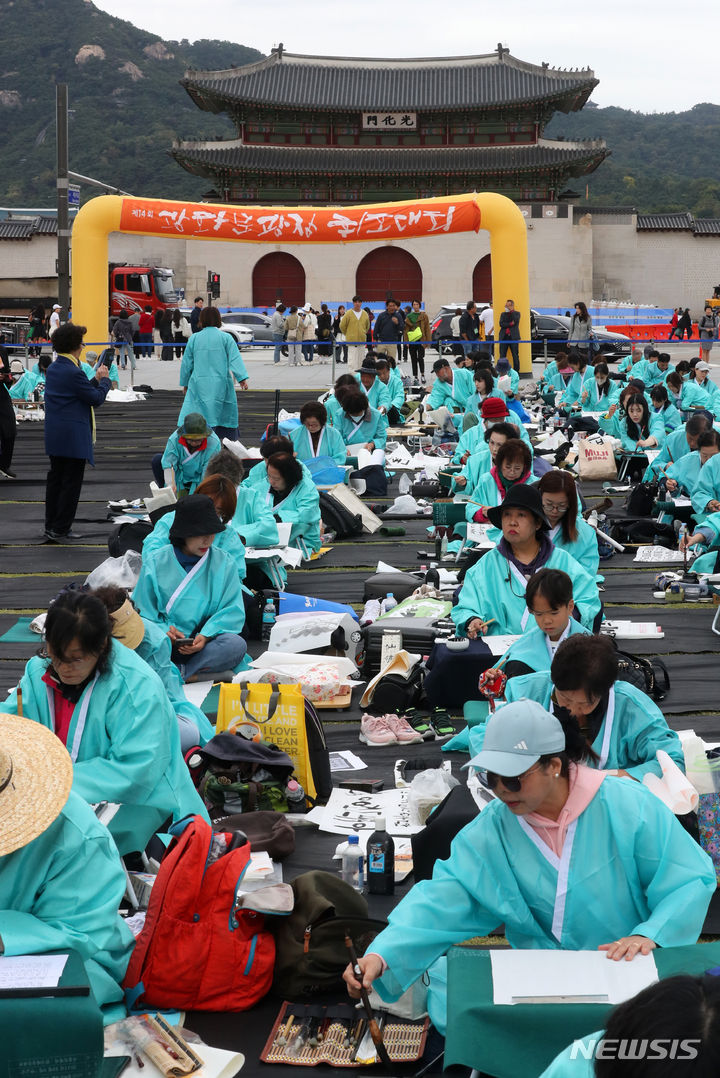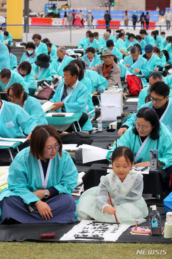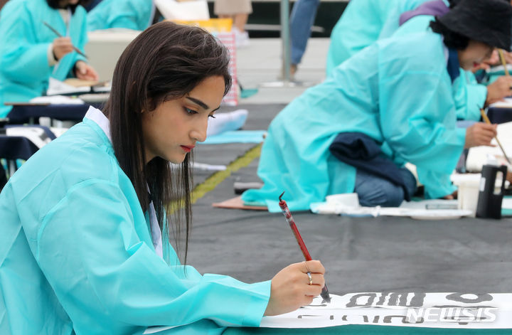 ハングルの日を迎えた9日午前、ソウル市鍾路区の光化門広場で「光化門広場揮毫大会」が行われ、外国人参加者たちが腕前を披露した。