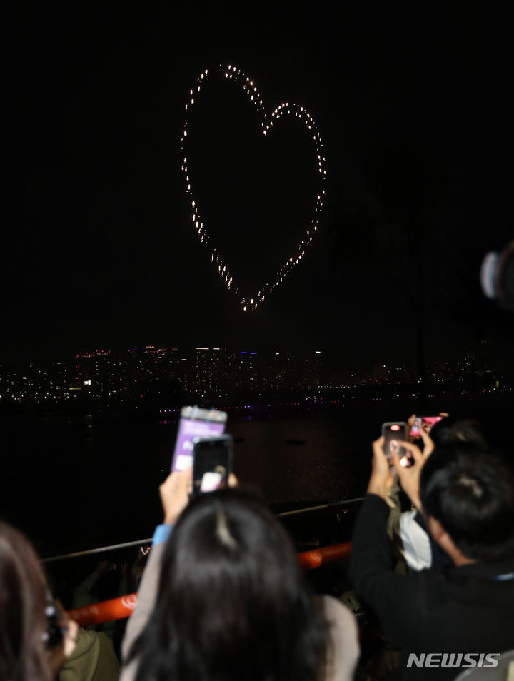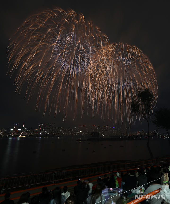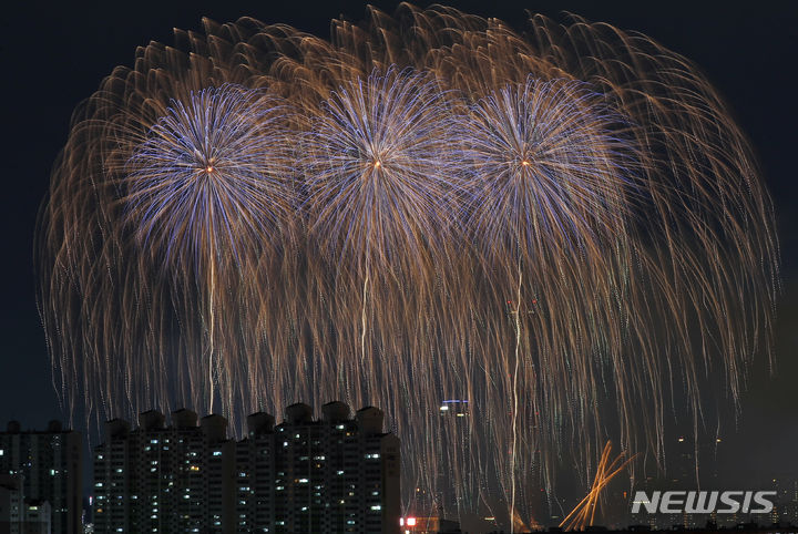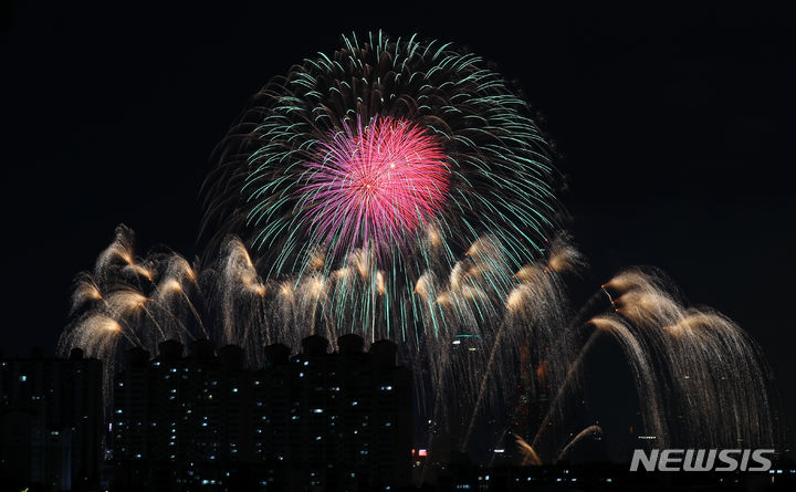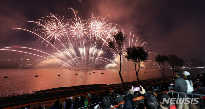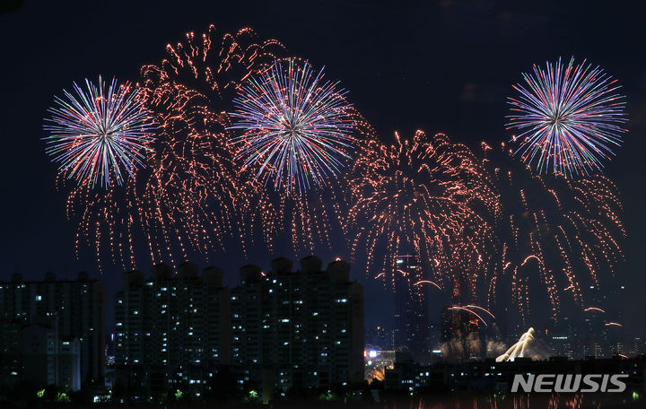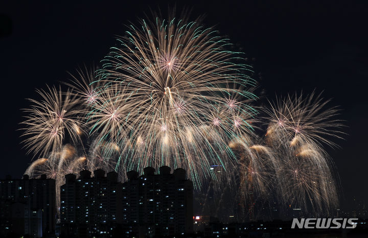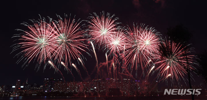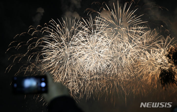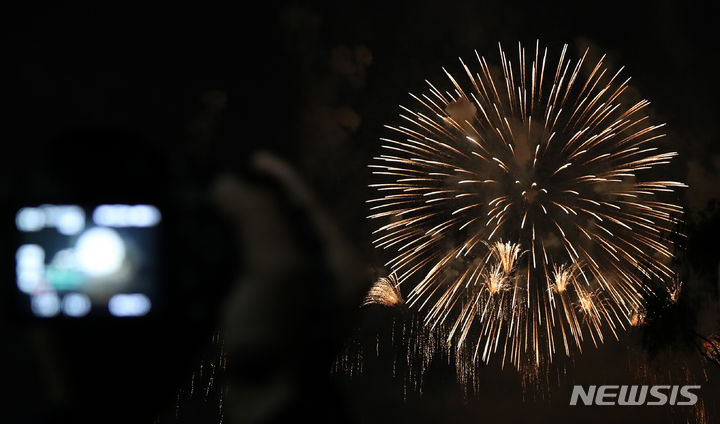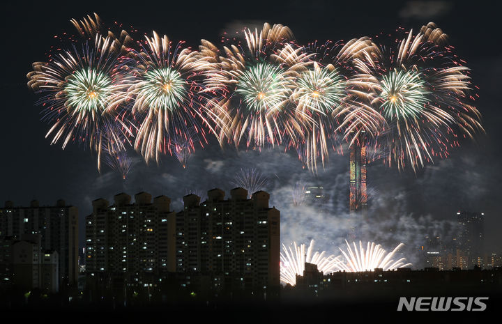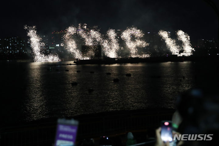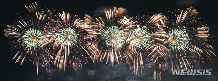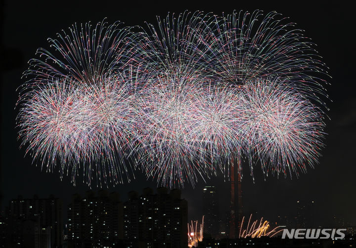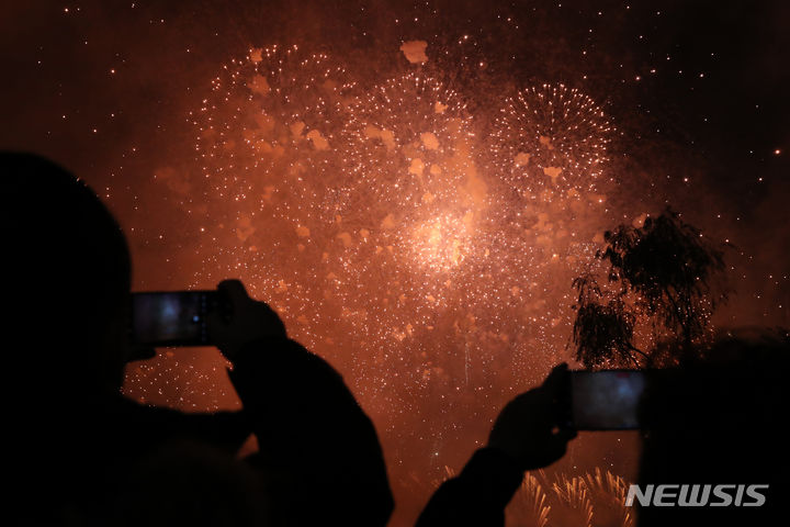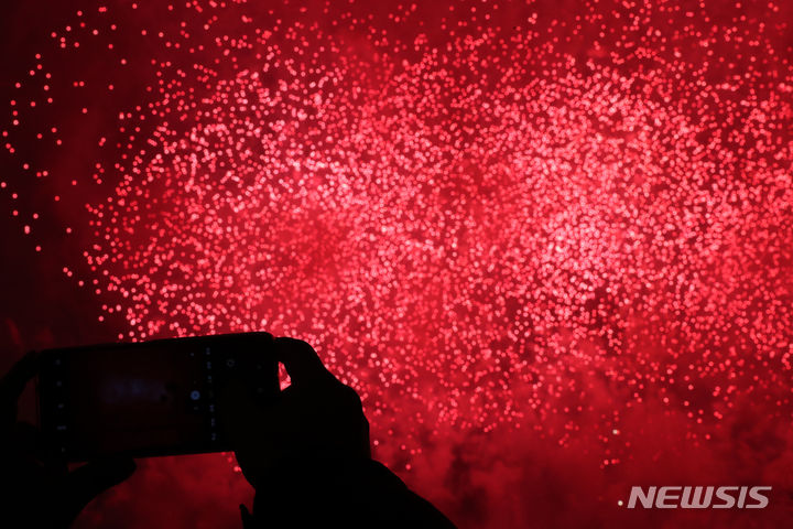 7日午後、ソウルの汝矣島漢江公園一帯で開かれた「2023ソウル世界花火祭り」にて、夜空を彩る中国チームの花火の様子。