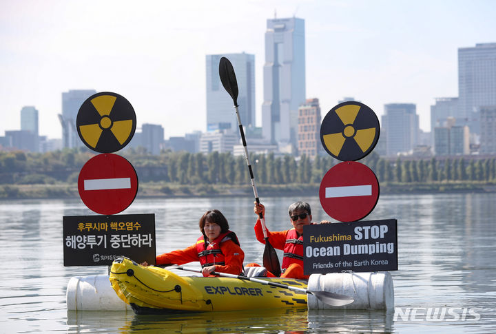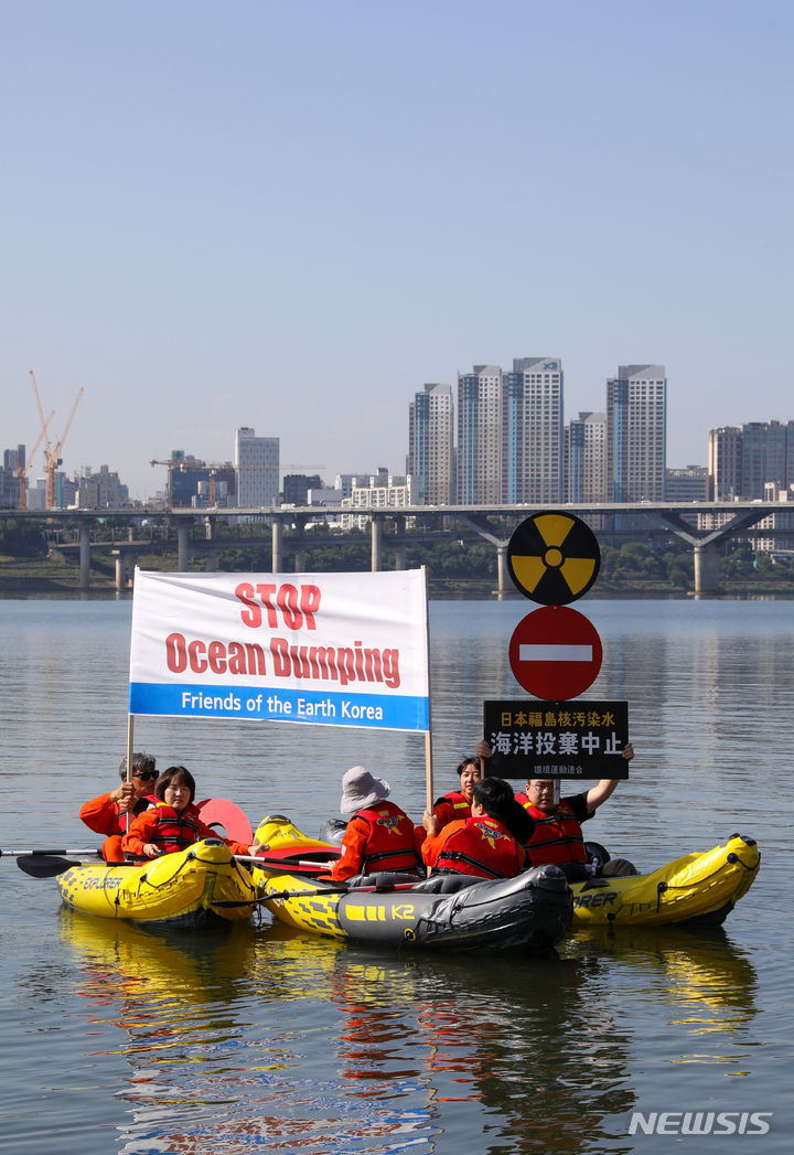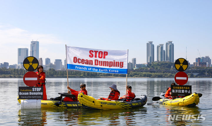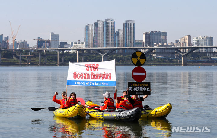 環境保健市民センターやソウル環境運動連合など環境団体のメンバーたちが11日午前、ソウル市広津区のトゥクソム近くの漢江で「福島原発汚染水の海洋投棄反対漢江水中アクション」を実施した。