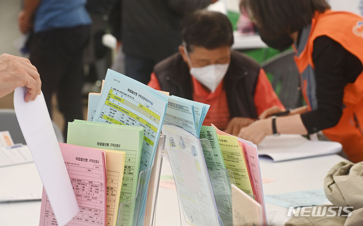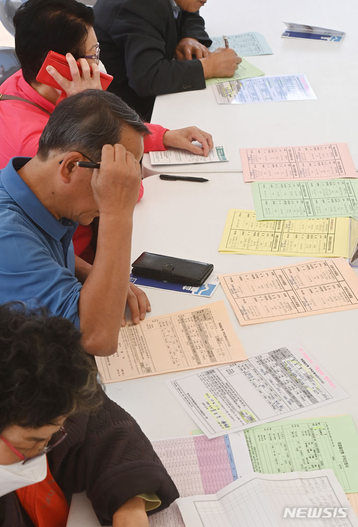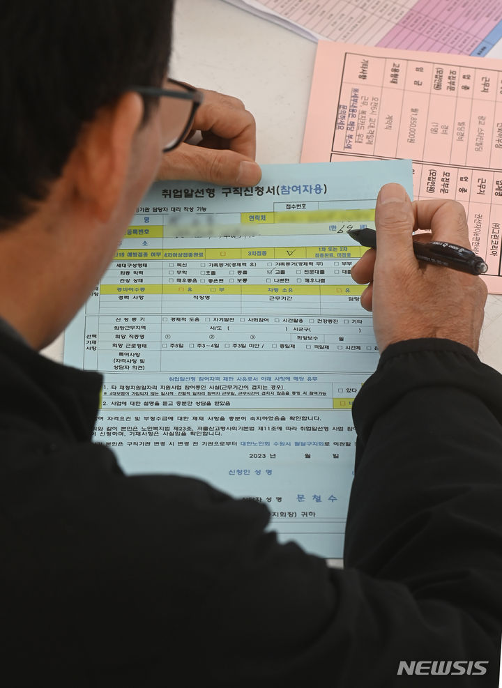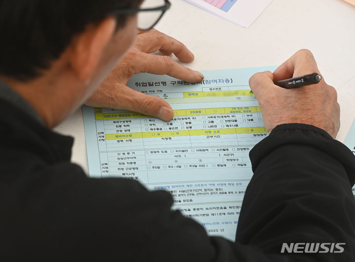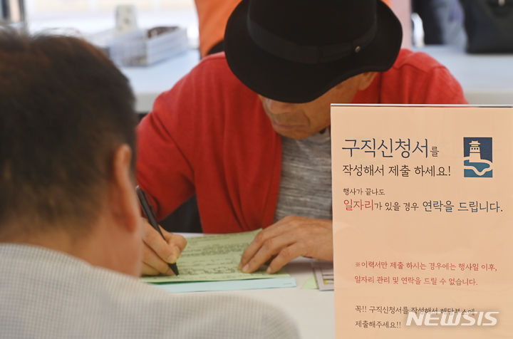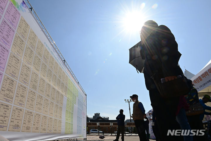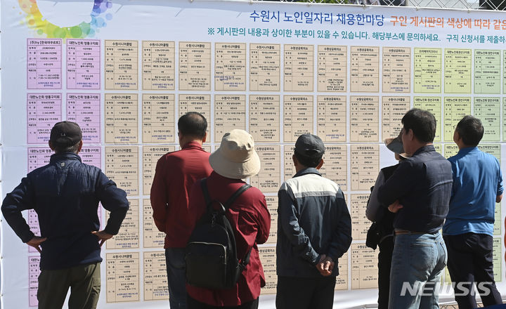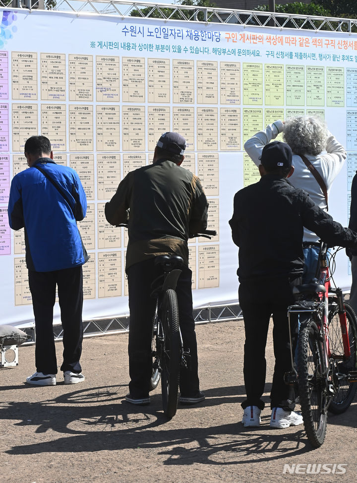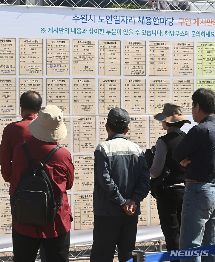 11日、京畿道水原市八達区の華城行宮広場で開かれた「老人しごと採用ハンマダン」を訪れた高齢者らが、就職情報掲示板の内容を確かめている様子。