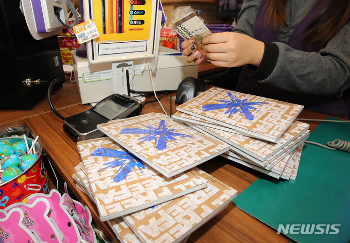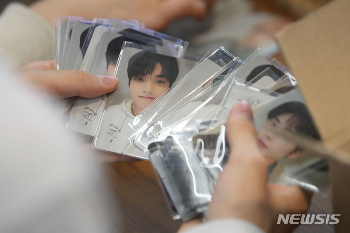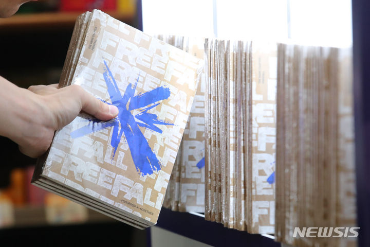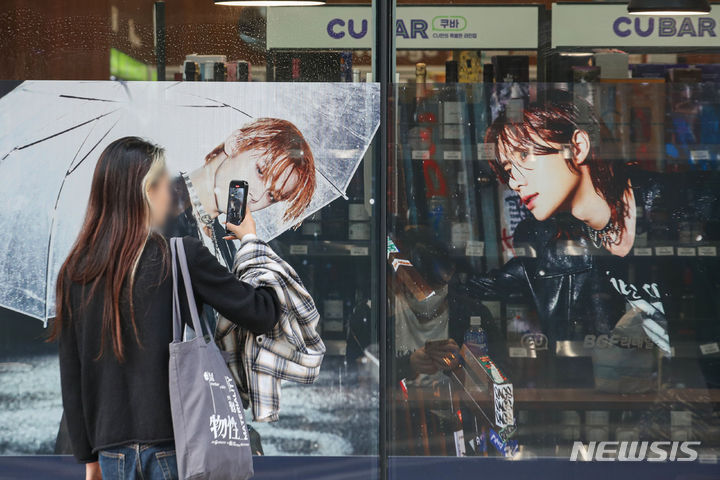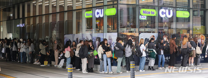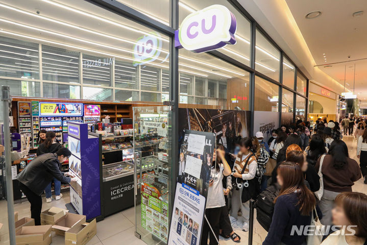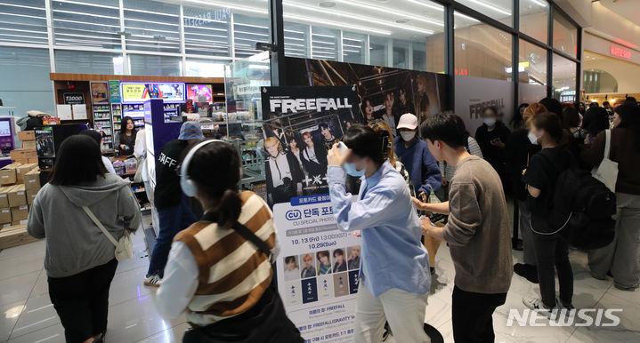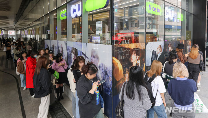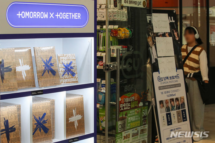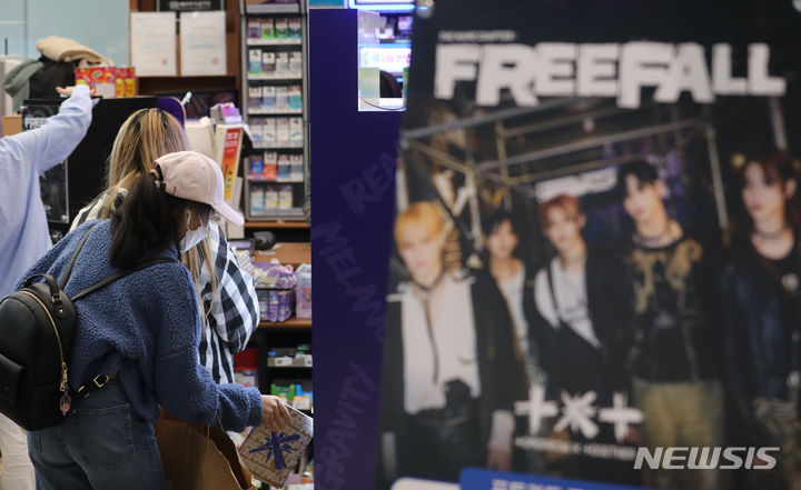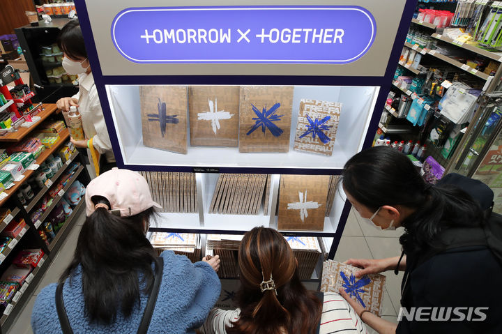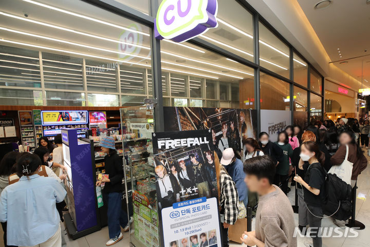 ソウル市麻浦区のコンビニ「CU AK&弘大店」で13日午後、ボーイズグループTOMORROW X TOGETHERの3rdフルアルバムを買うため並んで待っている人々の様子。