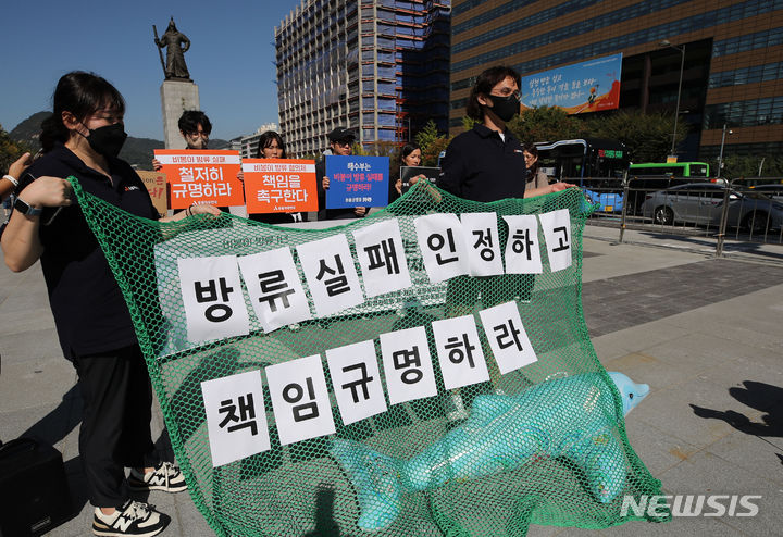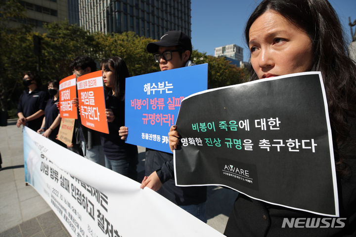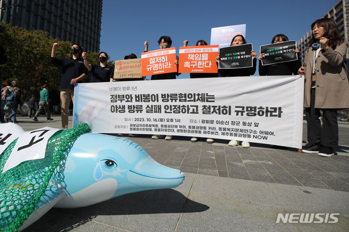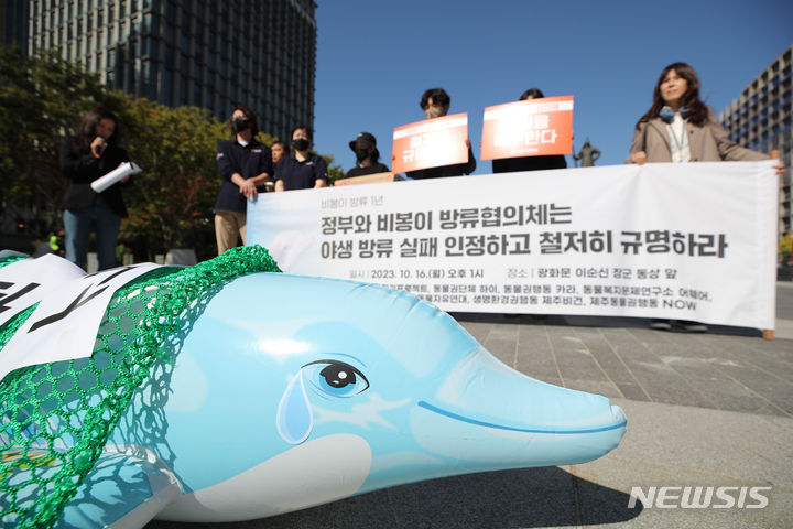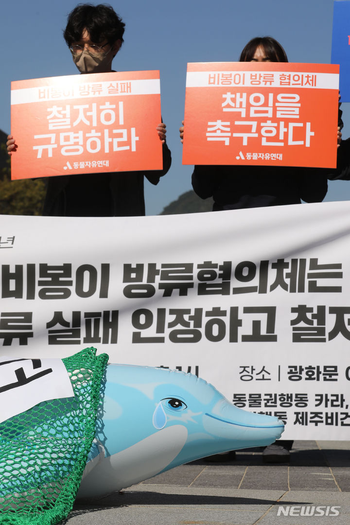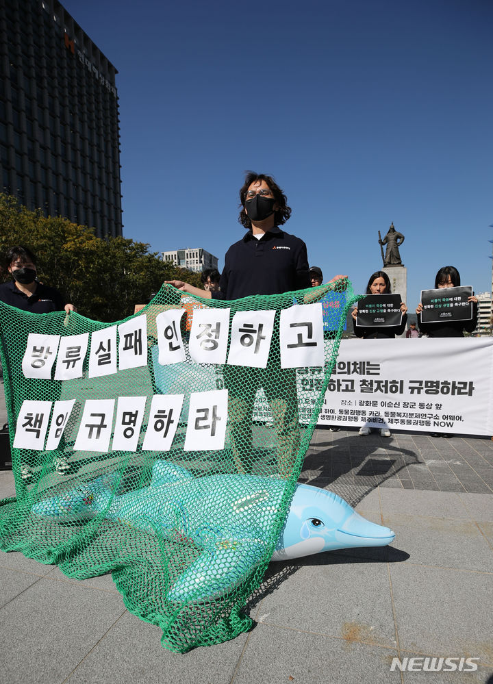 動物自由連帯をはじめとする動物権擁護団体のメンバーらが16日午後、ソウル市鍾路区の光化門広場で、ミナミバンドウイルカ「ピボン」の放流失敗に伴う責任究明を求める記者会見を開いた。
