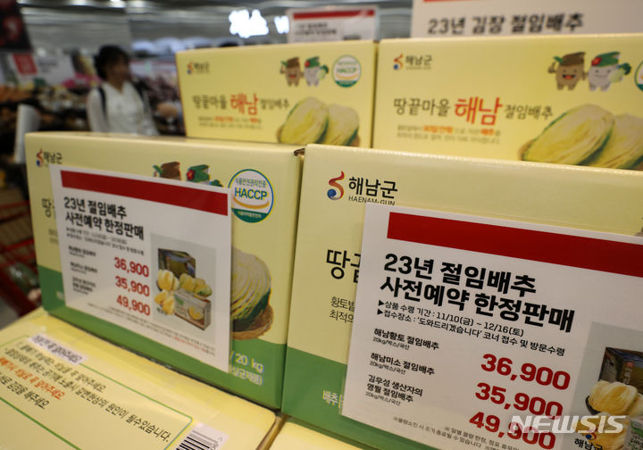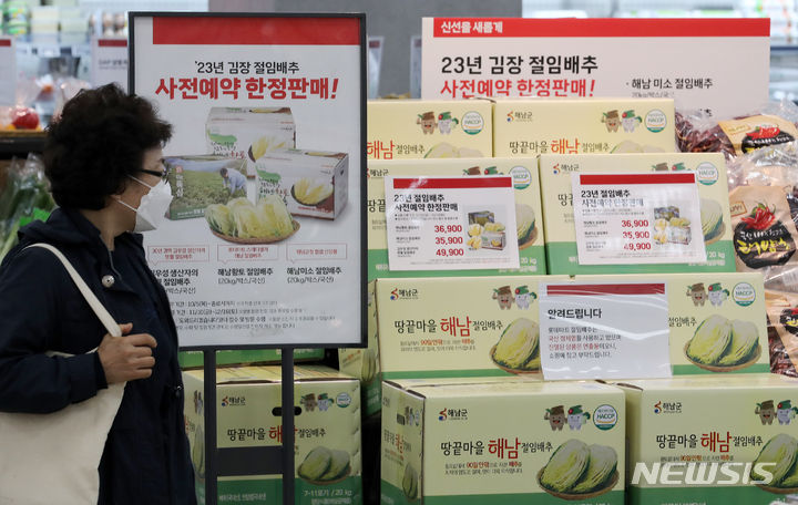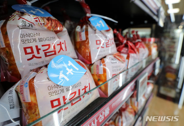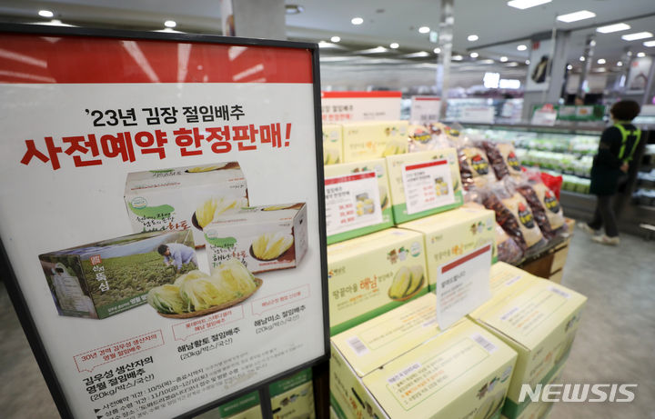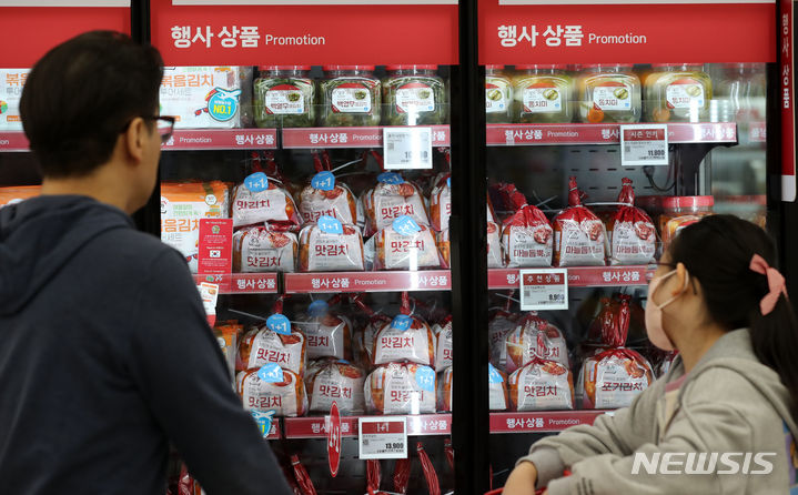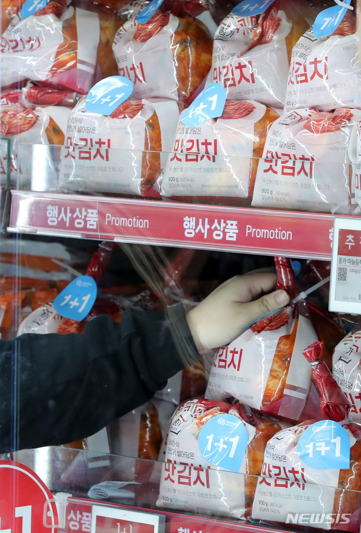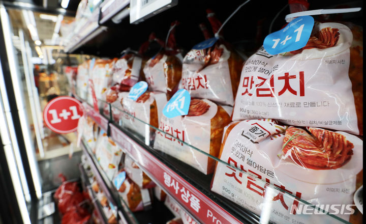 冬場に向けたキムチの漬け込み(キムジャン)を前に、ハクサイだけでなく塩やトウガラシなど副材料の価格まで次々と上昇していることから、自前のキムジャンをあきらめて密封包装のキムチを買って食べる、いわゆる「キムポ族」が増える見込みだ。写真は16日午前、ソウル市内のある大手スーパーに並ぶ密封包装キムチの様子。
