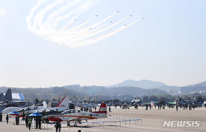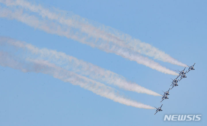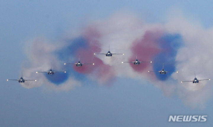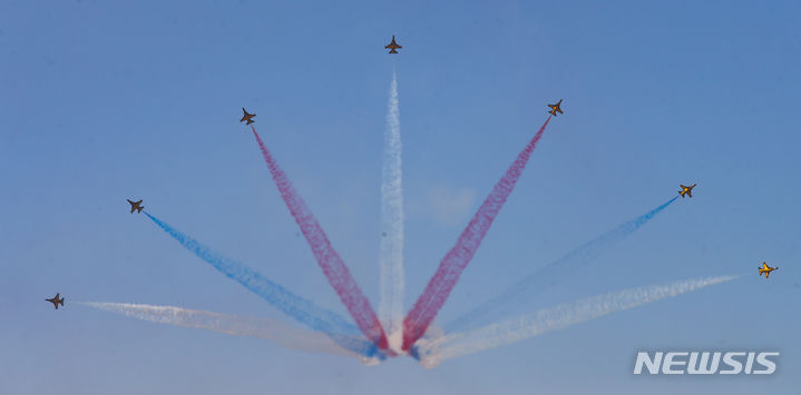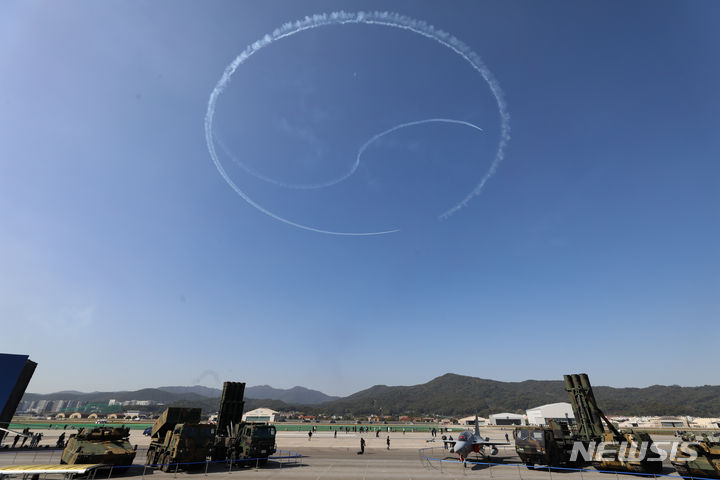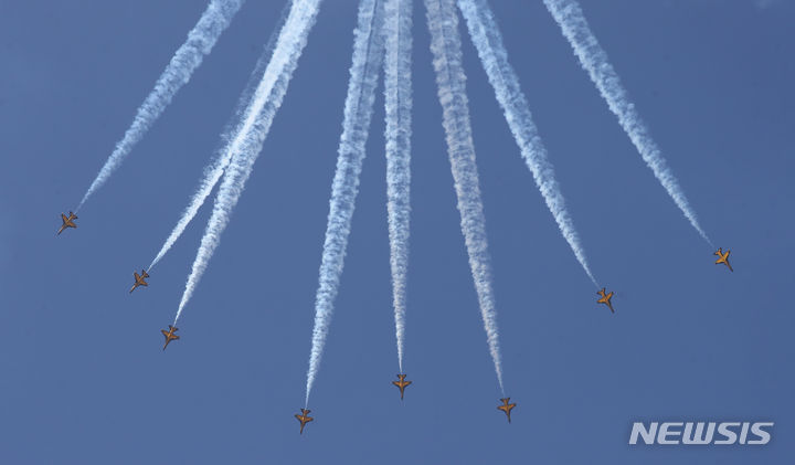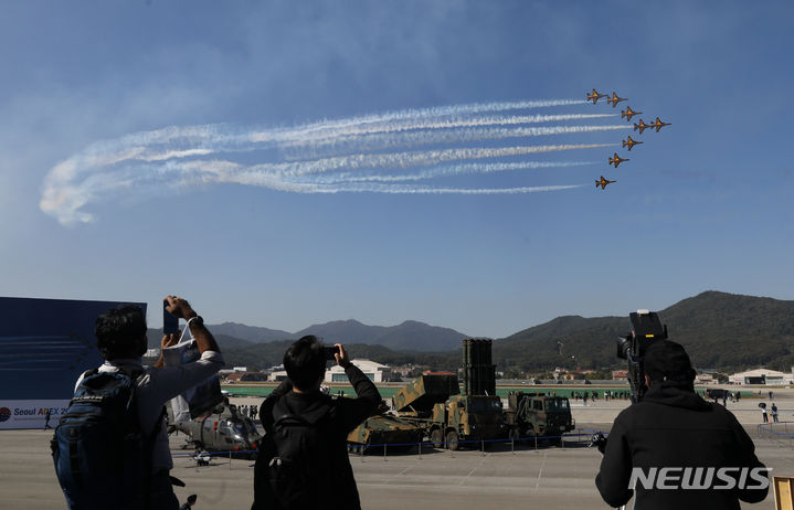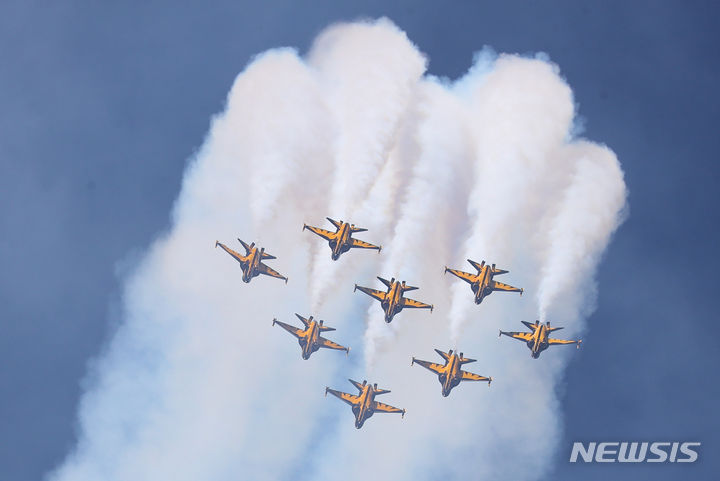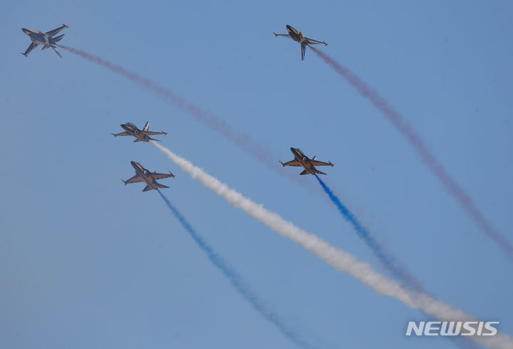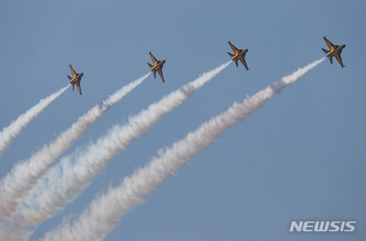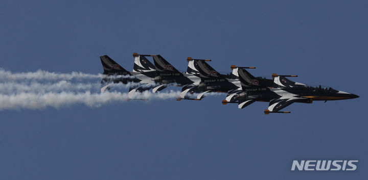 16日、京畿道城南市のソウル空港で開かれた韓国最大の航空宇宙・防衛産業展示会「ソウル・アデックス(ADEX)2023」のプレスデーにて、華麗なエアショーを披露する韓国空軍ブラックイーグルス。