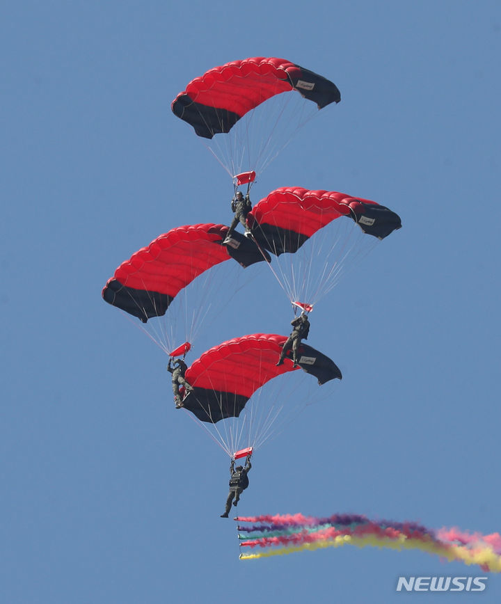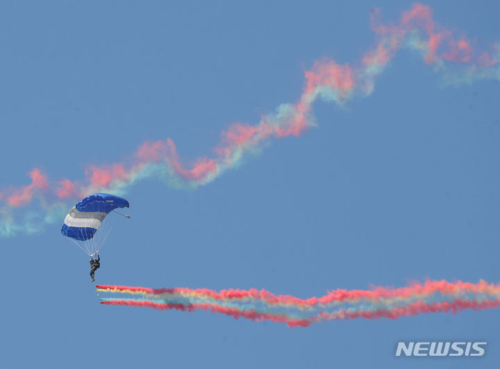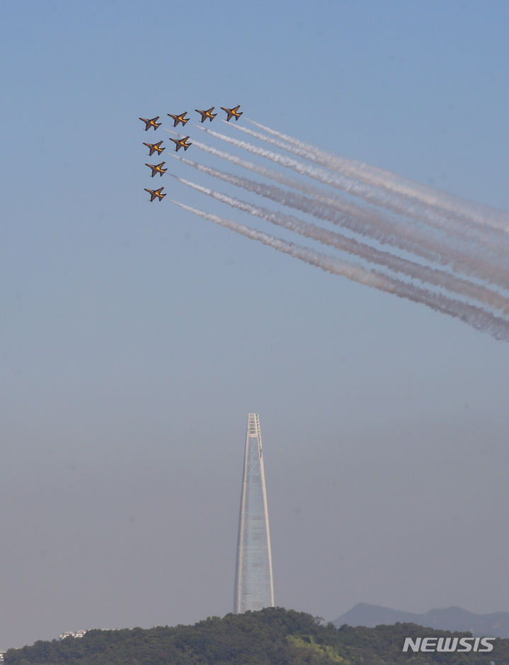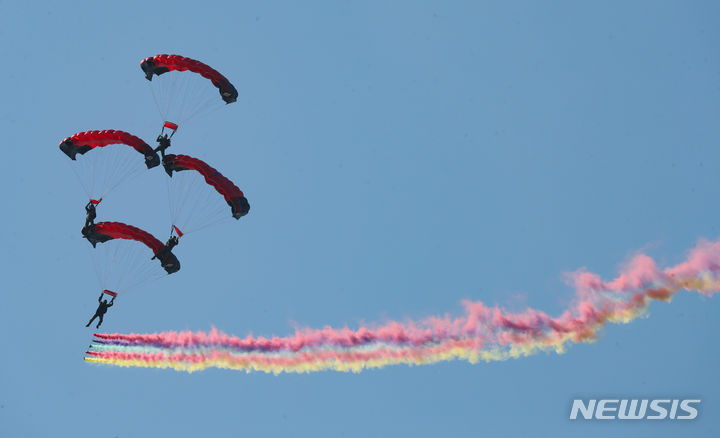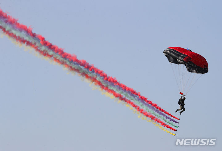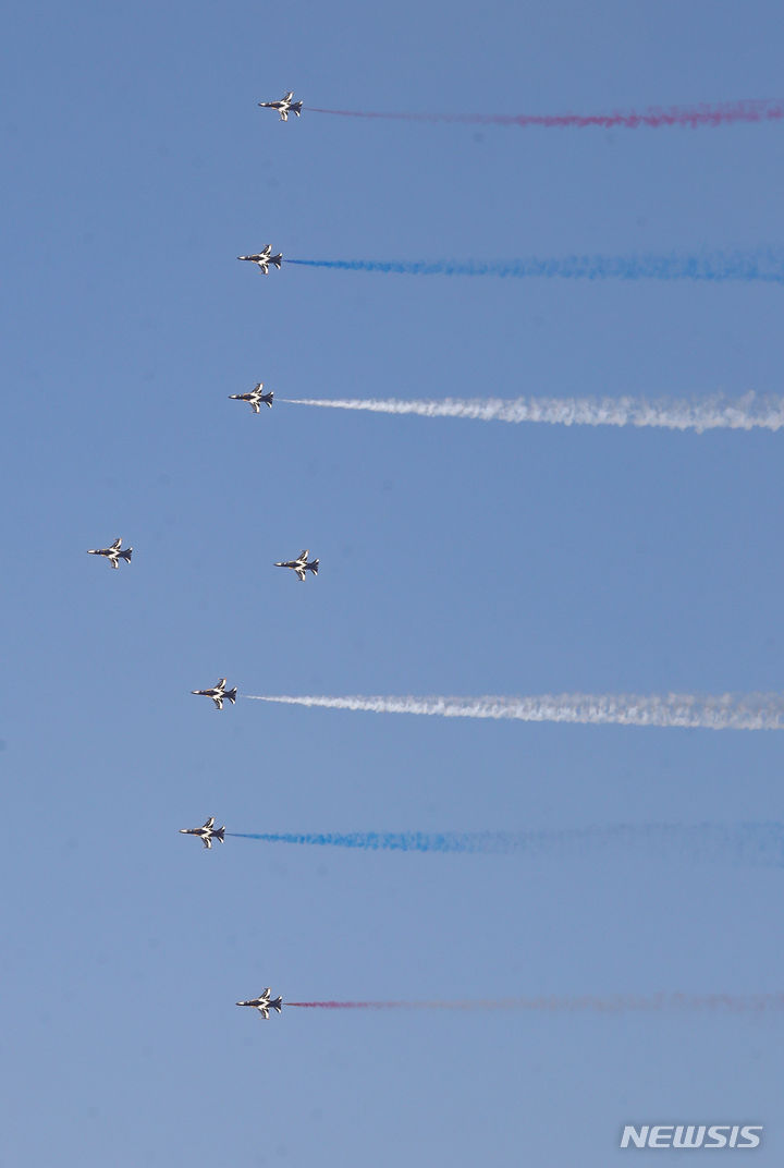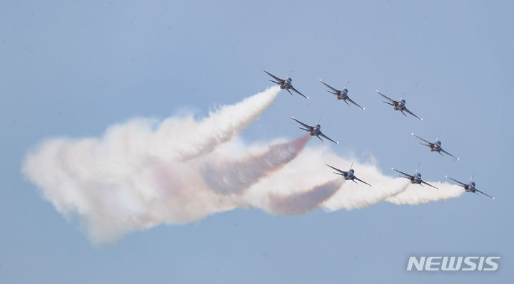 16日、京畿道城南市のソウル空港で開かれた韓国最大の航空宇宙・防衛産業展示会「ソウル・アデックス(ADEX)2023」のプレスデーにて、華麗なエアショーを披露する韓国空軍ブラックイーグルス。