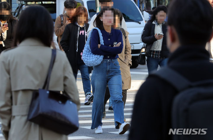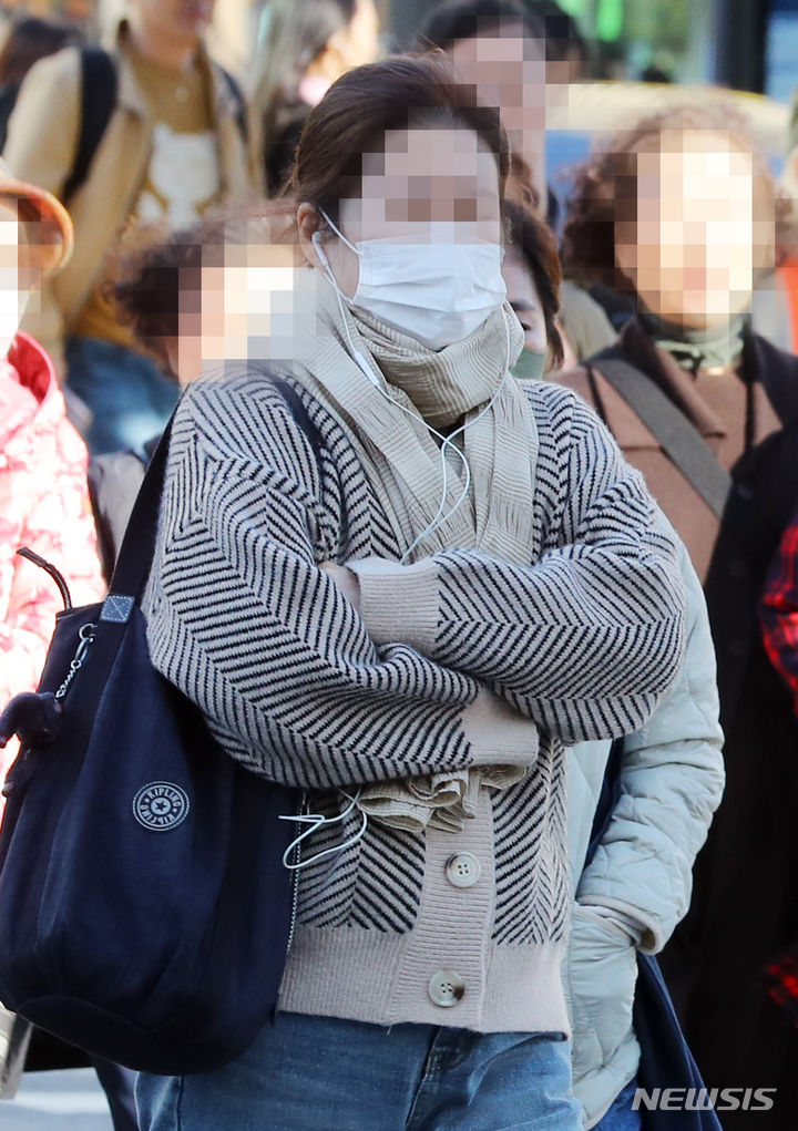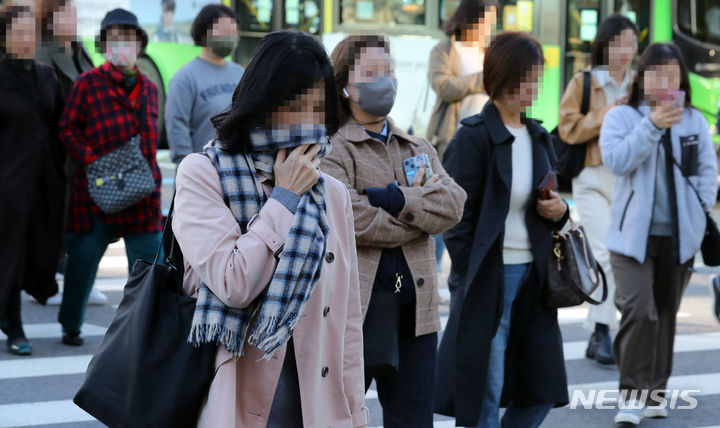 【NEWSIS】ソウル市内の朝の最低気温が10℃を下回った20日、ソウル・光化門交差点で、体を丸めて出勤する人々。