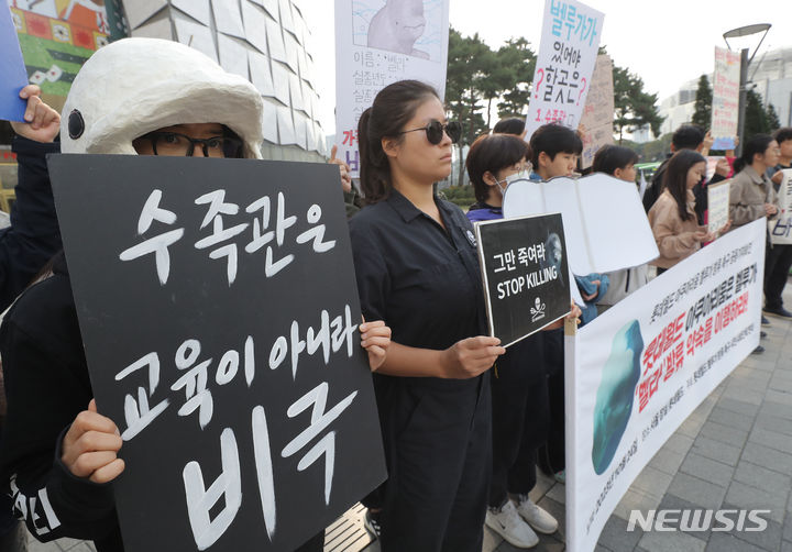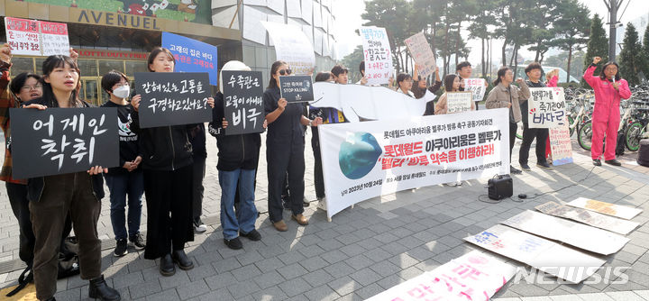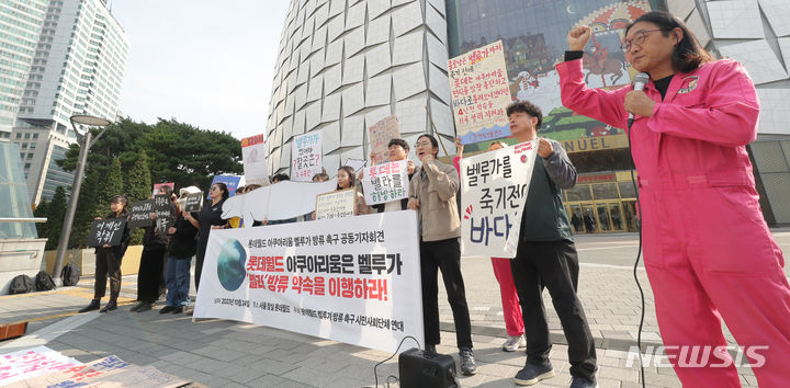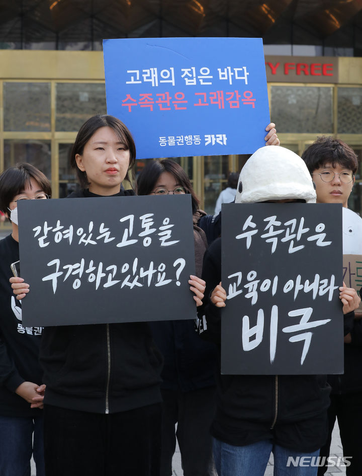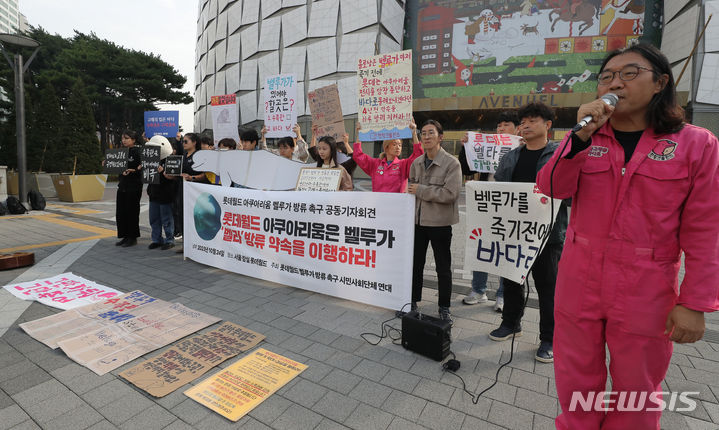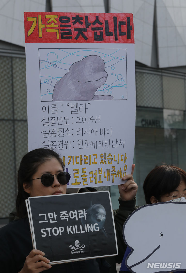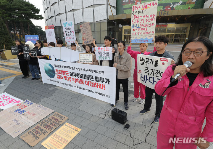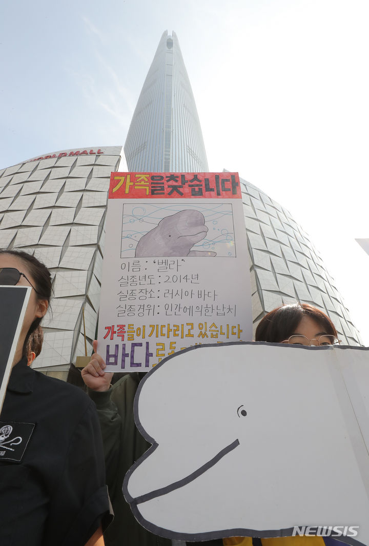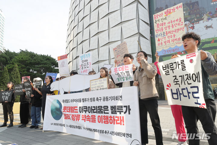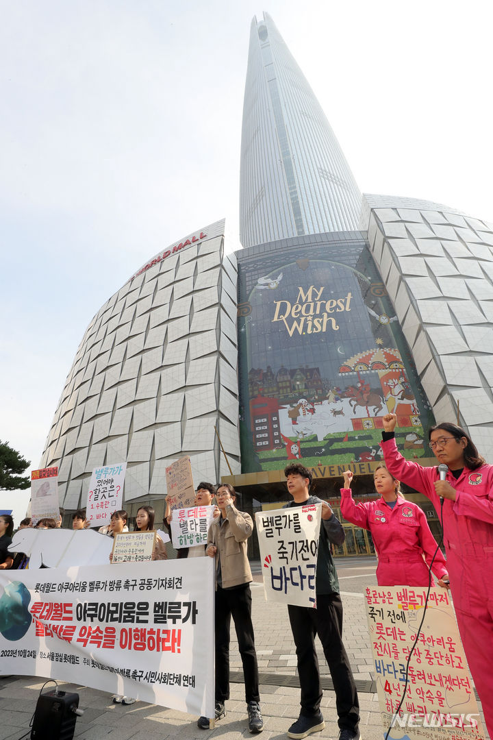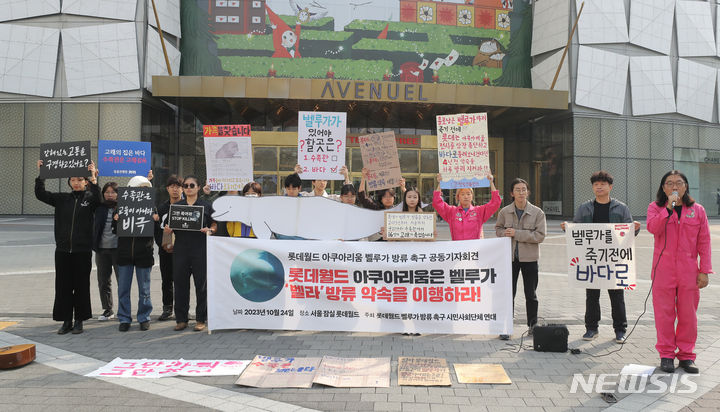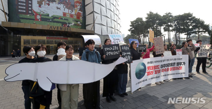 ロッテワールドのベルーガ(シロイルカ)の放流を求める市民団体のメンバーが24日午前、ソウル市松坡区のロッテワールドタワー前で「ロッテワールド・アクアリウムのベルーガ放流促求共同記者会見」を行っている。