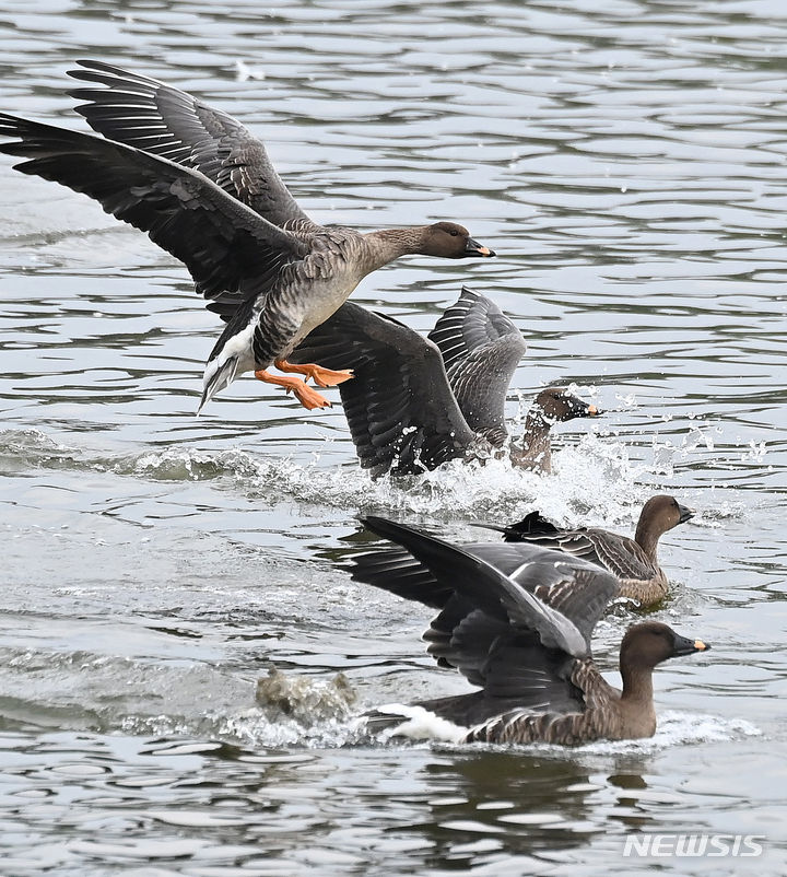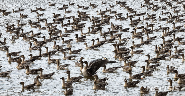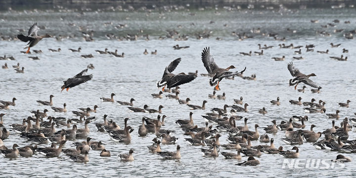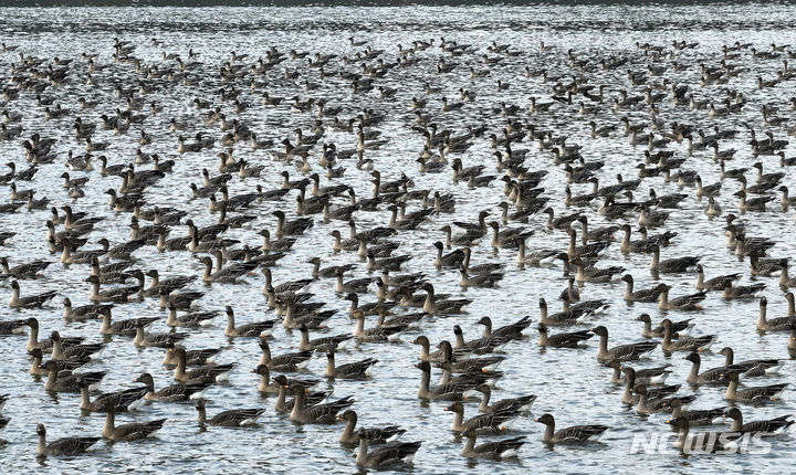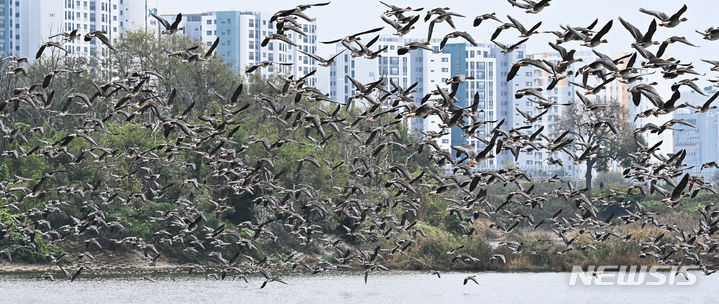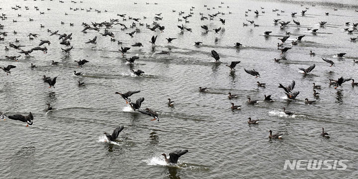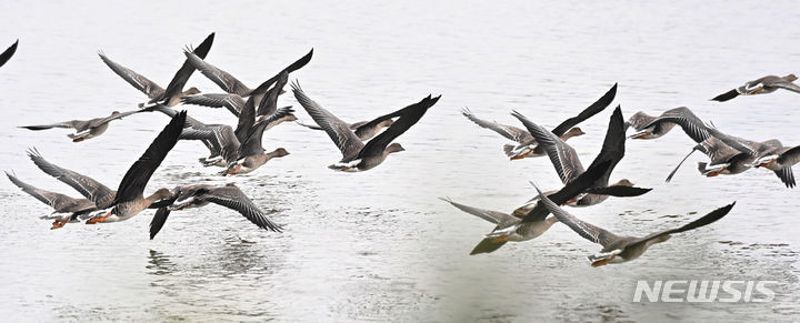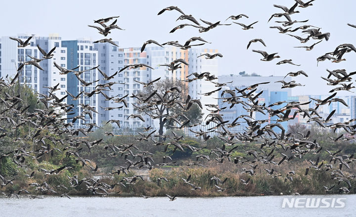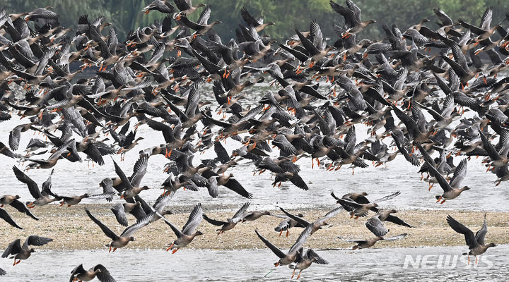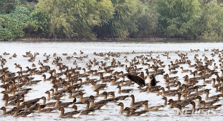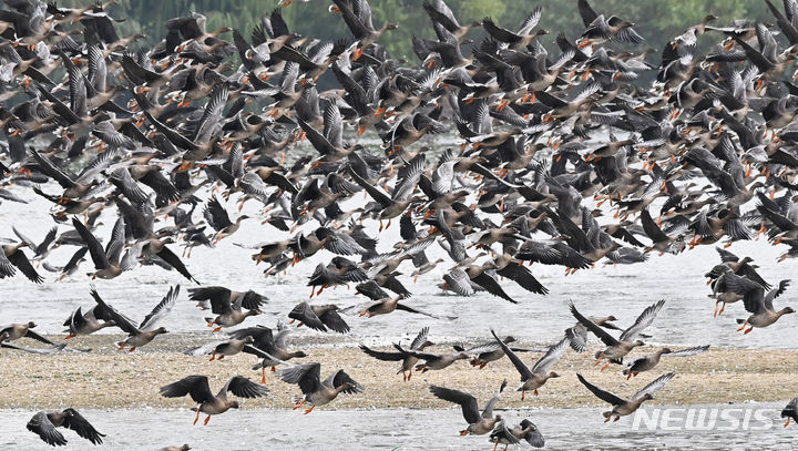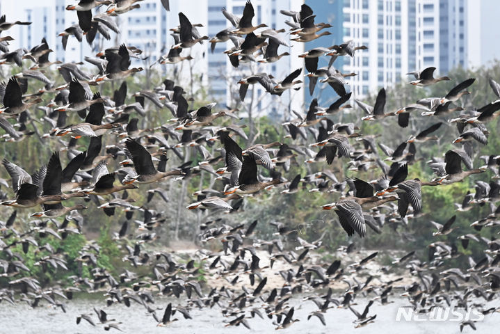 二十四節気の一つ「霜降」に当たる24日、京畿道水原市八達区の西湖貯水池にやって来たヒシクイなど渡り鳥の群れが、力強く羽ばたいて飛び立っているところ。
