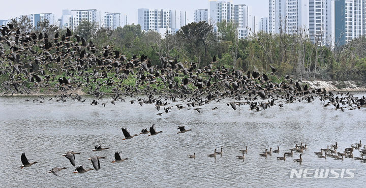 西湖貯水池を覆う渡り鳥の群れ =水原