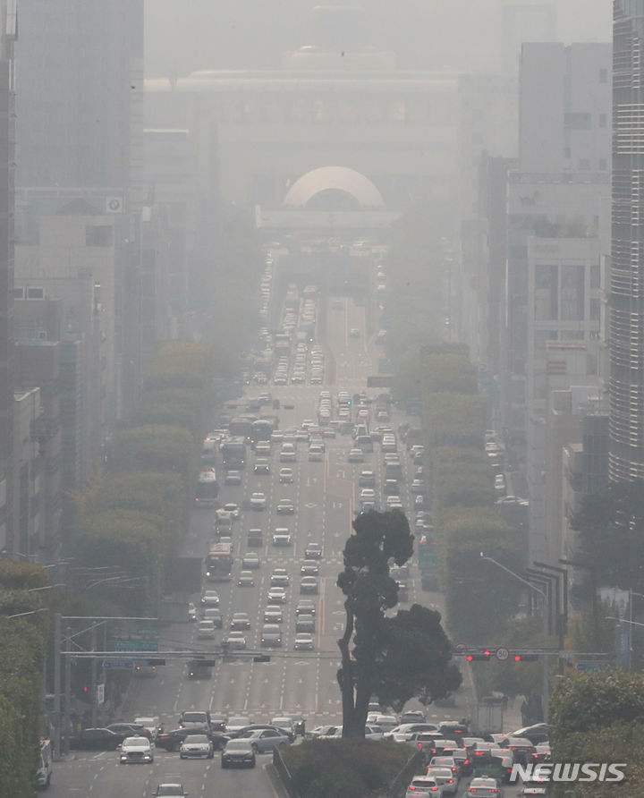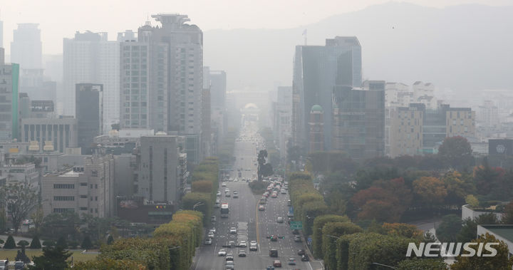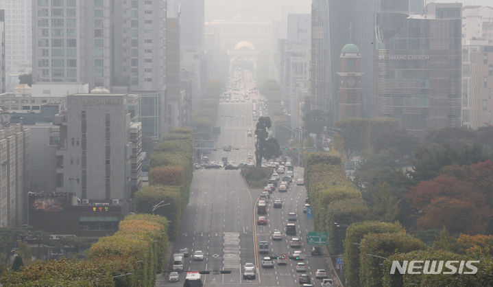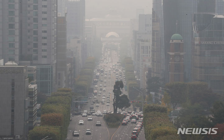 ソウルなど首都圏地域でPM2.5などの微小粒子状物質濃度が「不良」となった26日午前、ソウル市江南区一帯がかすんでいる。