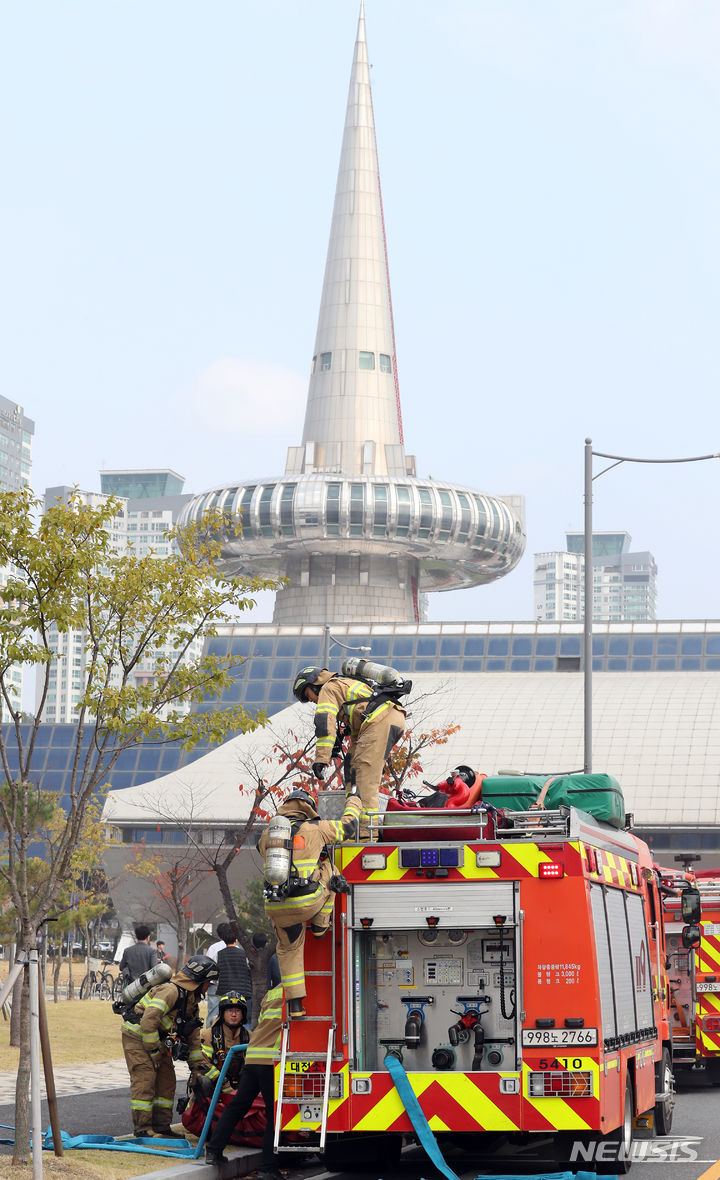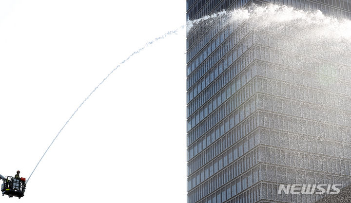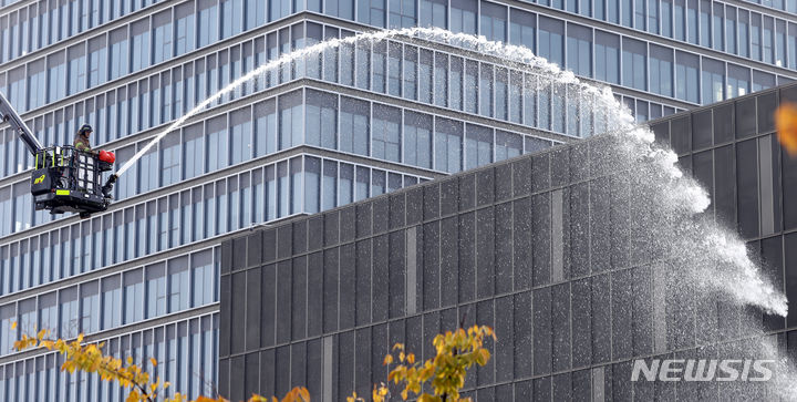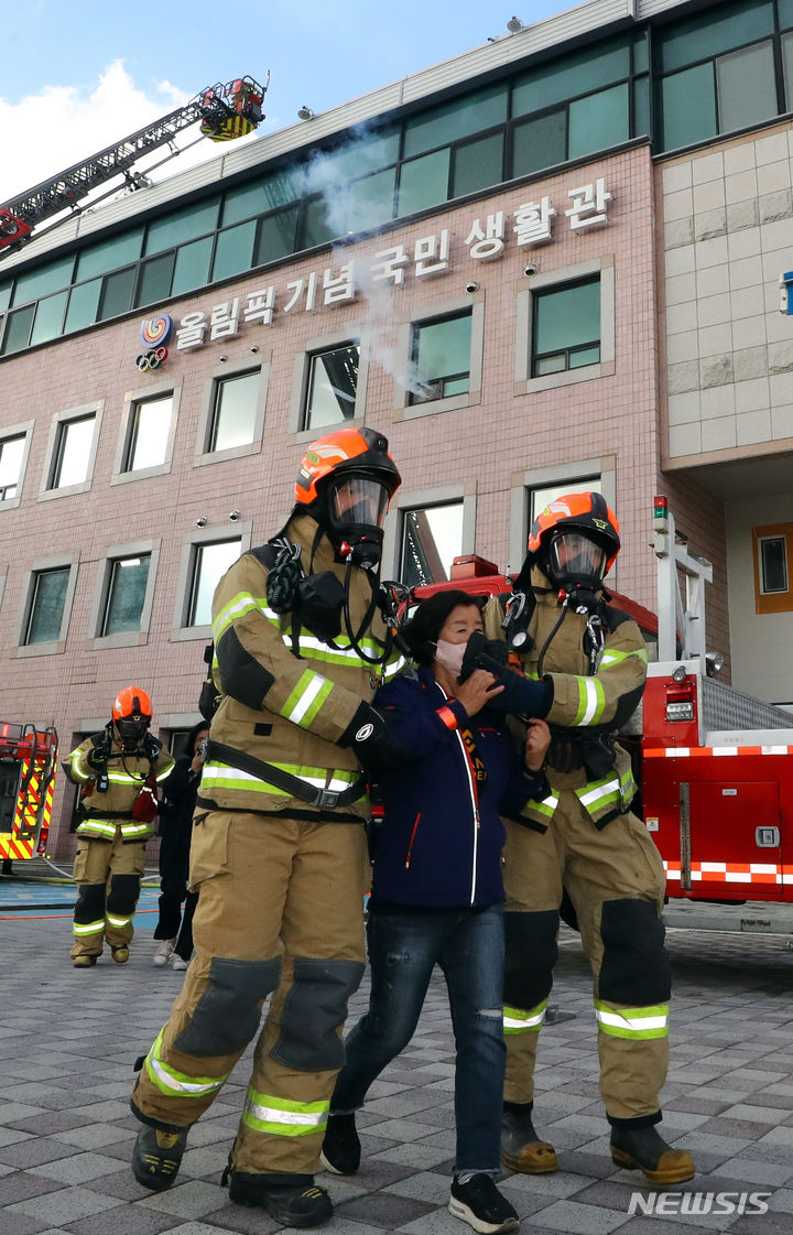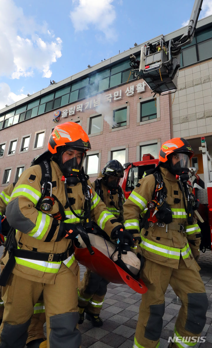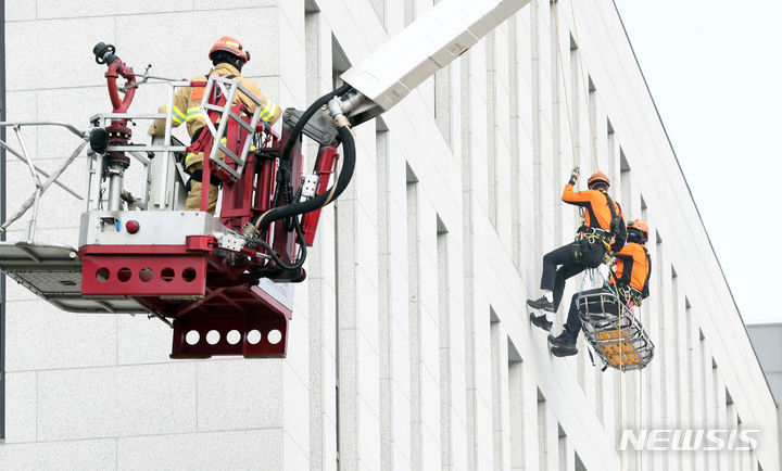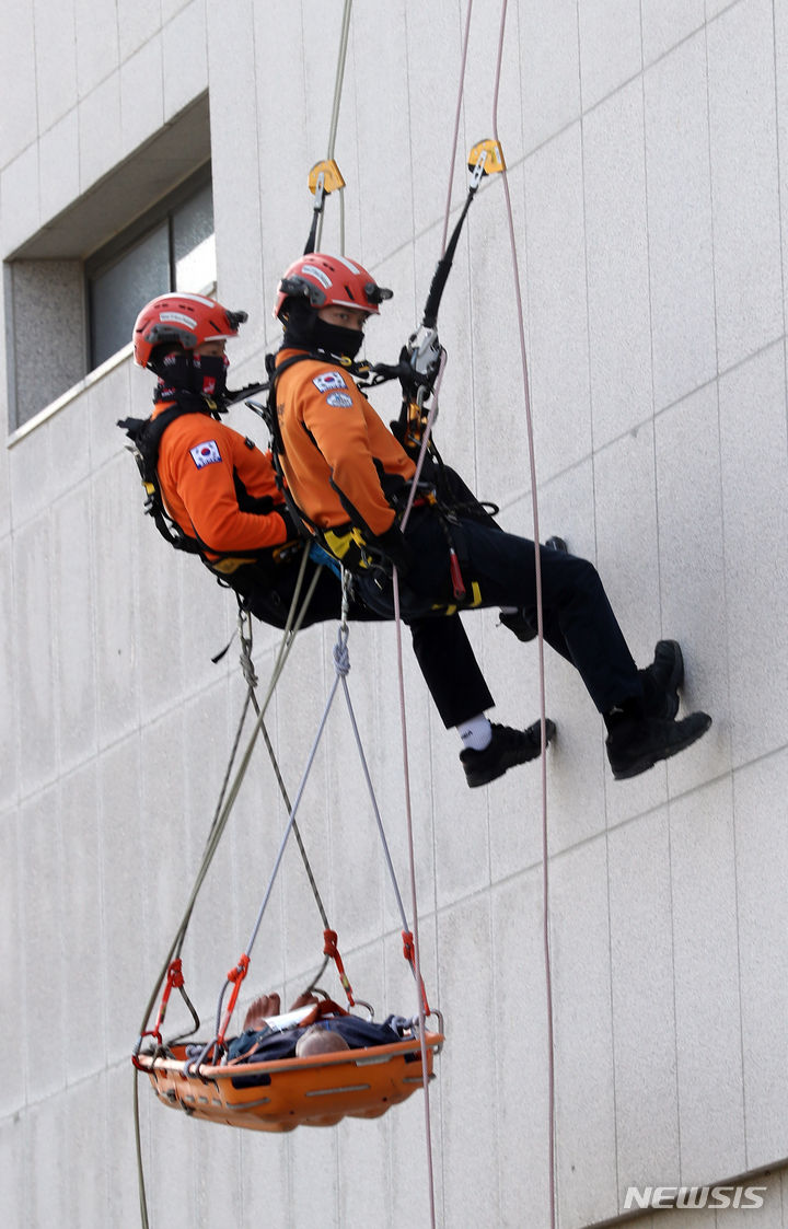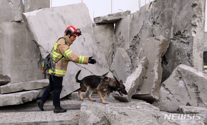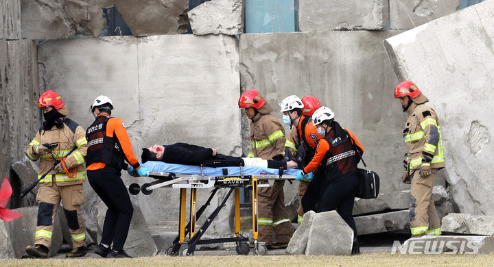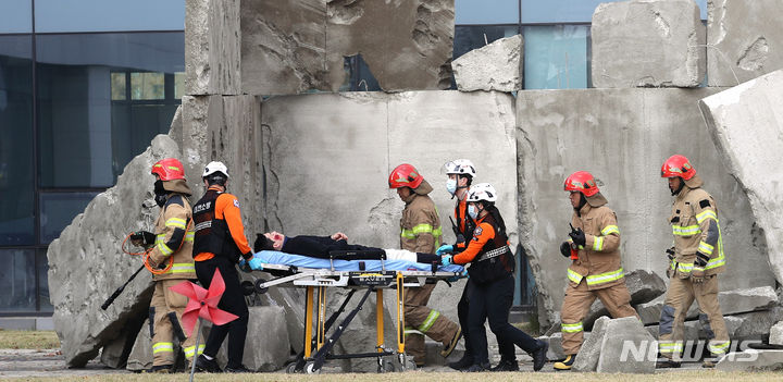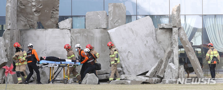 27日、大田市儒城区の基礎科学研究院で地震発生を想定して開かれた2023国家単位緊急救助総合訓練にて、救助隊員らが崩壊した建物での人命救助訓練を行っている様子。