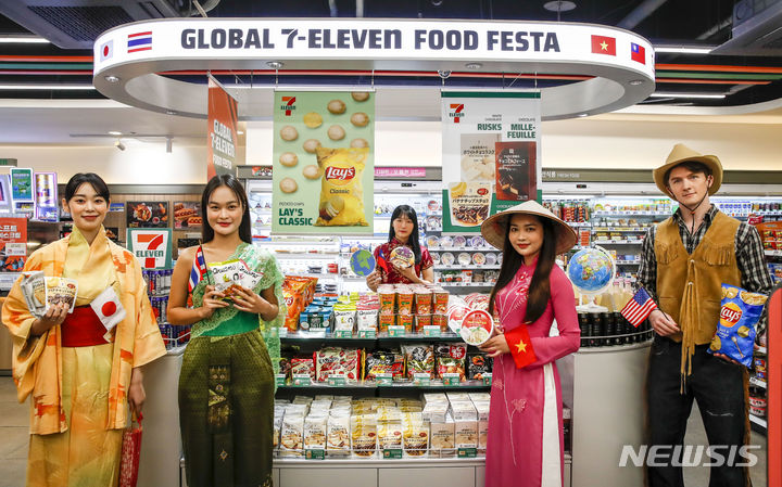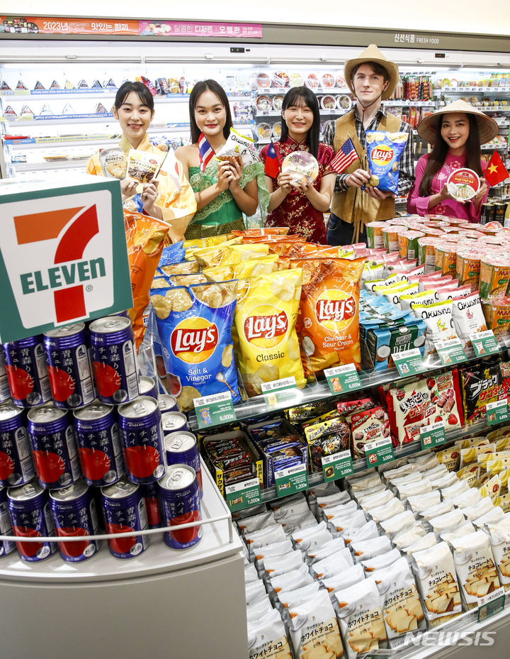 ソウル市松坡区のコンビニチェーン「セブン-イレブン」チャレンジストア店で31日、「セブン-イレブン、グローバル・ネットワークを基盤とした海外人気商品大規模発売」イベントが行われ、コンパニオンらが商品を紹介した。