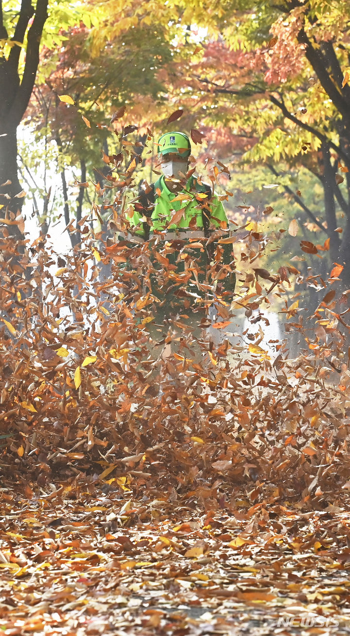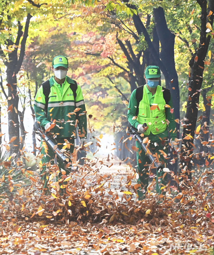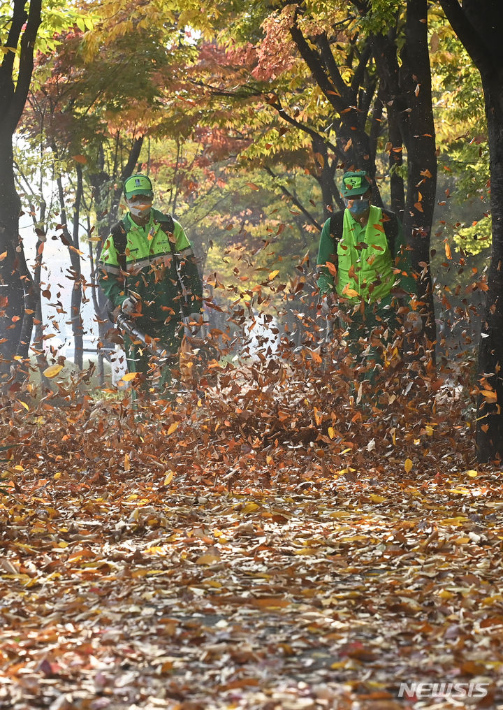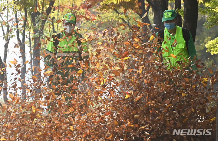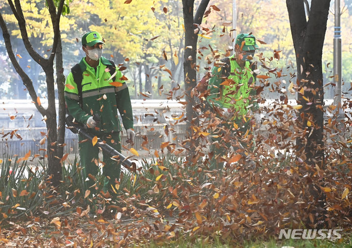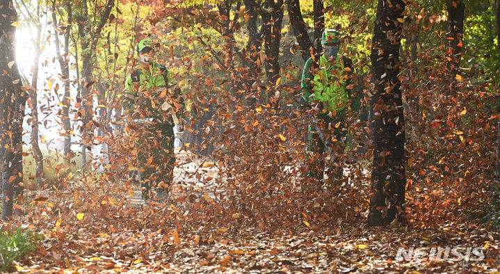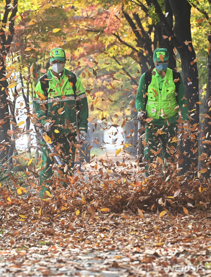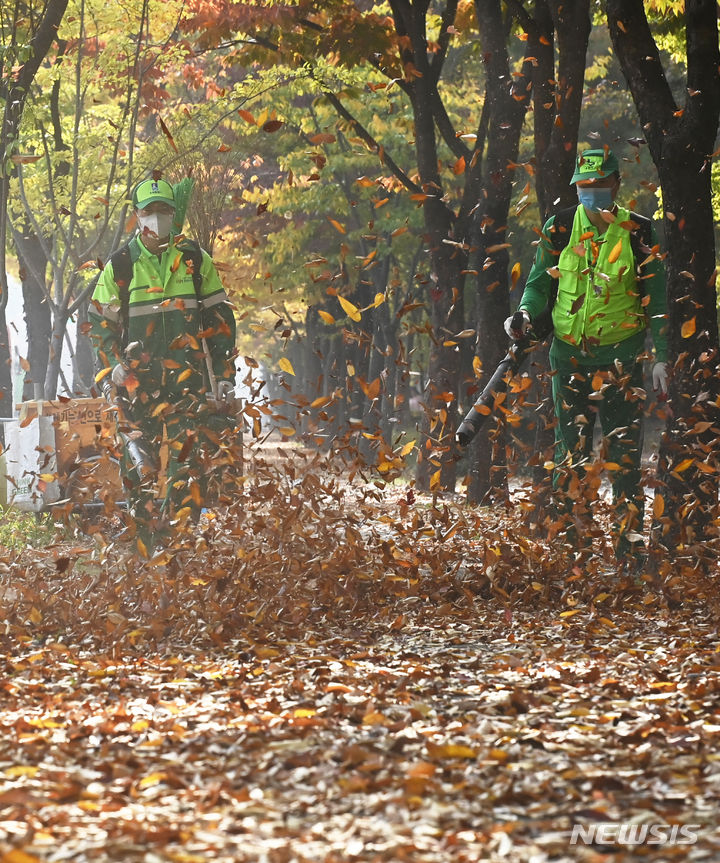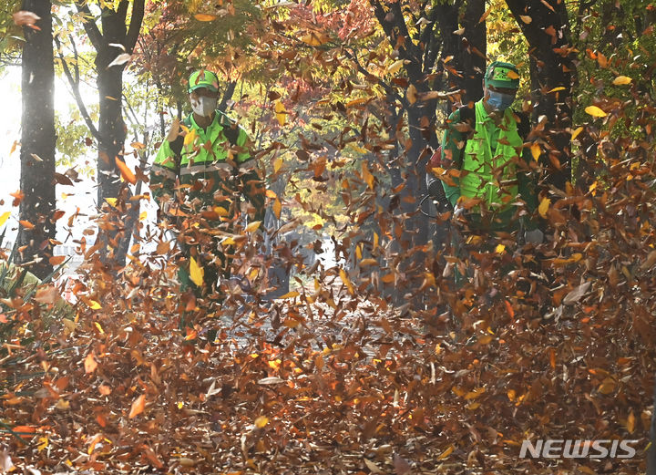 京畿道水原市霊通区梅灘3洞の街路樹通りで31日、環境管理員らが電動送風機を利用して、大量に積もった落ち葉の清掃をしている様子。