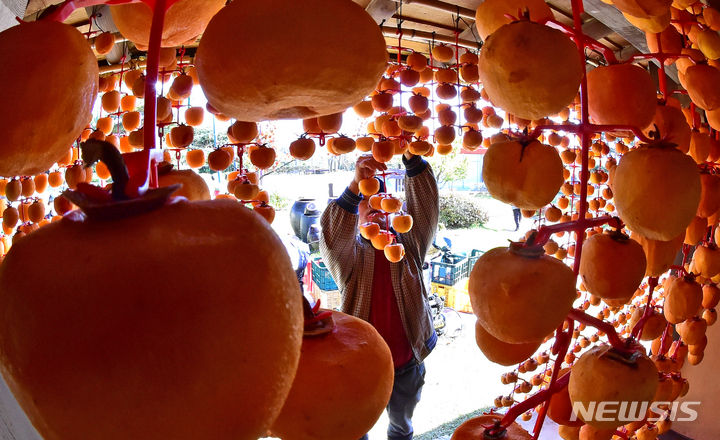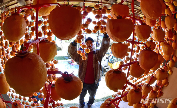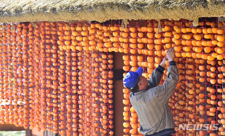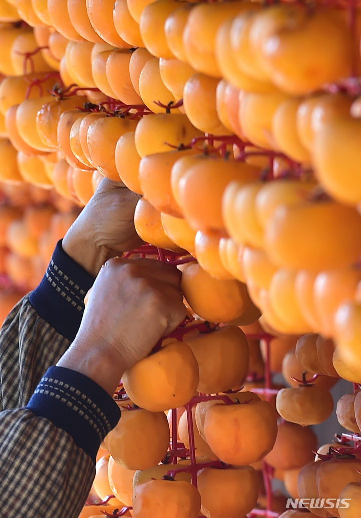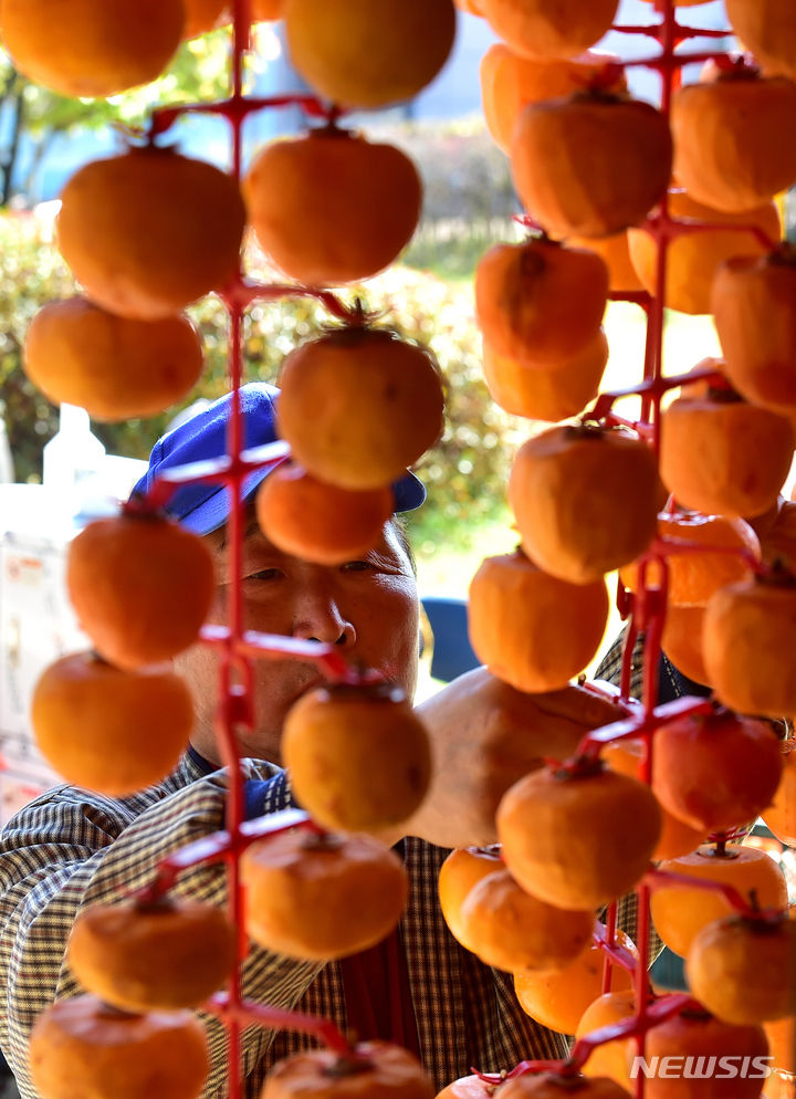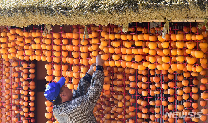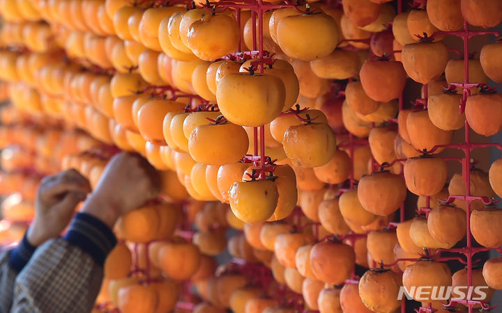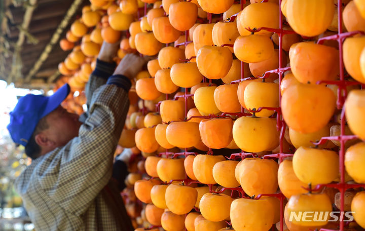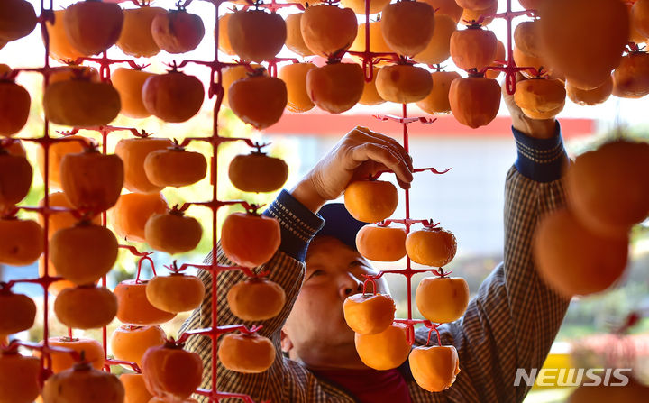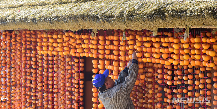 慶尚北道尚州市外南面の尚州干し柿公園で31日、ある住民が、干し柿を作るため皮をむいた柿を吊るしているところ。