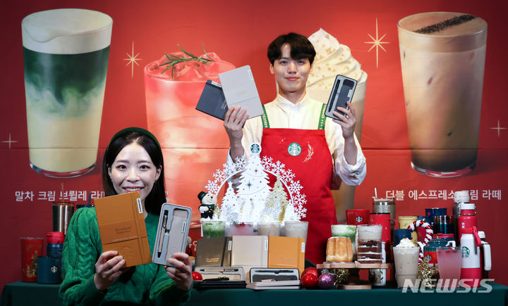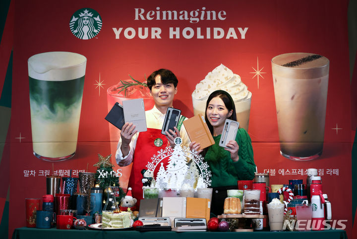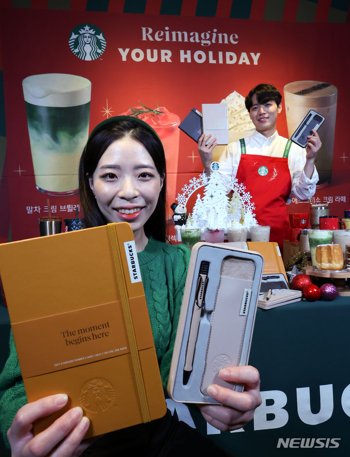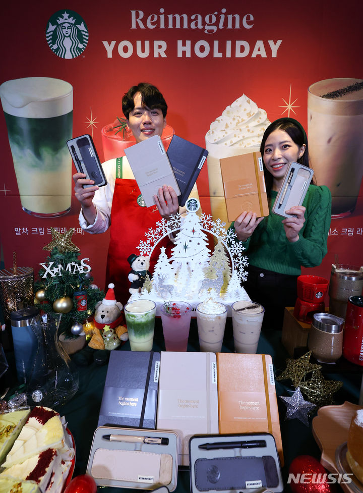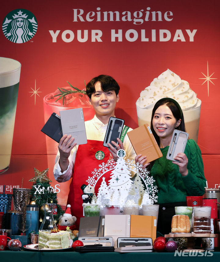 ソウル市中区のスターバックス・プレスセンター店で1日に開かれたクリスマス・プロモーションの開始イベントにて、謝恩品を紹介するコンパニオンの様子。スターバックスは、クリスマスに合わせて2日から、プロモーション飲料3杯を含む計17杯のドリンクを購入してスタンプを集めた客に謝恩品を贈呈する「冬のe-FREQUENCYイベント」を行う。