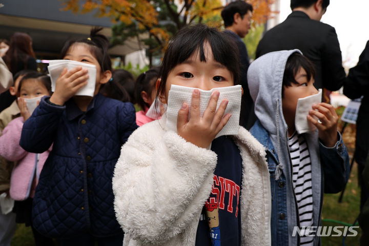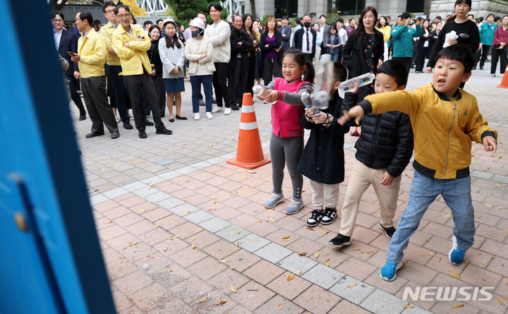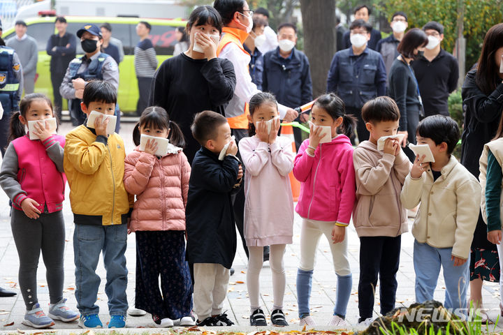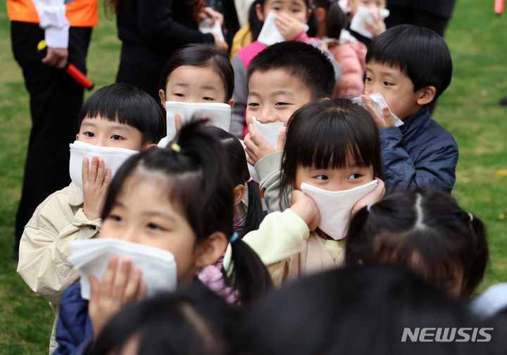 全国民防衛訓練が行われた1日午後、ソウル市鍾路区の政府ソウル庁舎で、オリニチプ(民間保育施設)の子どもたちが避難訓練をしているところ。