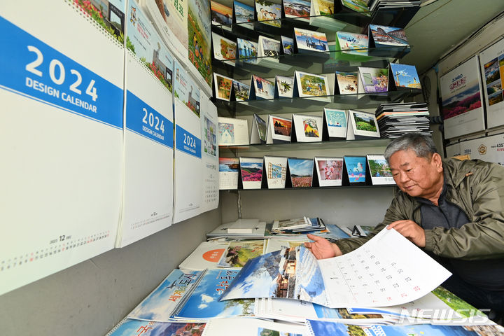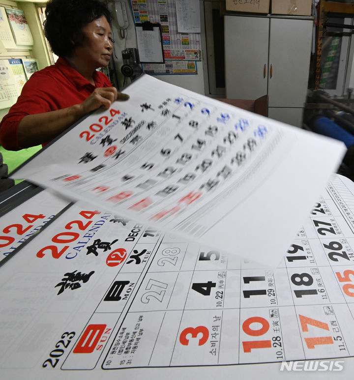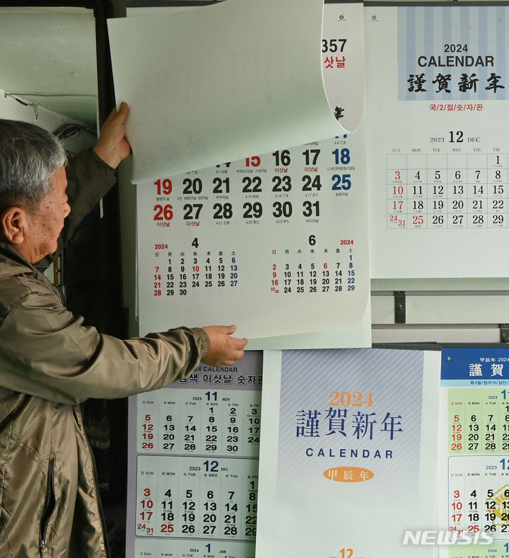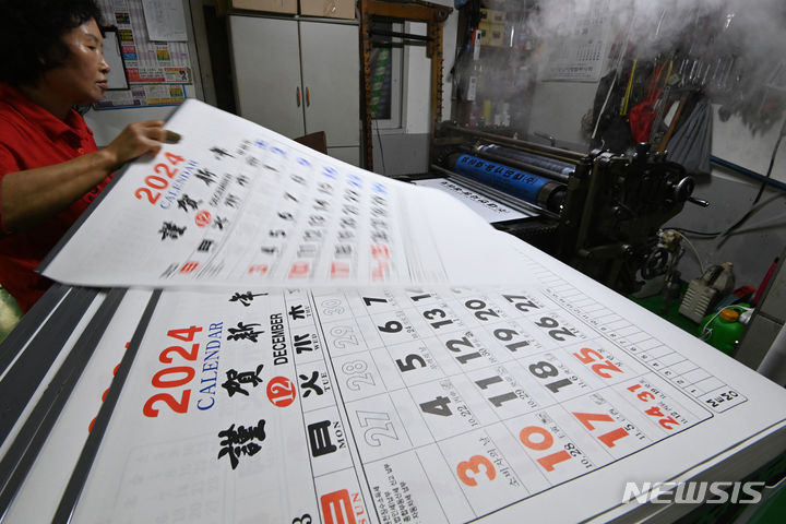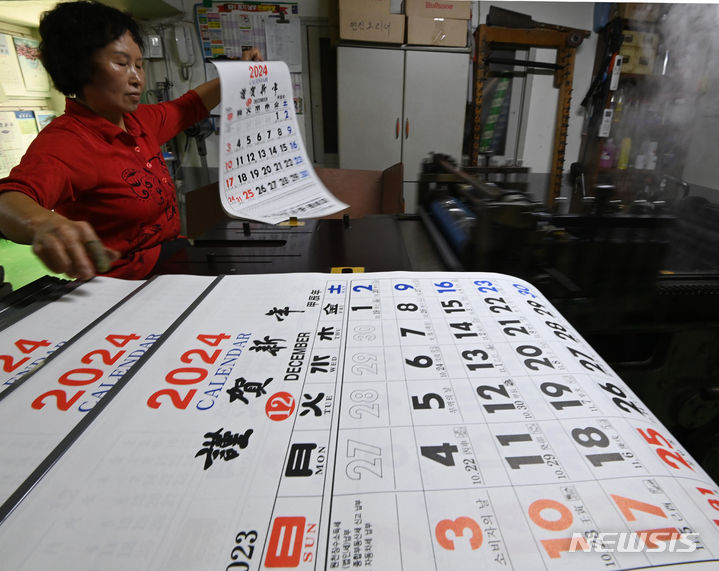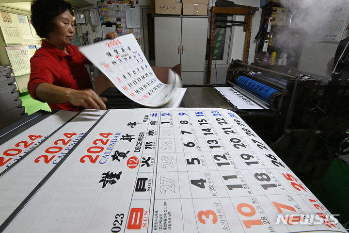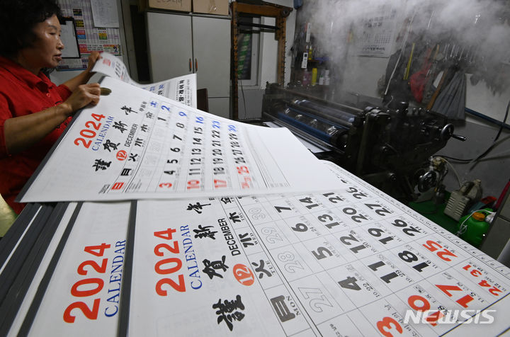 京畿道水原市長安区のカレンダー印刷所で2日、従業員が「2024甲辰(きのえたつ)」年のカレンダーを作っている様子。