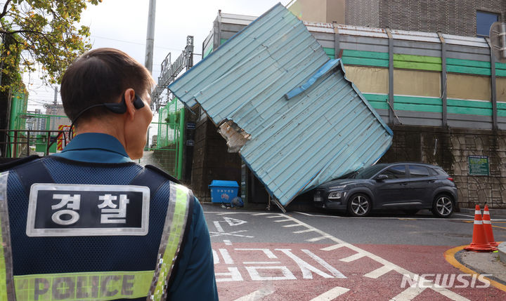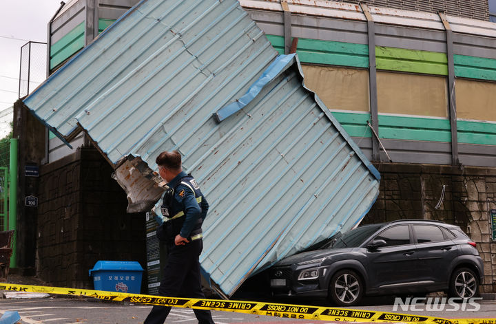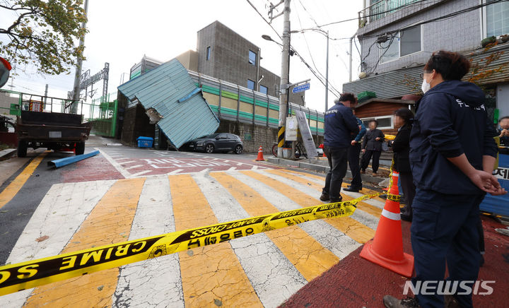 ソウル市東大門区の踏十里地下横断道路近くで6日、建物の屋根が落下し、警察が道路を規制している。