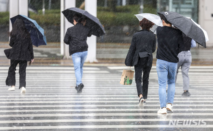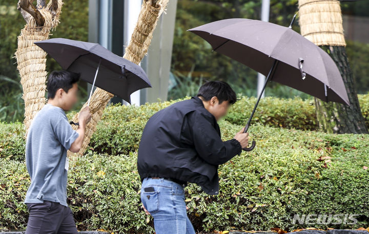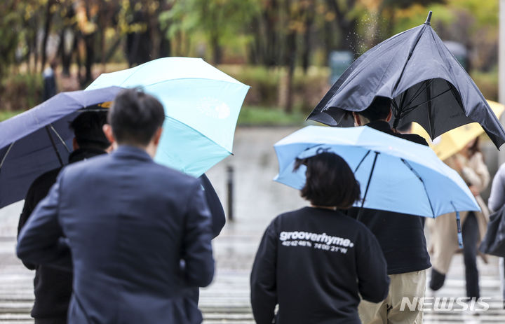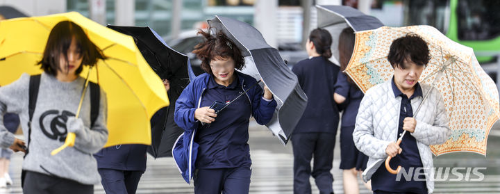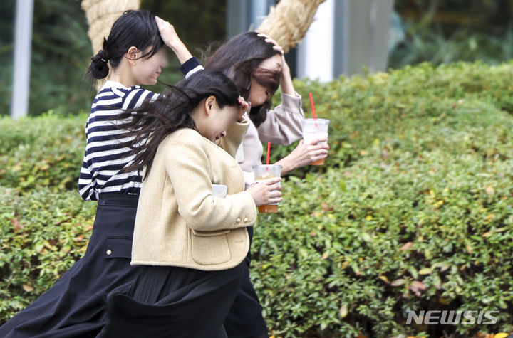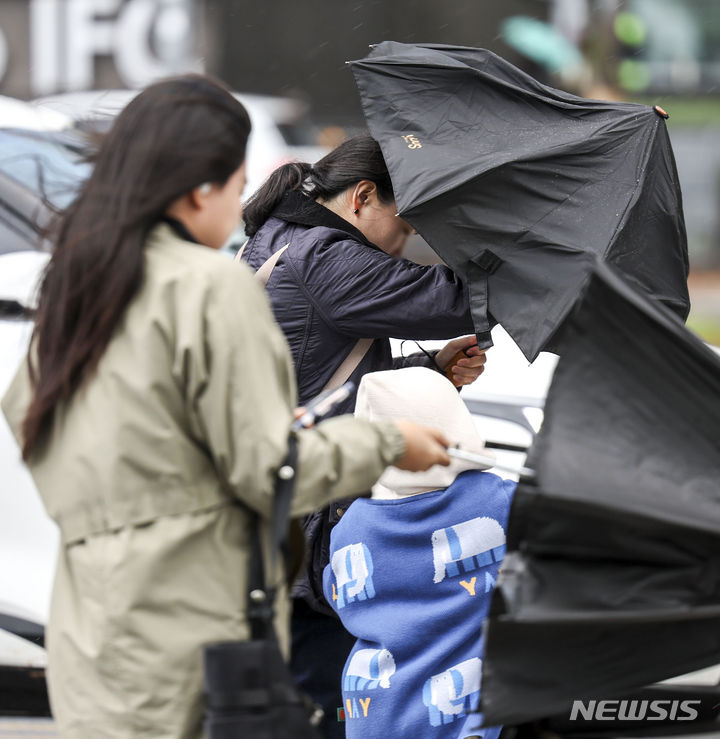 ソウル地域に強風注意報が発令された6日、ソウル市永登浦区の汝矣島乗り換えセンターで、傘をしっかりつかんで移動する市民の様子。