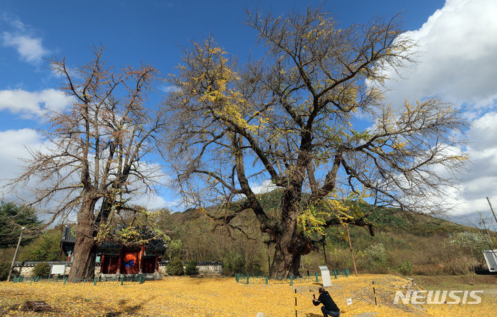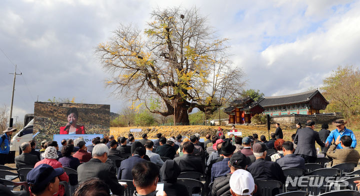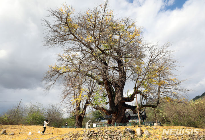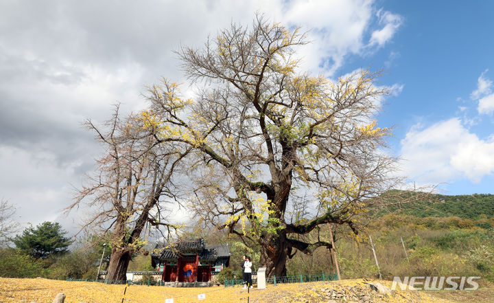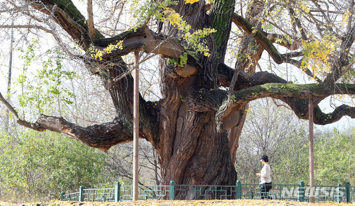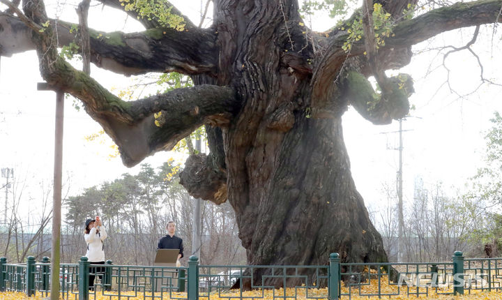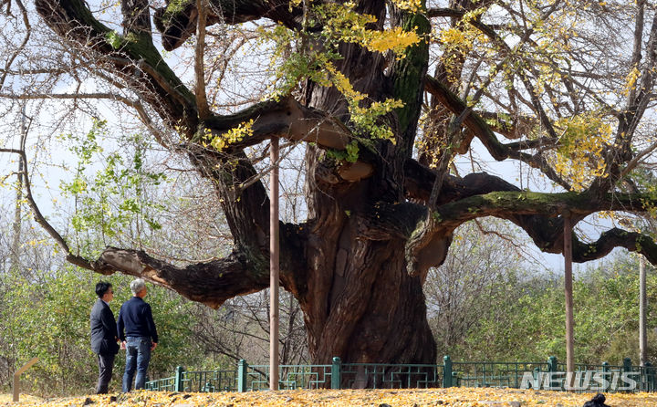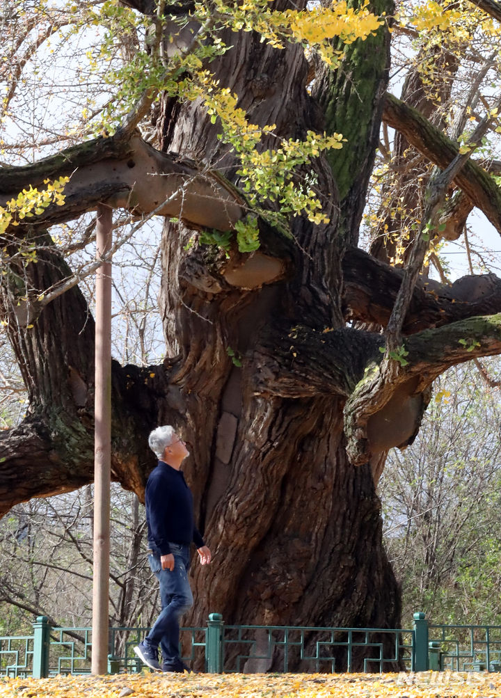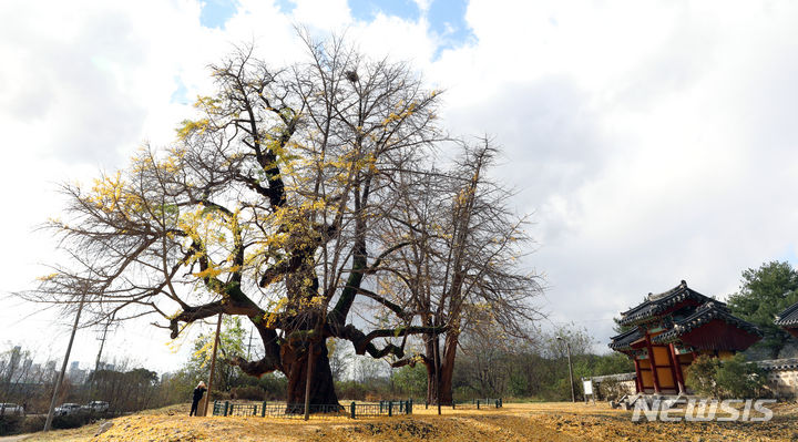 「雌雄一対の木」という他では見られない特徴と、轉月山のすそ野にある崇慕閣と調和をなす景観的価値が認められ、昨年5月12日に天然記念物指定を受けた「林蘭秀のイチョウ」(世宗市世宗洞)。この木は、高麗末の忠臣・林蘭秀(イム・ナンス)将軍=1342-1402=が、当時の公州牧三岐村に下り、王のことを思って植えた雌雄一対の木で、樹齢600年以上になる老大木だ。