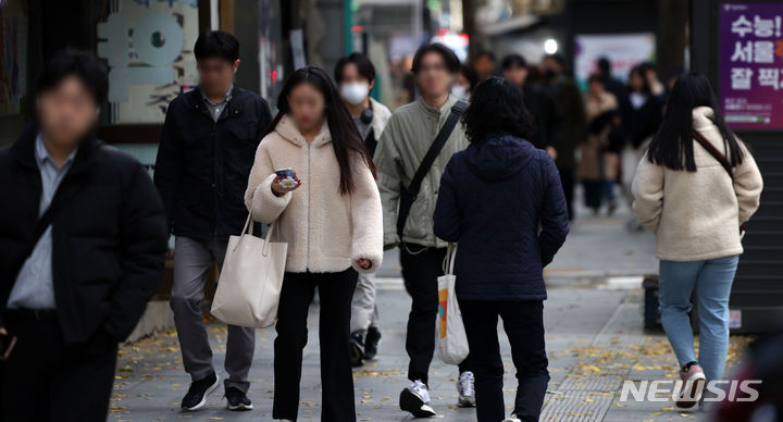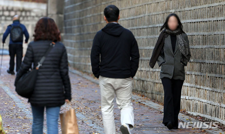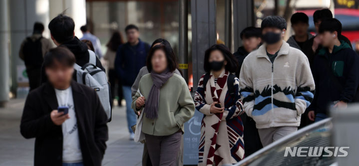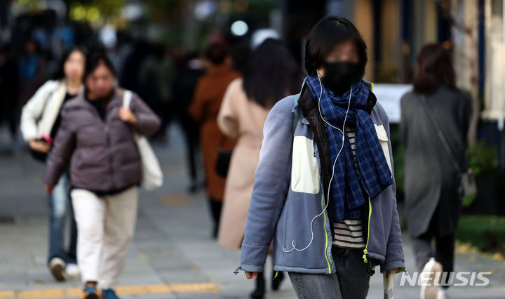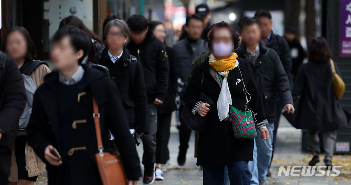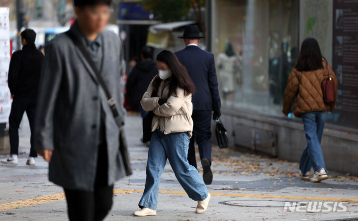 7日午前、ソウルで最低気温が前日に比べ大幅に下がり3度を記録し、ソウル市中区の地下鉄市庁駅周辺では厚着をして出勤する市民たちの姿が見られた。