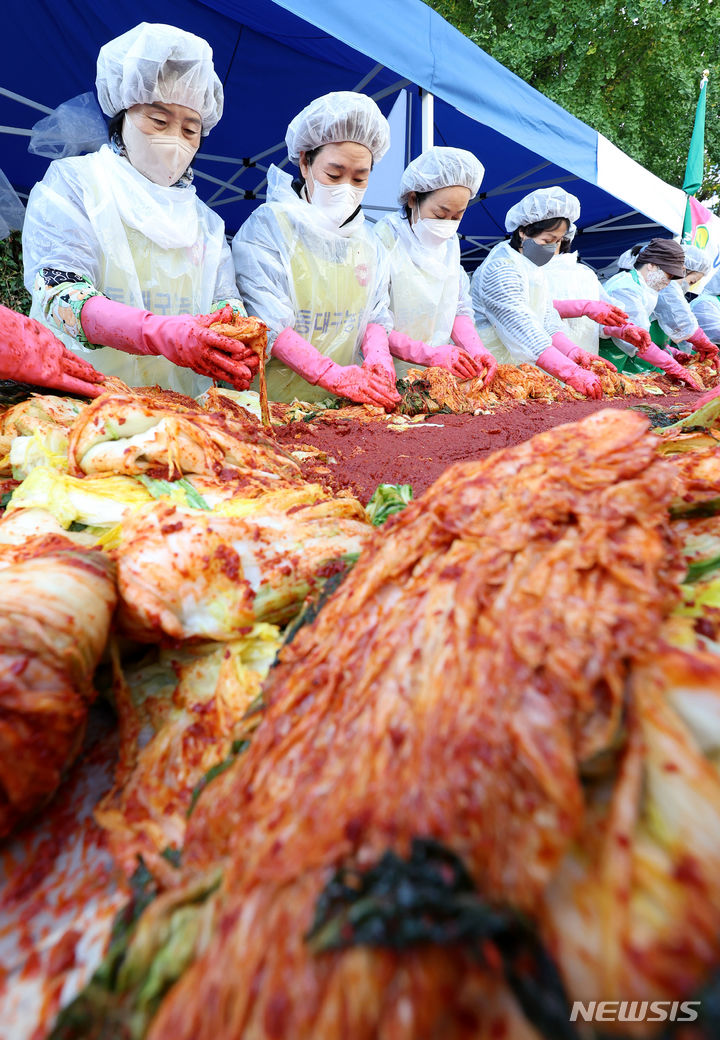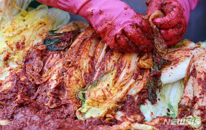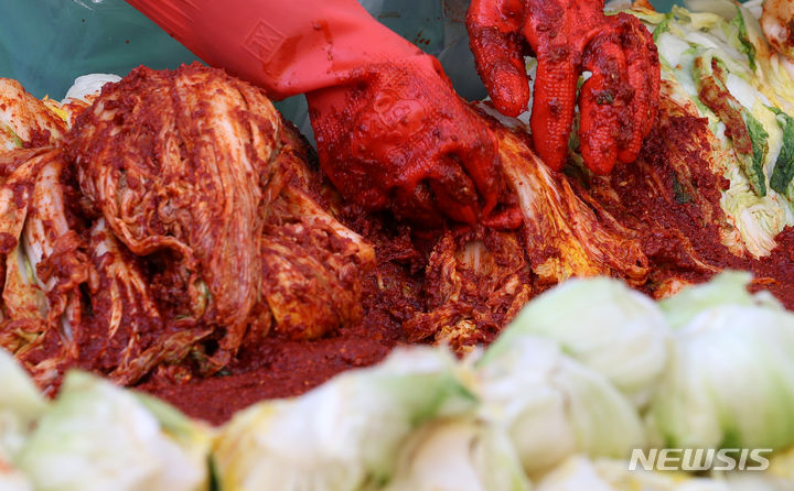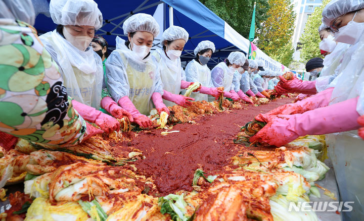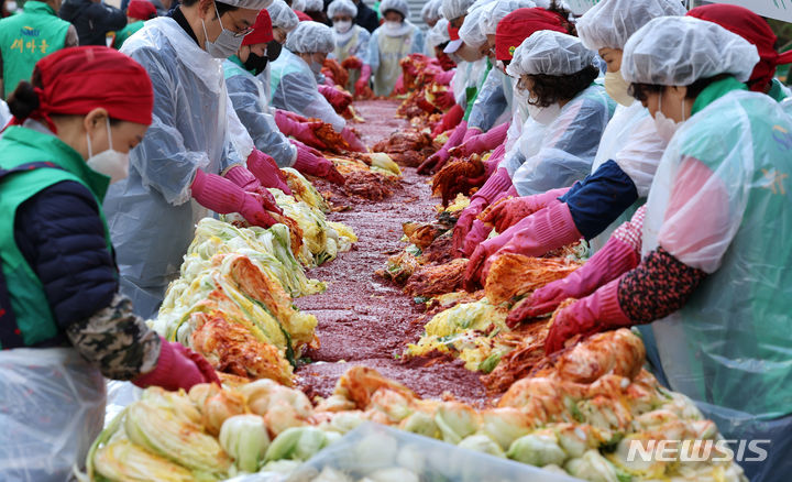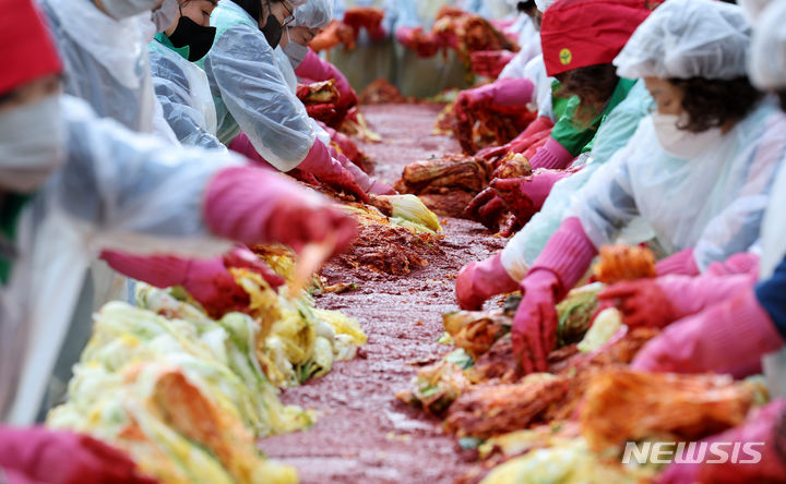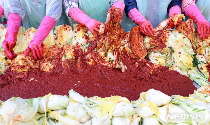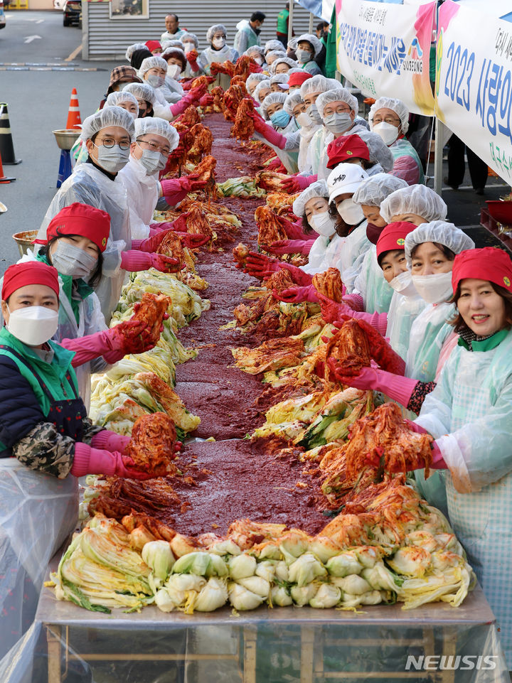 【NEWSIS】7日、大邱市寿城区庁の駐車場で、「2023愛のキムチ作り」が行われた。写真は大量のハクサイにキムチのタレを塗って漬け込む同区のセマウル会会員らボランティアたち。この日作られたキムチは、同区内の低所得世帯800世帯に配られる予定だ。