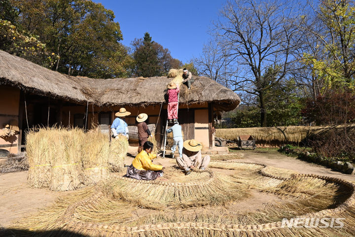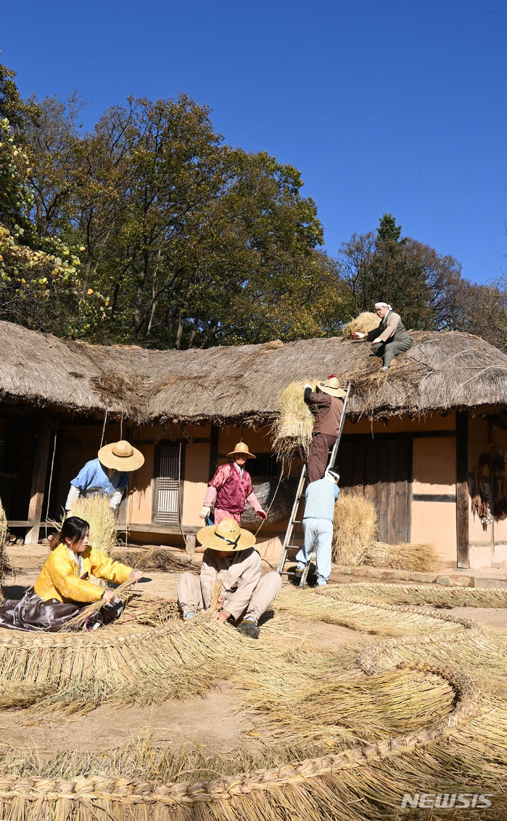 二十四節気の一つ「立冬」があすに迫った7日、京畿道竜仁の韓国民俗村では、関係者らが草葺き屋根の葺き替え作業を行って冬に向けた準備を進めていた。