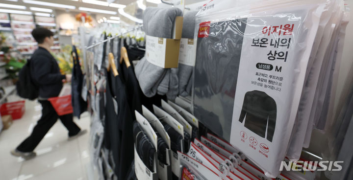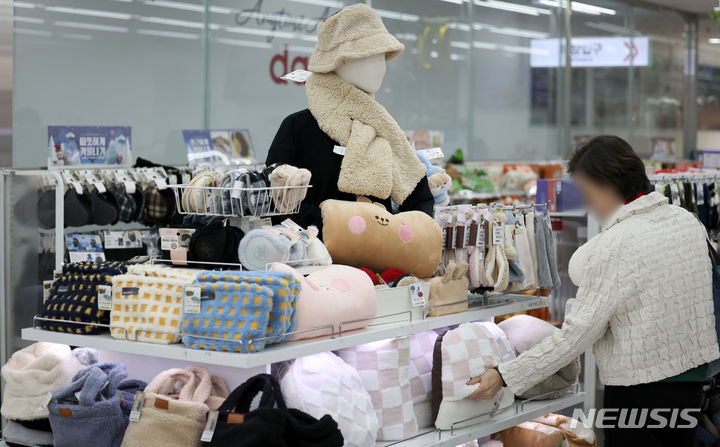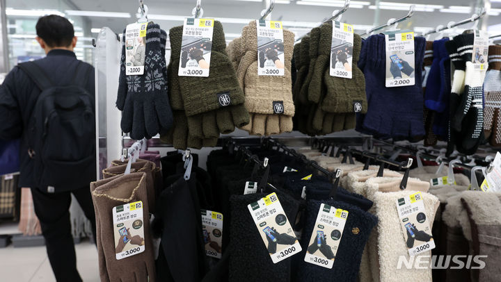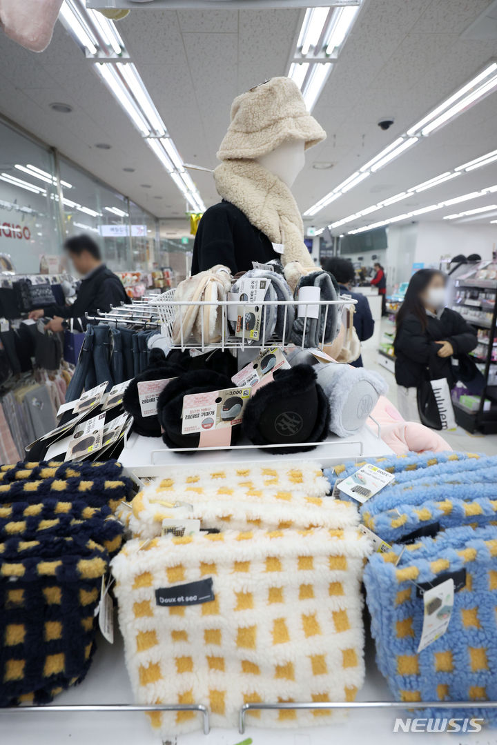 寒さが本格的に始まり、冬物衣類など防寒用品の販売が増加している。ダイソーが冬物衣類の企画展を進める等、流通業界はさまざまなプロモーションを進めて本格的な冬用品販売に突入した。写真は8日、ソウル市松坡区のダイソーの店舗で、各種防寒用品が販売されている様子。