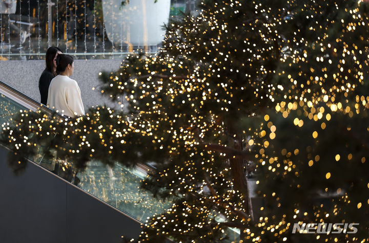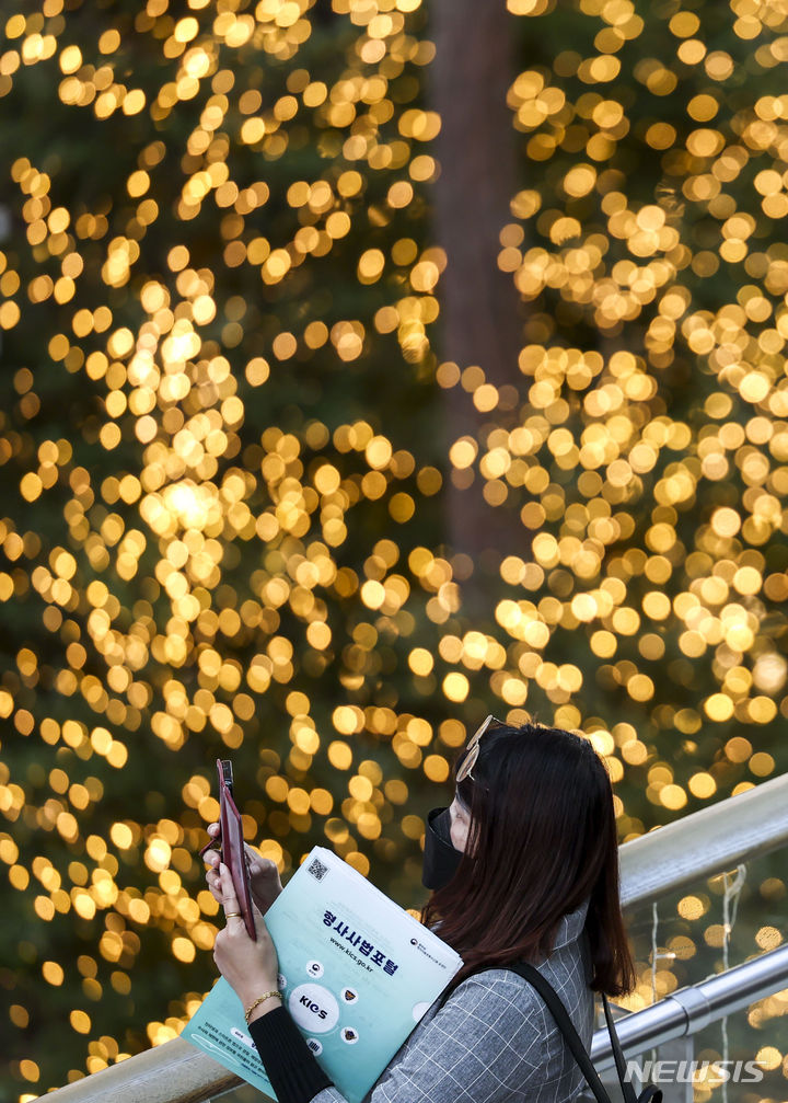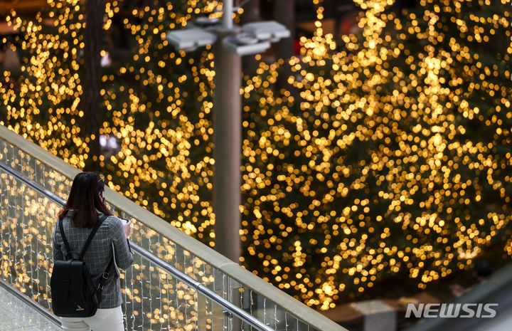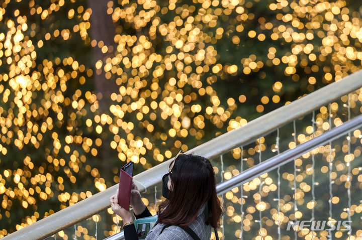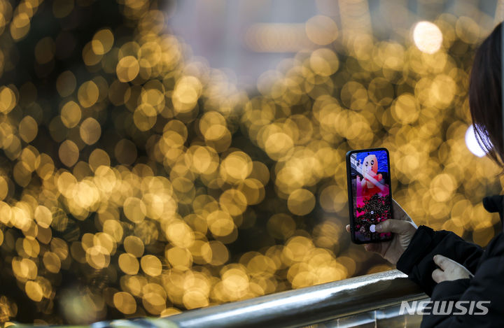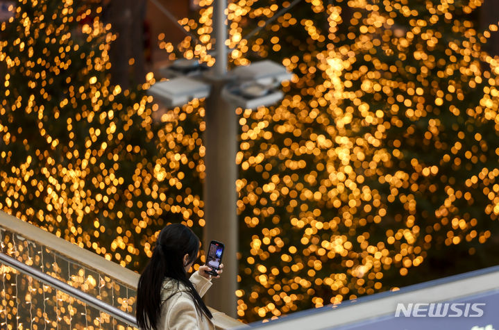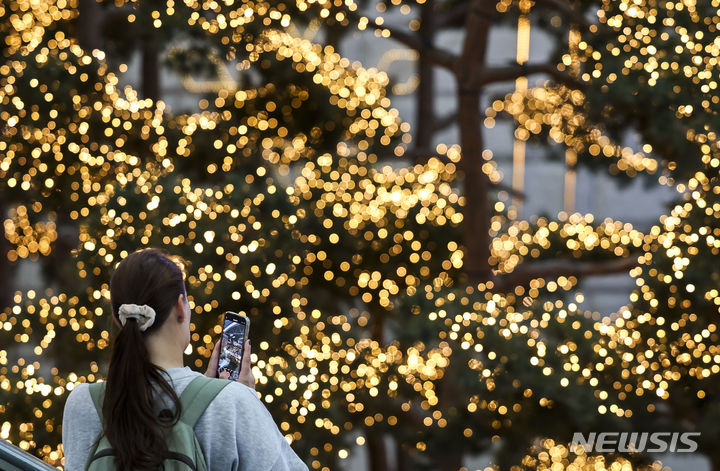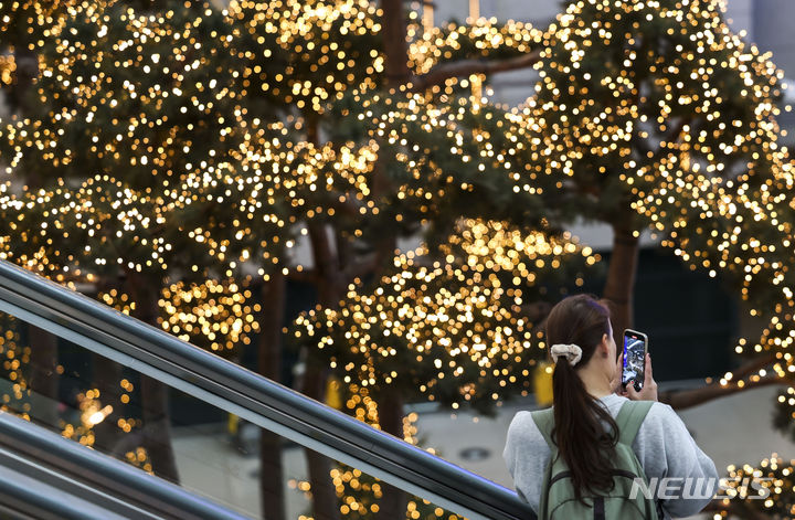 8日、仁川国際空港第1ターミナルの出国場を訪れた旅行客が、クリスマス飾りの前で写真を撮っている様子。
