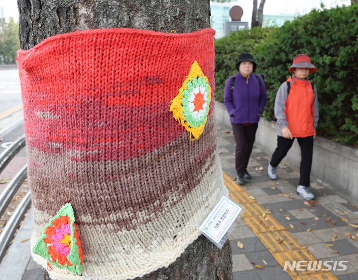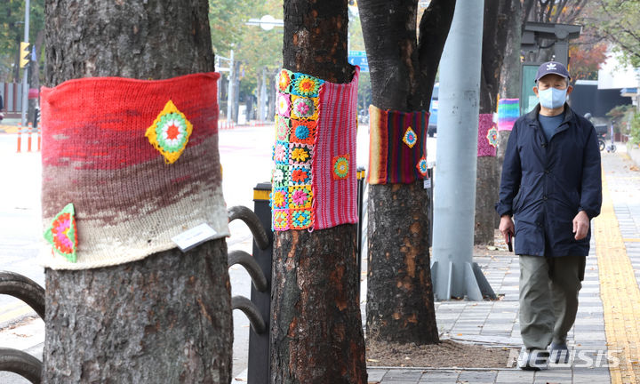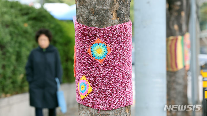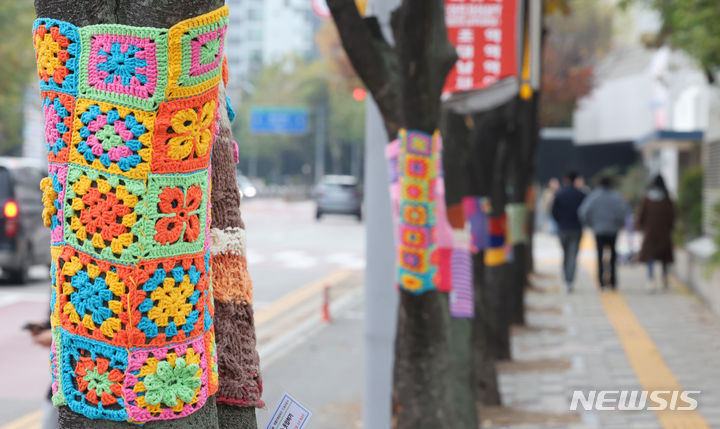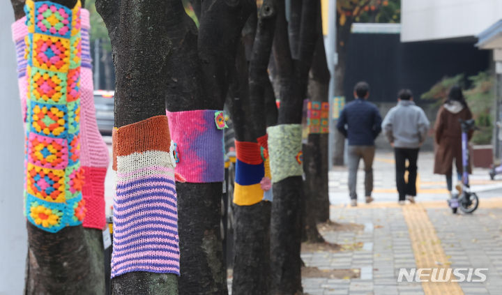 9日、市民が手編みした「冬着」を着ている仁川市延寿区庁付近の街路樹の様子。