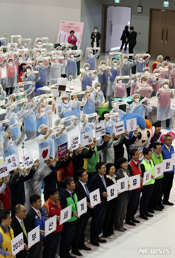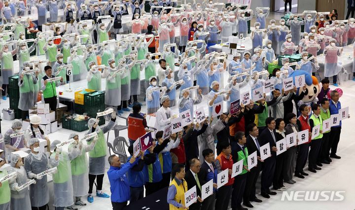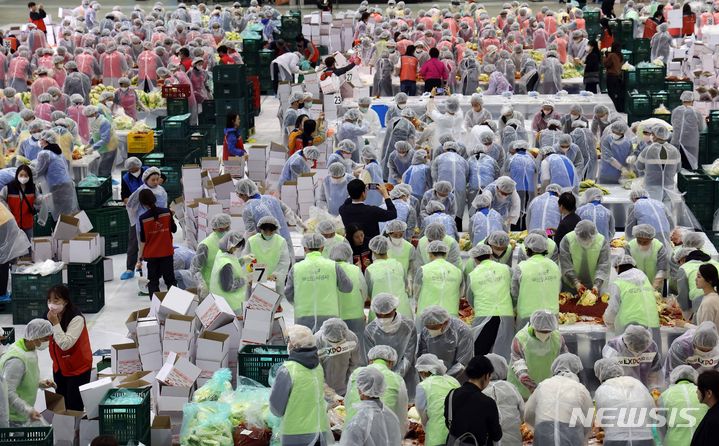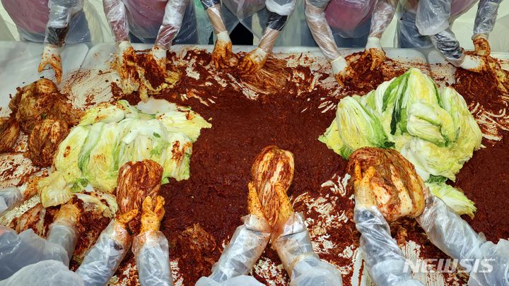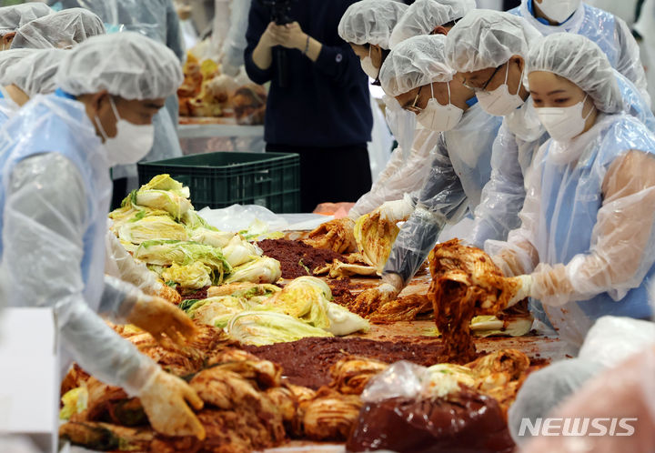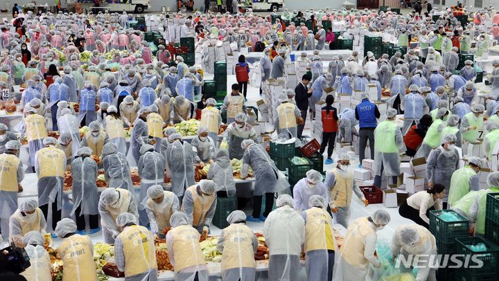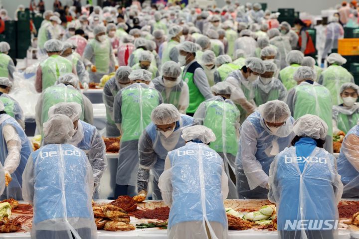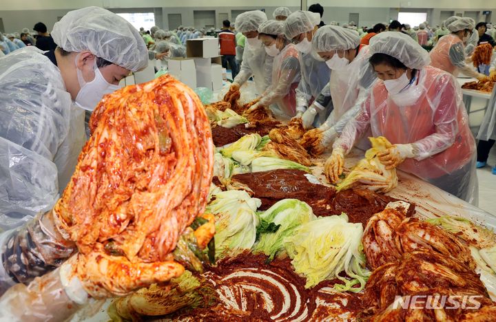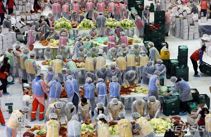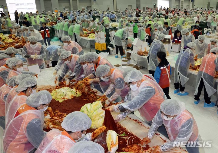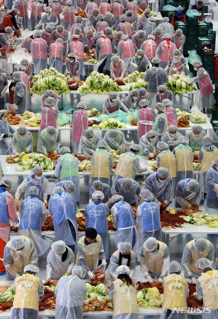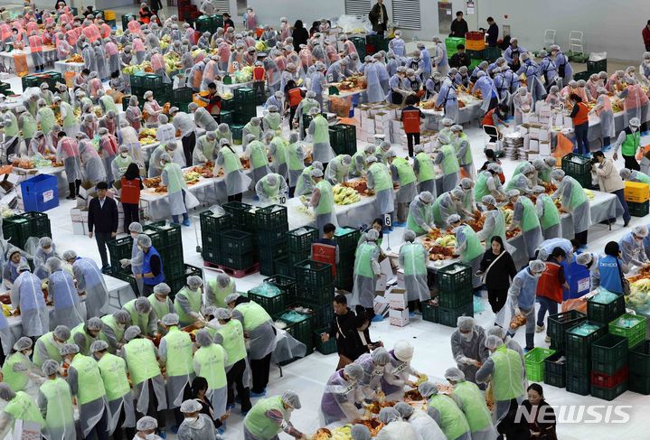 「愛のキムチ分かち合い広場2023」が開催された10日午前、釜山市海雲台区のBEXCO第2展示場で、ボランティアのメンバーたちがキムチを漬け、容器に詰めていた。この日、同イベントには32の企業・機関・団体の代表や企業奉仕団、ボランティアメンバーらおよそ1000人が参加し、23トン(白菜およそ1万株)に達するキムチを漬け、地域の恵まれない家庭およそ4700世帯に配る。