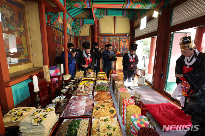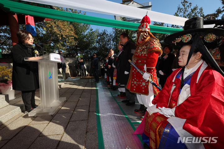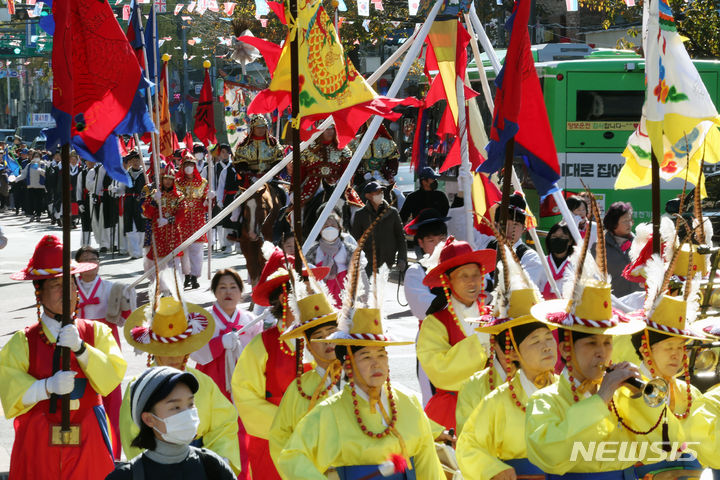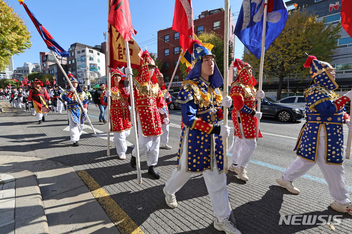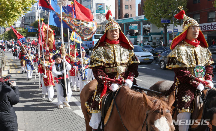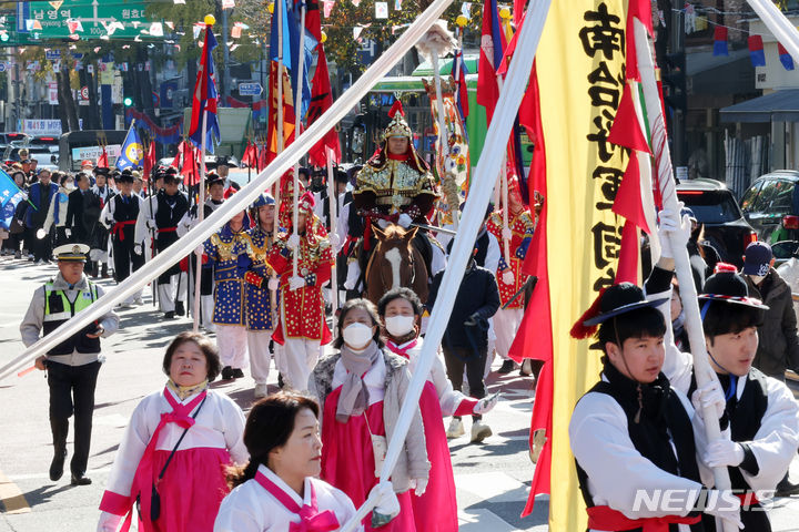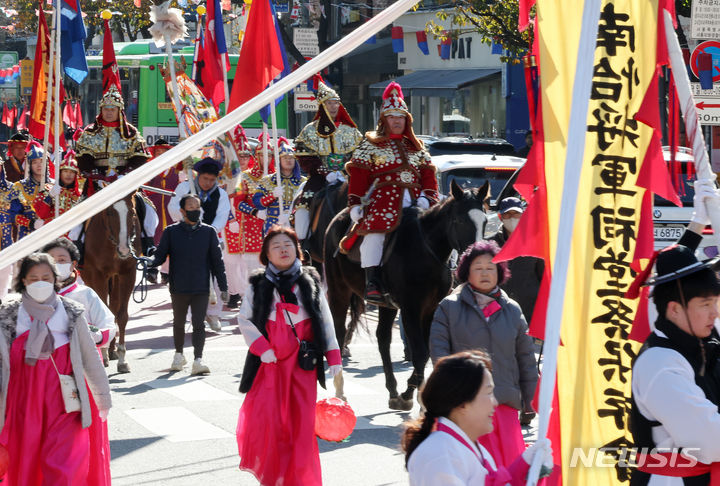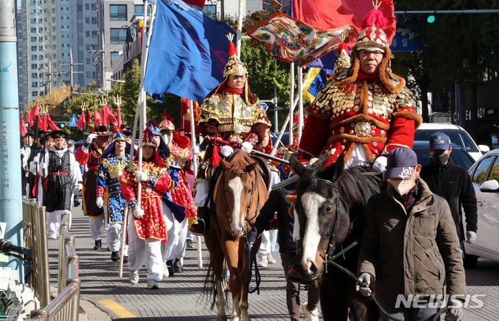 第41回南怡将軍祠堂祭が開かれた13日午前、ソウル市竜山区の南怡(ナム・イ)将軍の祠堂付近で、南怡将軍出陣の様子を再現した行列が行進している様子。
