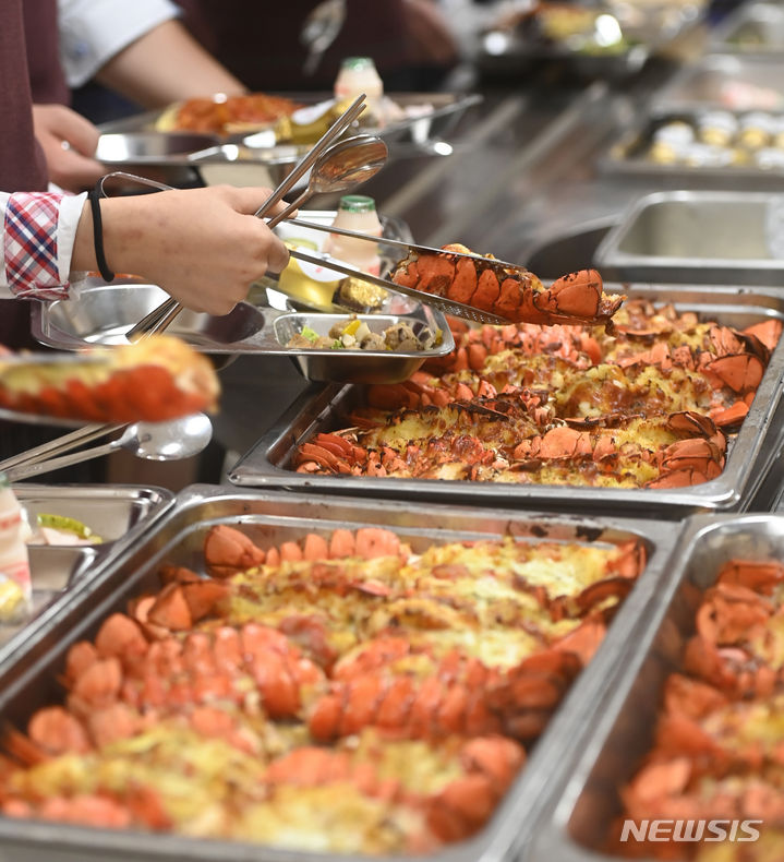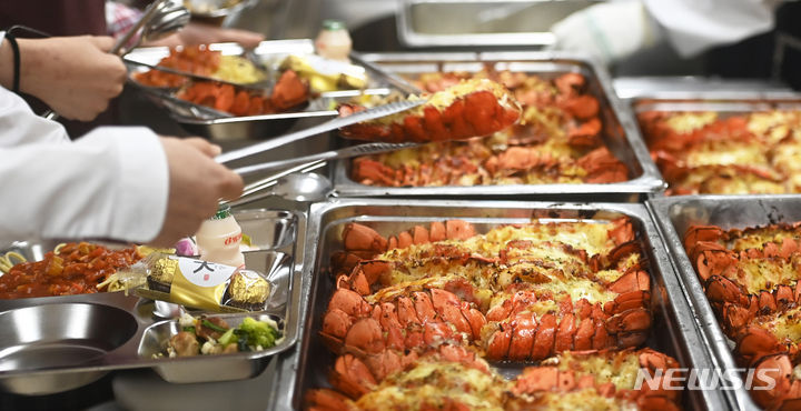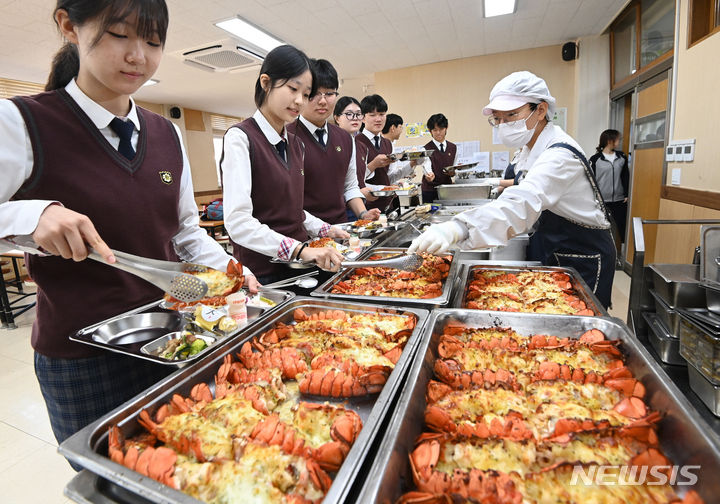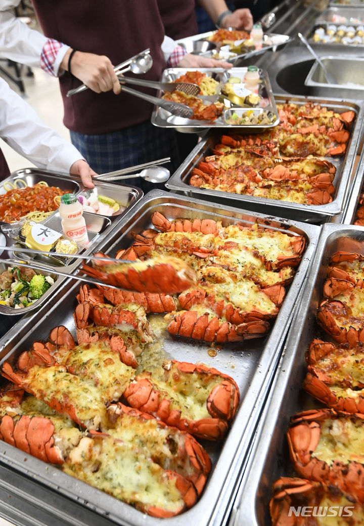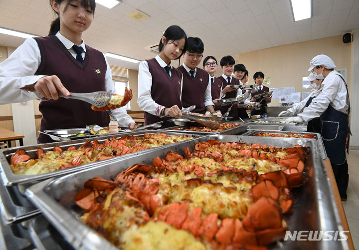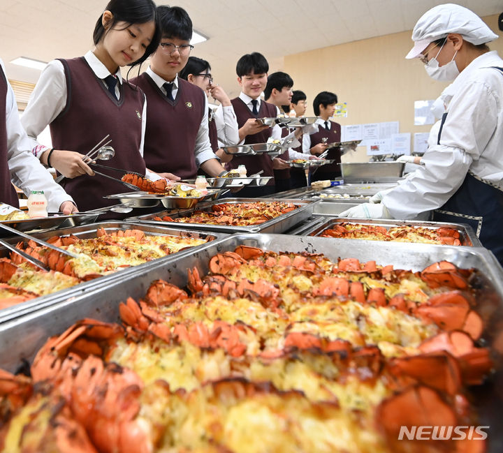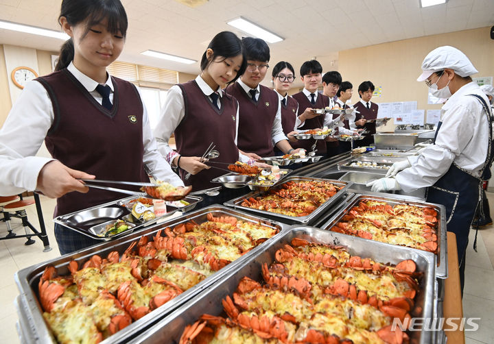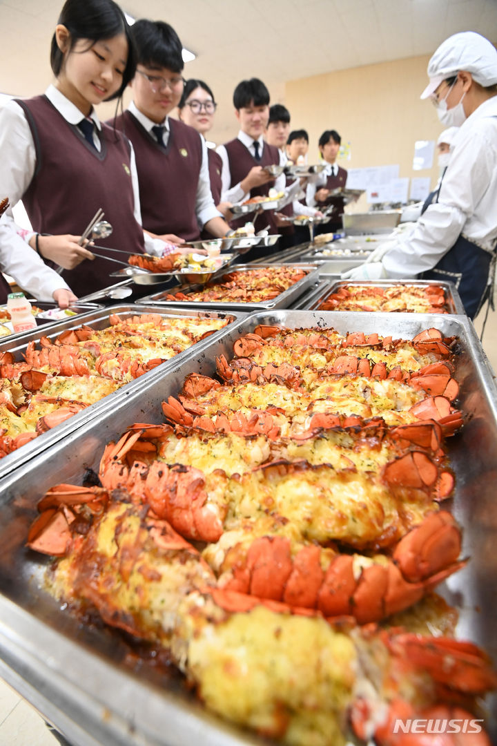 京畿道水原市の孝園高校で14日、生徒らが昼食の時間にロブスターの配食を受けている様子。カーボンニュートラル模範校として営まれている孝園高校は、学校給食の飲食物ごみ削減活動の結果、処理費が前年比49.2%減、ごみ発生量が55%減となった。そこで、活動に積極参加した生徒・教職員らを激励するため、ロブスターテール焼きを食堂で提供した。