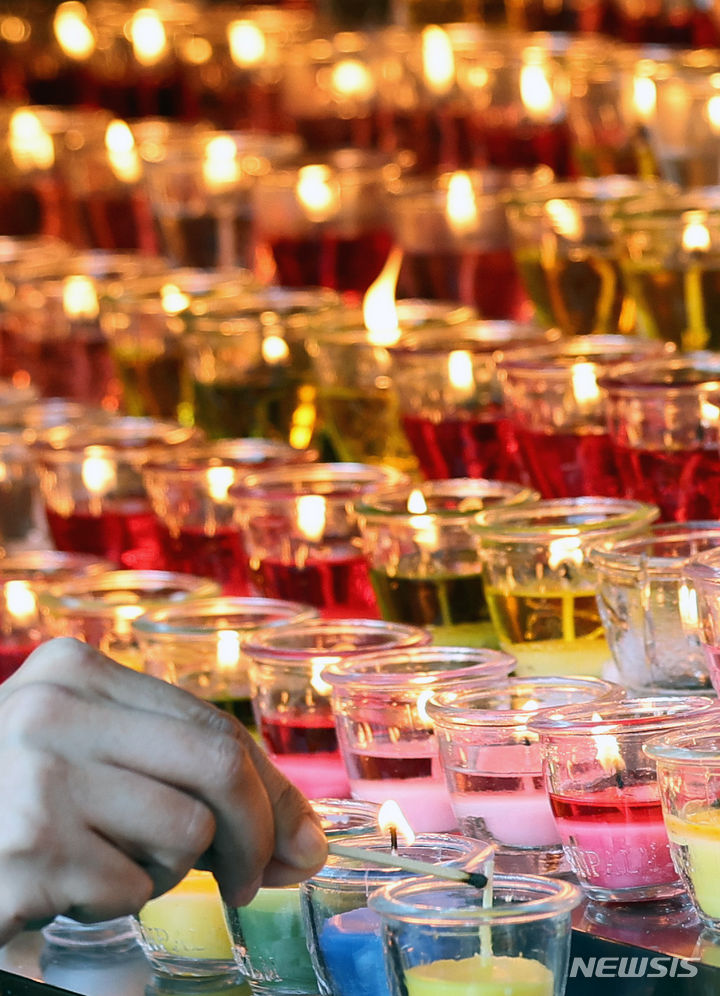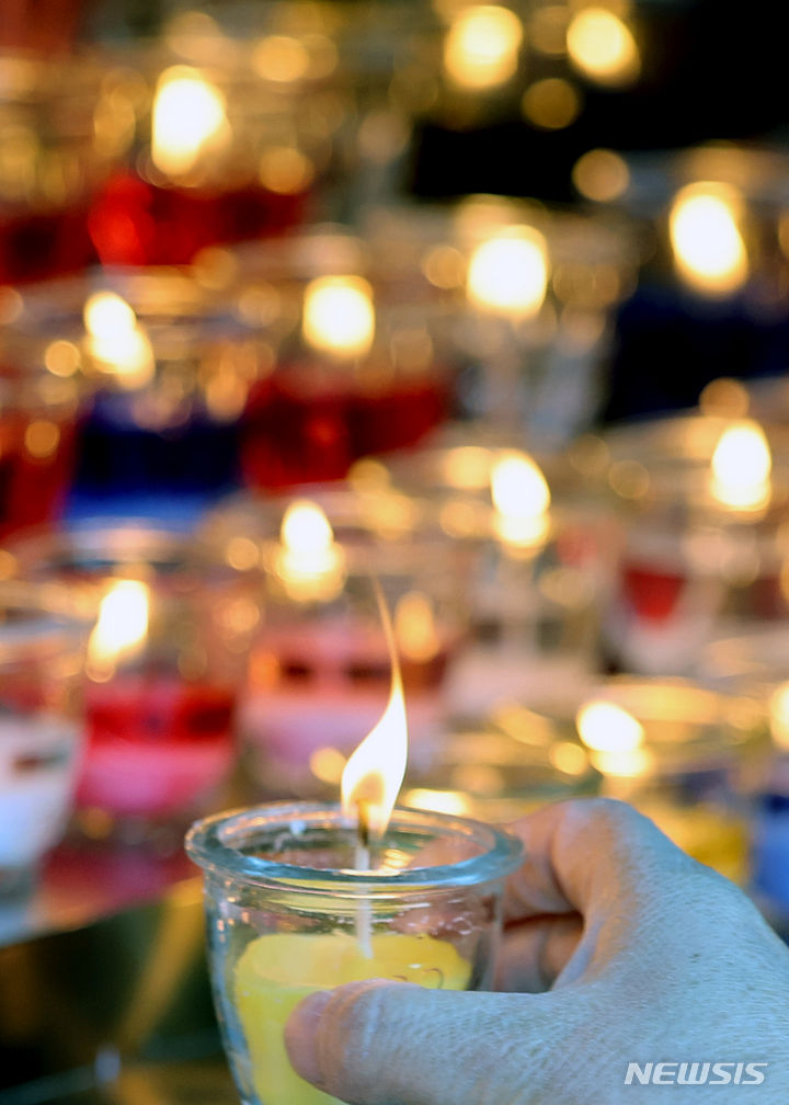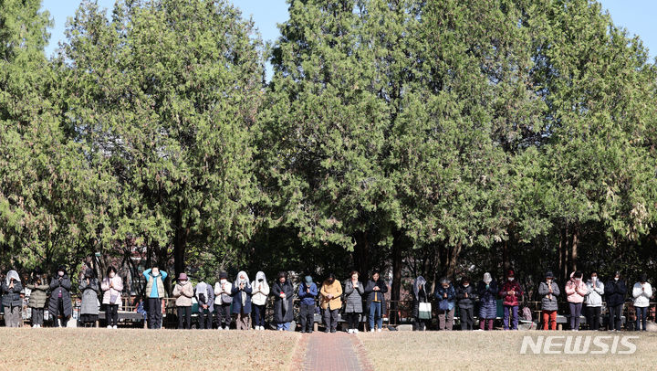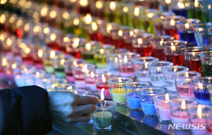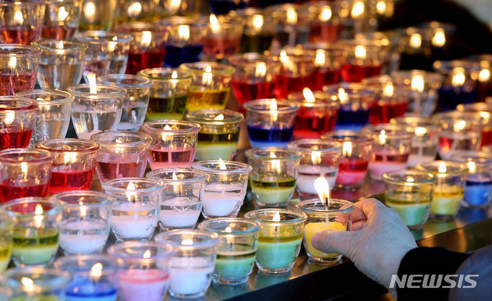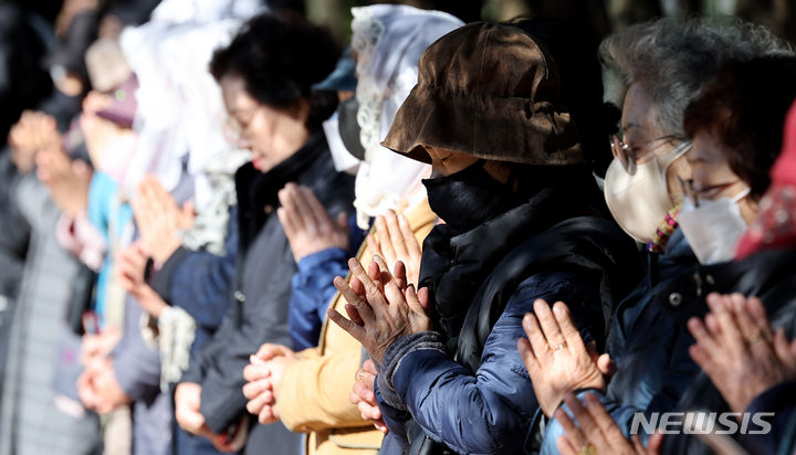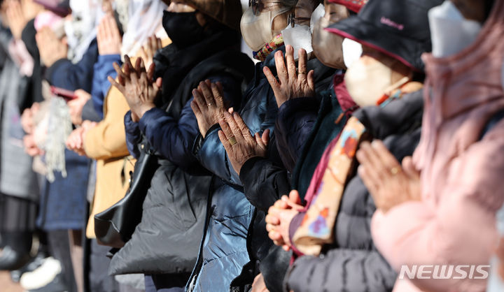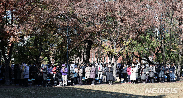 2024年度大学修学能力試験(修能。大学入学共通テストに相当)を二日後に控えた14日、大邱市中区のカトリック大邱大教区庁聖母堂で開かれた「受験生応援ミサ」で、出席した受験生保護者らが修能の高得点を願って祈りをささげている。