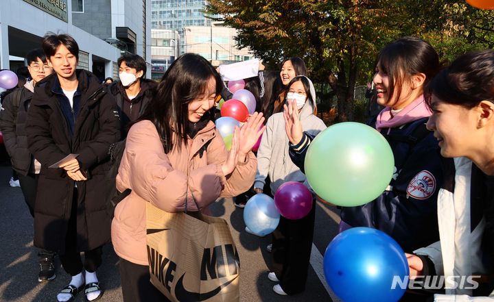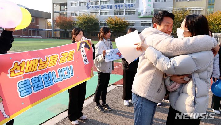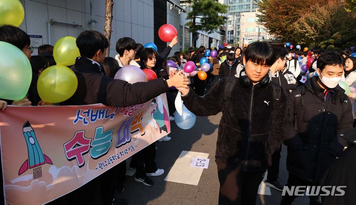 【NEWSIS】2024学年度大学修学能力試験(修能=大学入学共通テストに相当)が翌日に迫った15日午前、ソウル市広津区の広南高校で壮行会が行われた。写真は教師や後輩たちに励まされながら学校を後にする高校3年の受験生たち。