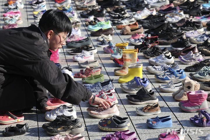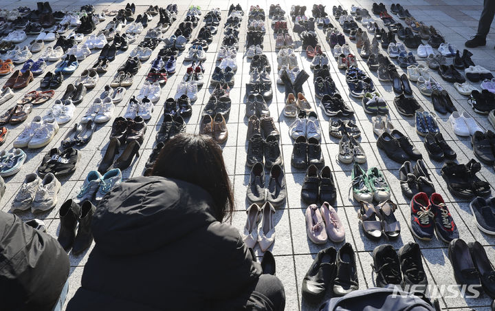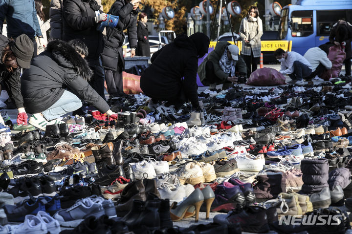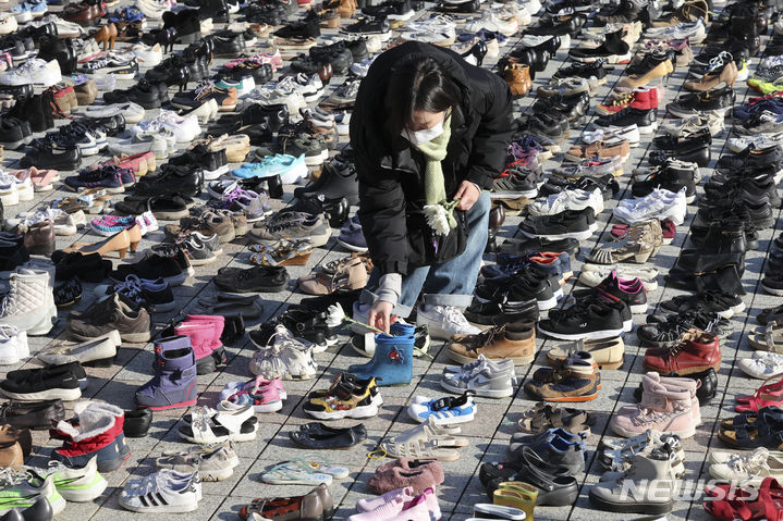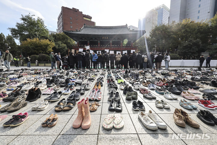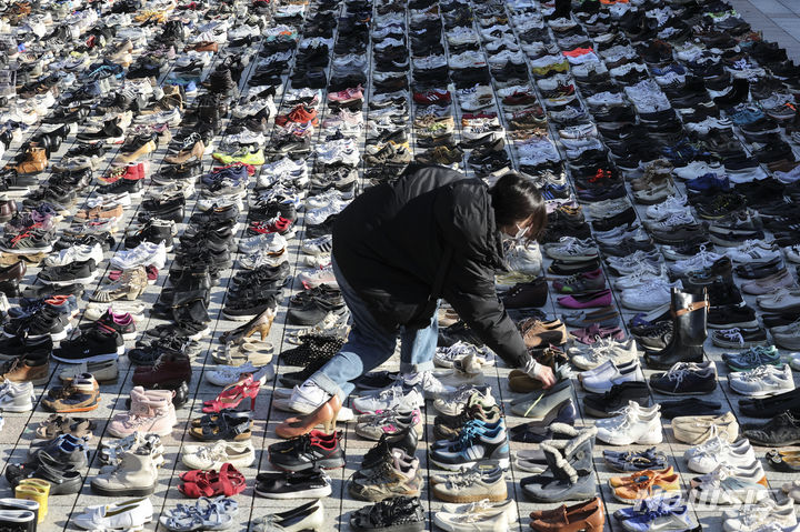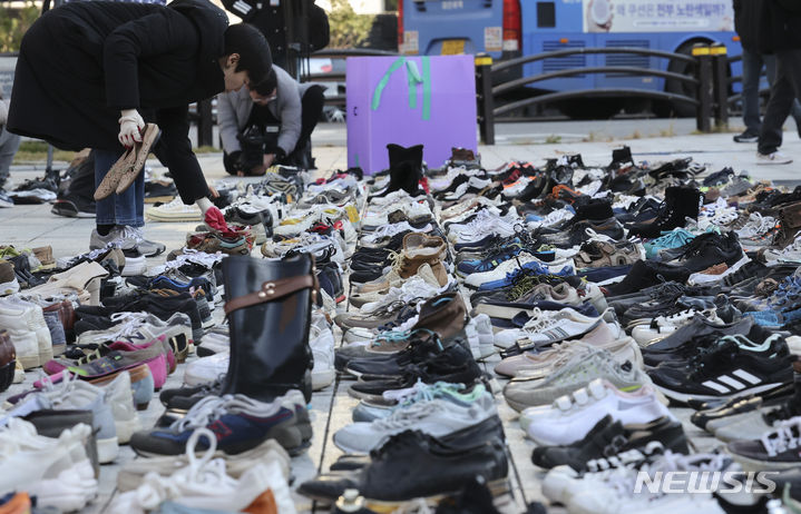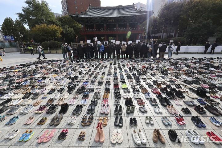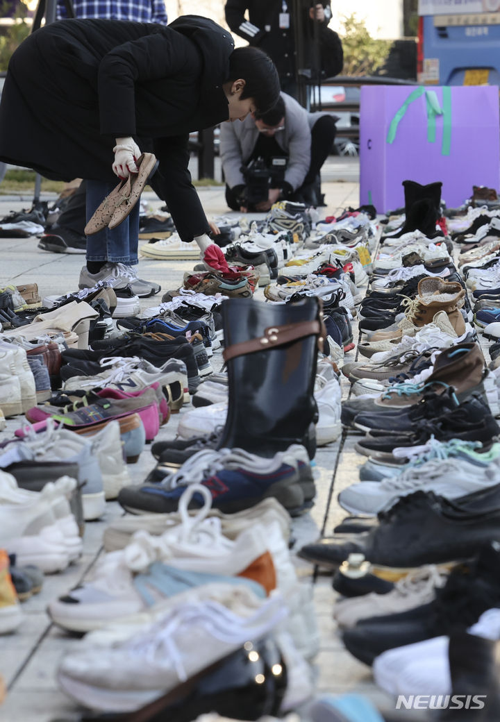 パレスチナと連帯する韓国市民社会緊急行動のメンバーたちが17日午前、ソウル市鍾路区の普信閣前で、パレスチナの犠牲者を追悼するため、靴を置くパフォーマンスを繰り広げた。