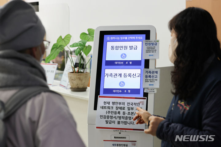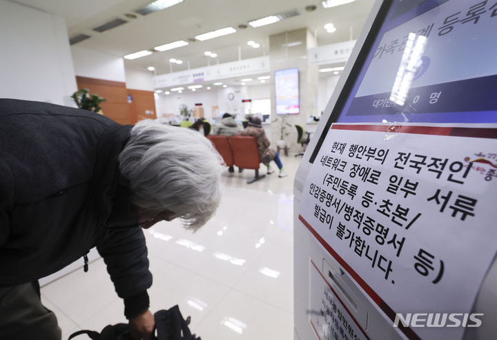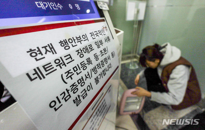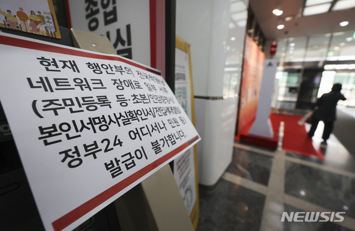 韓国の地方自治団体行政電算網に障害が発生した17日、ソウル市のある区庁では、総合民願室の電算機にネットワーク障害に関する案内文が張られていた。