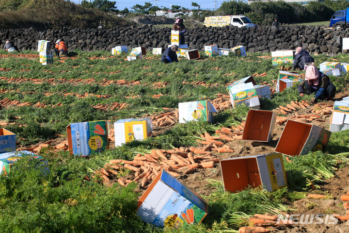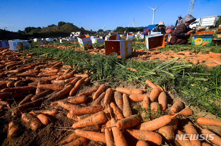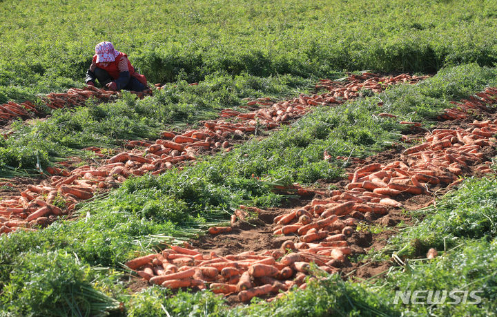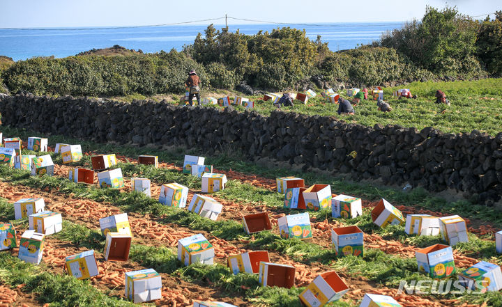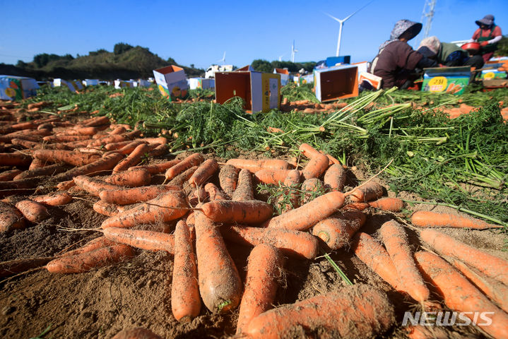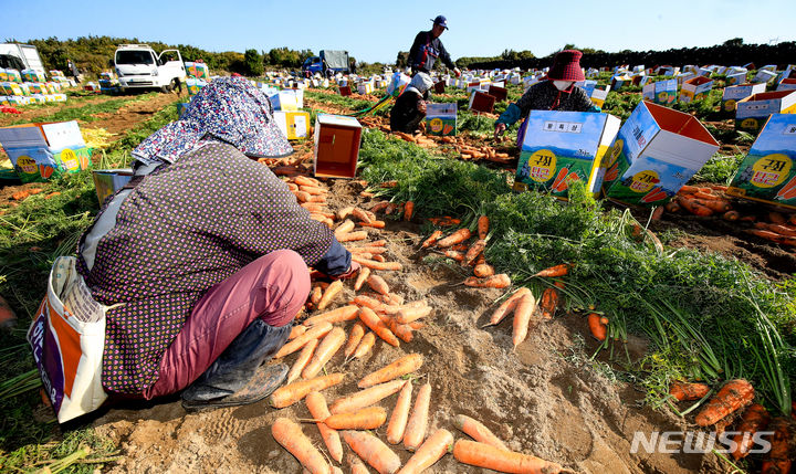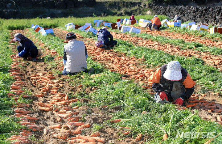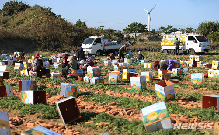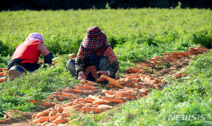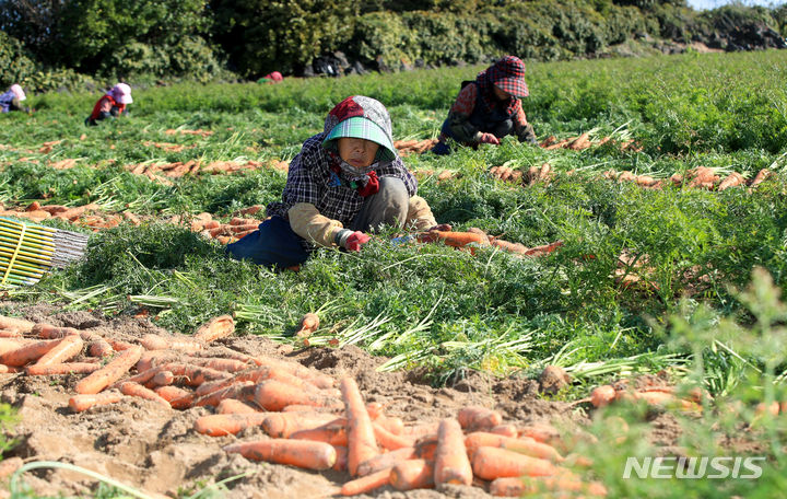 晴天の21日午前、韓国最大のニンジンの産地である済州市旧左邑では、農家の人々が旬のニンジンを収穫していた。