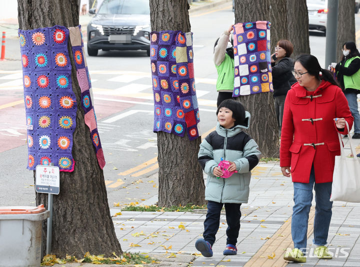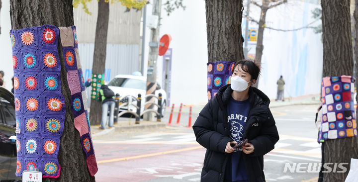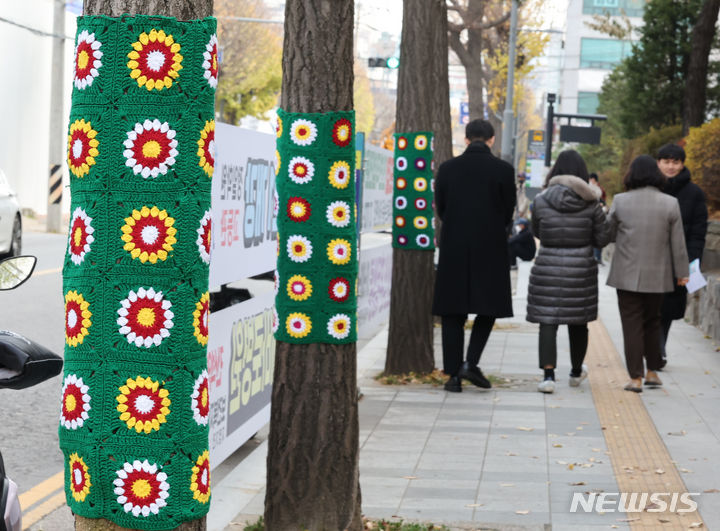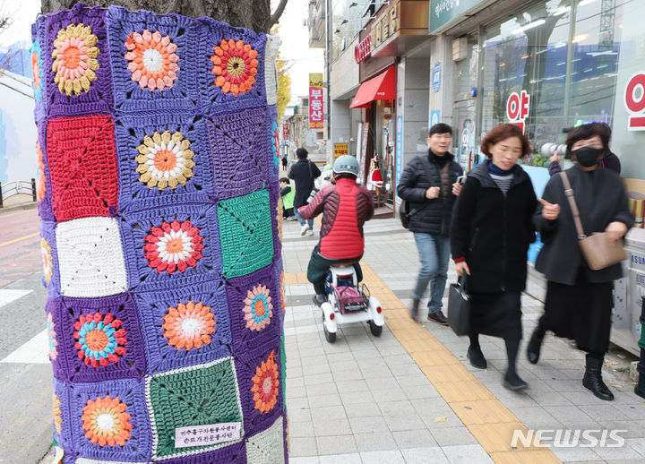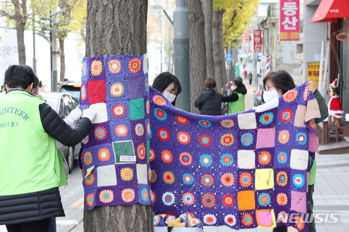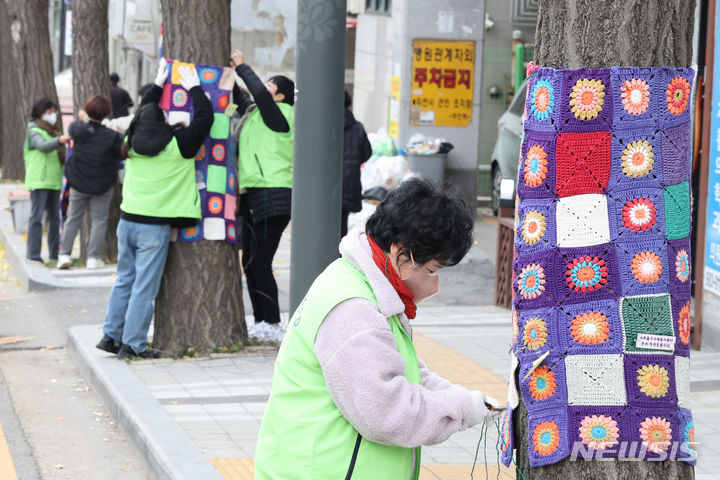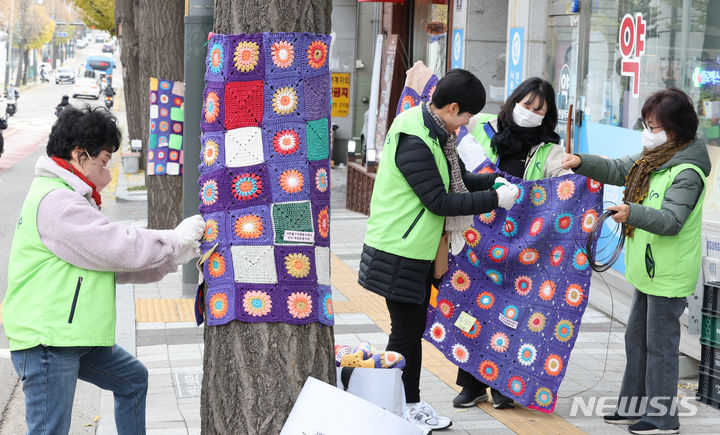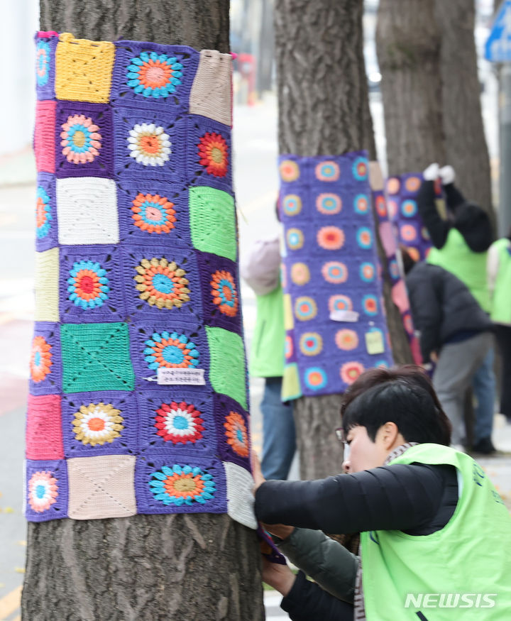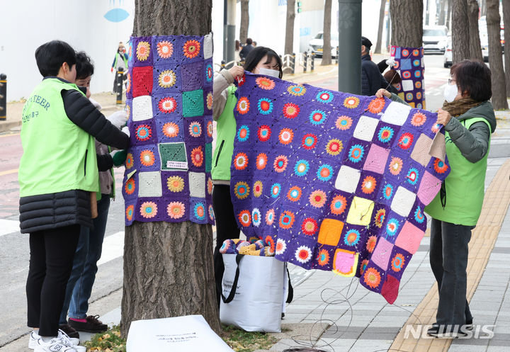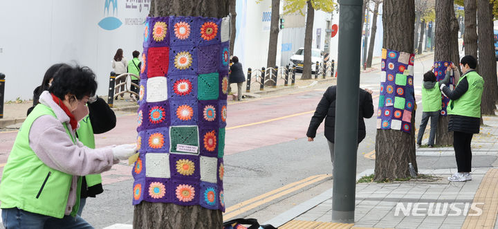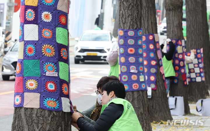22日午後、仁川・弥鄒忽区庁近くの歩道で、ボランティアの人々が街路樹に冬服を着せている様子。