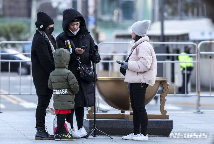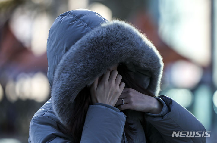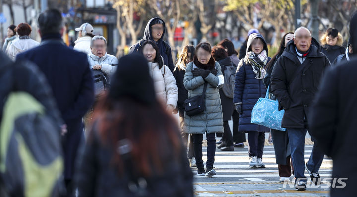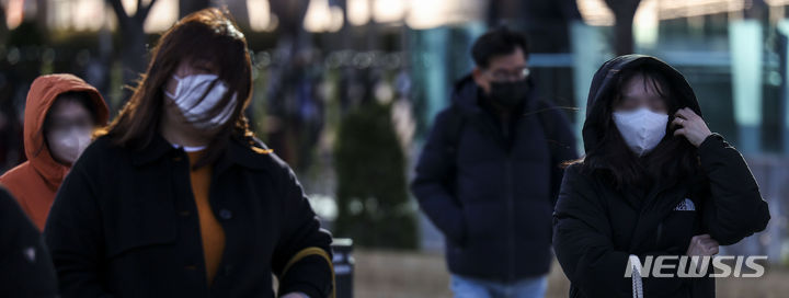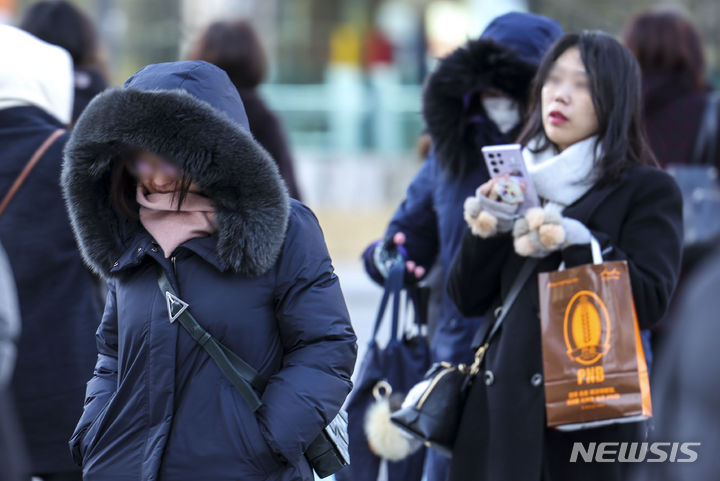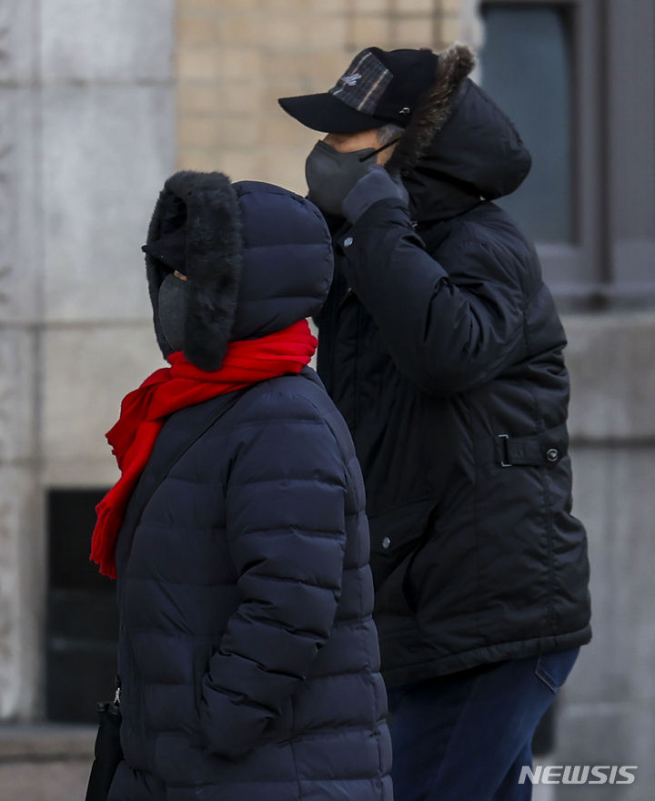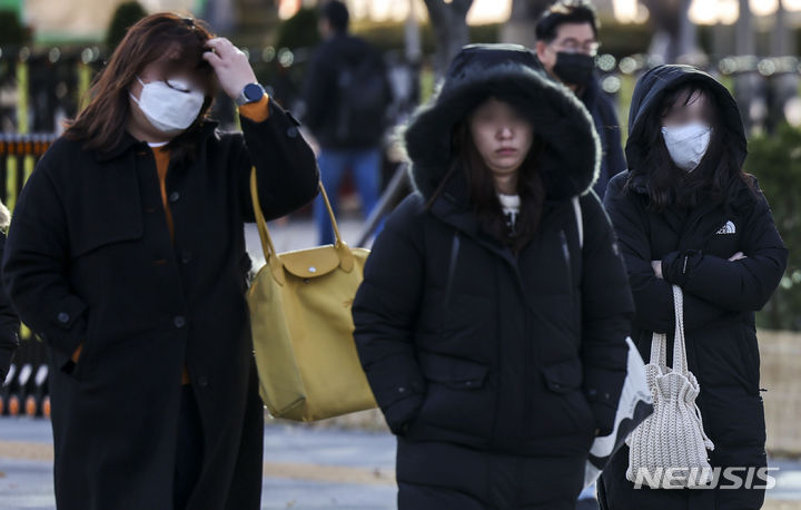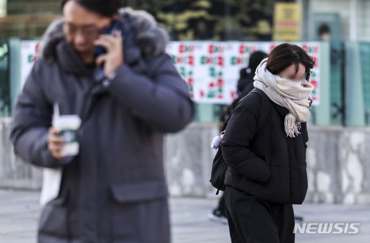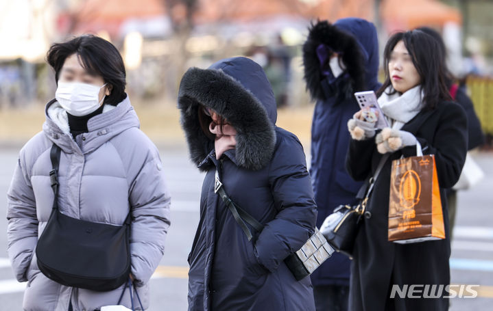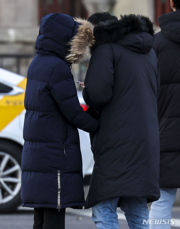【NEWSIS】ソウルと首都圏に寒波注意報が出された24日、ソウル市鍾路区の光化門交差点で、ダウンジャケットなど厚手の上着を着て歩く人々。