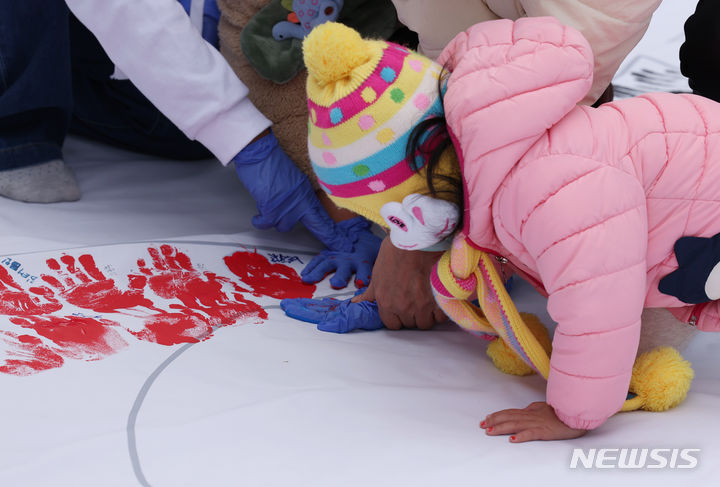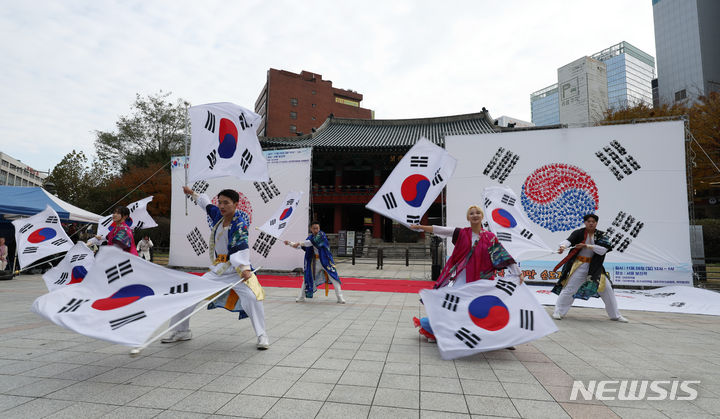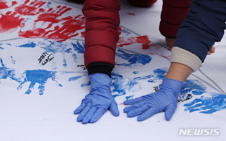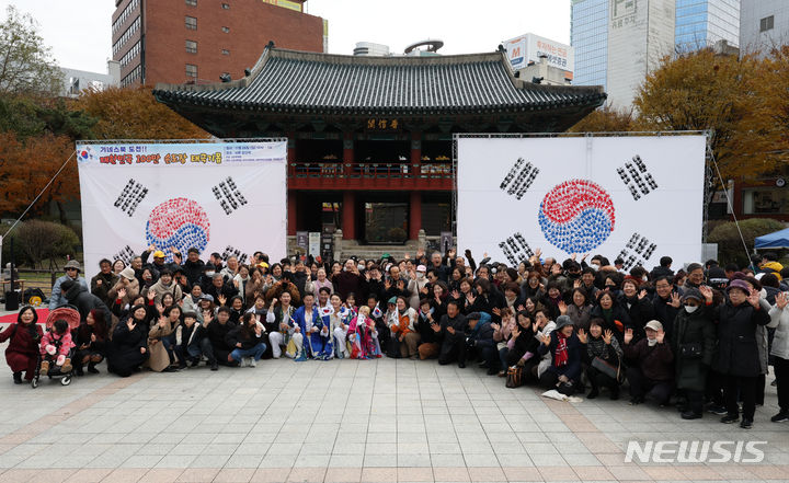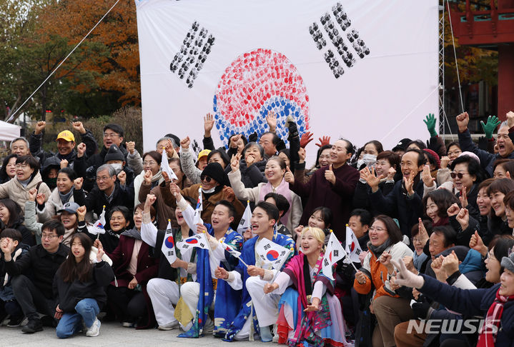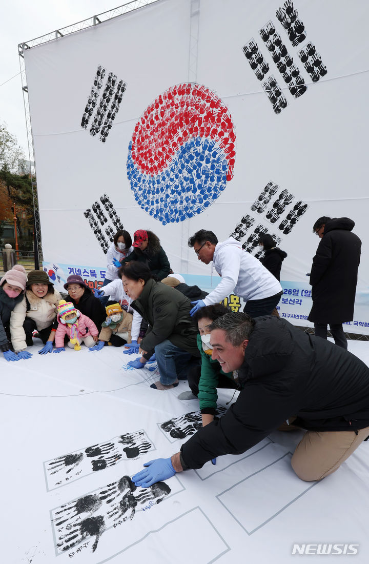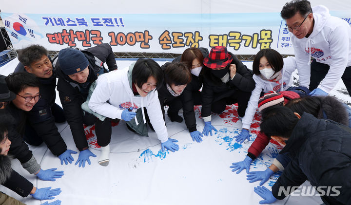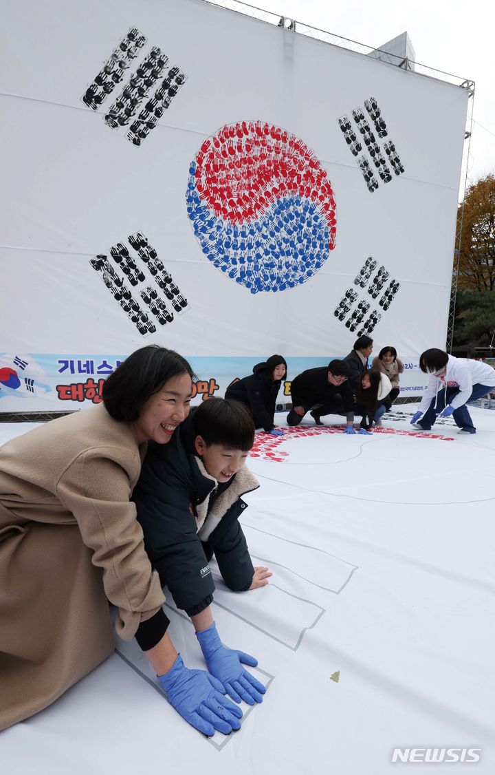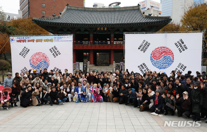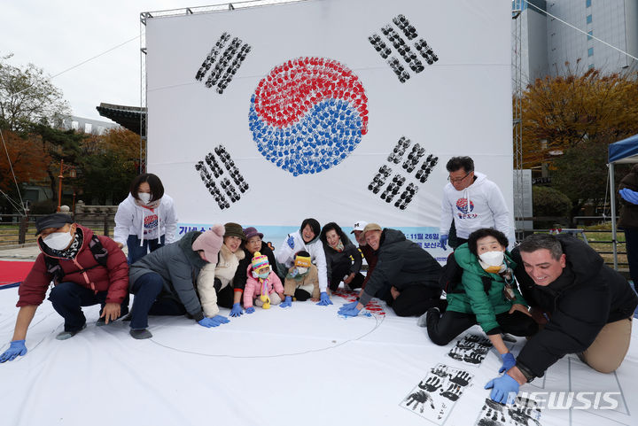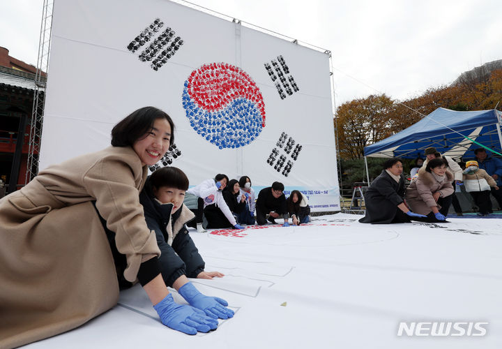【NEWSIS】26日、ソウル市内の普信閣前広場で、韓民族の精神と文化を研究・教育する社団法人「国学院」の主催により、「大韓民国100万手形太極旗モブ」キャンペーンが行われた。写真は手形で太極旗に色をつけた後、記念撮影をする参加者たち。