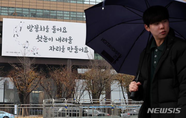 27日午前、ソウル市鍾路区の教保生命ビルの外壁「光化門掲示板」に、詩人イ・ウォンの詩「これは愛の歌」から抜粋した文言が掲げられている。