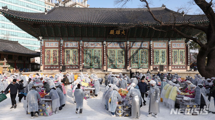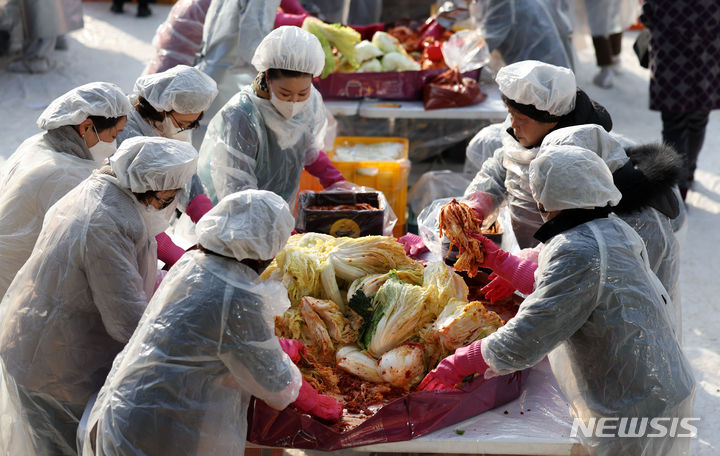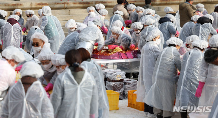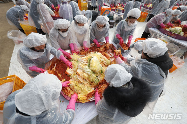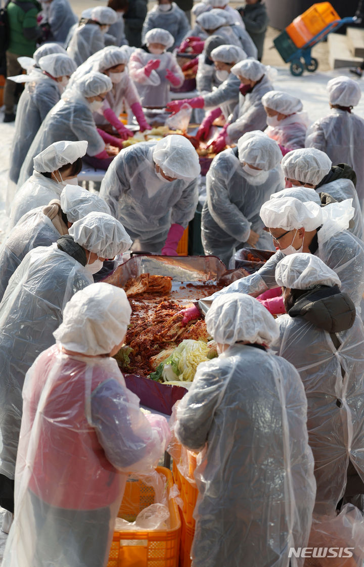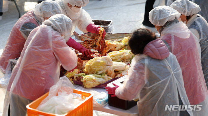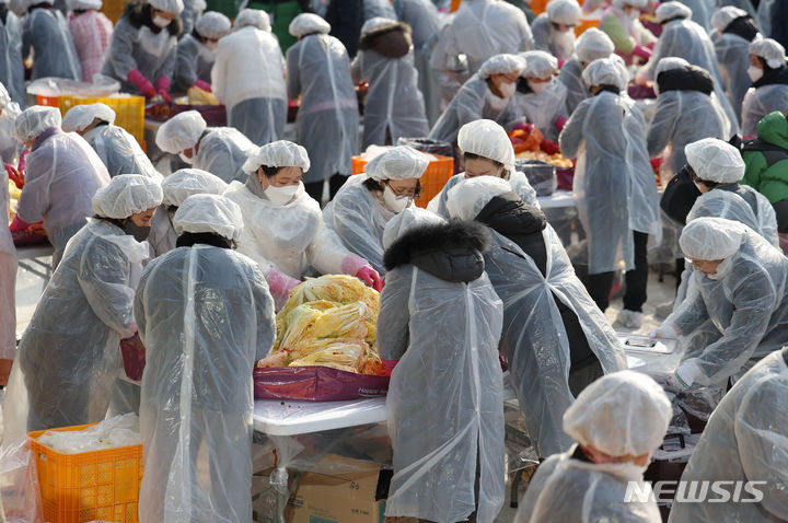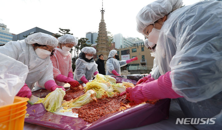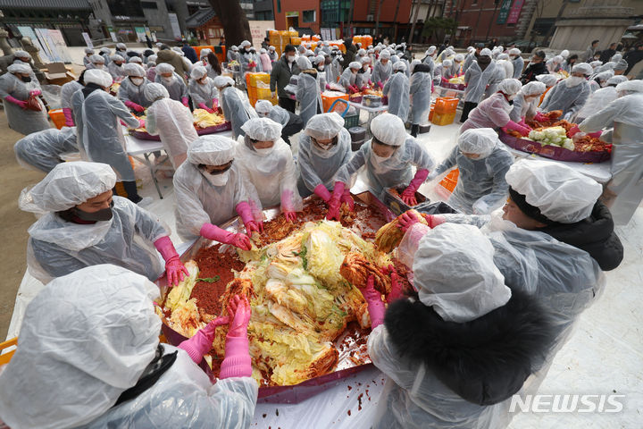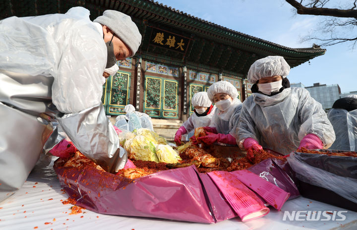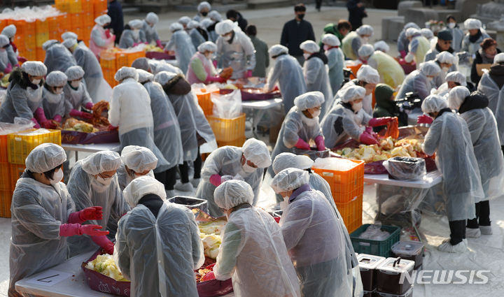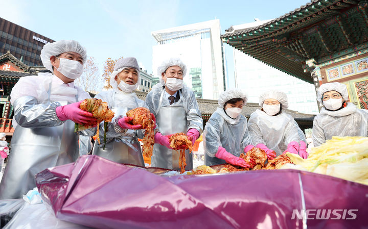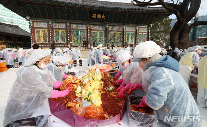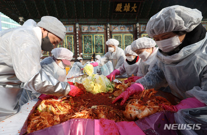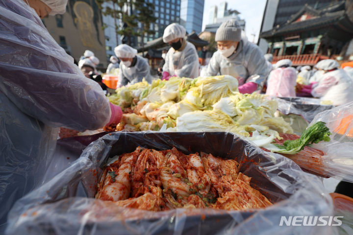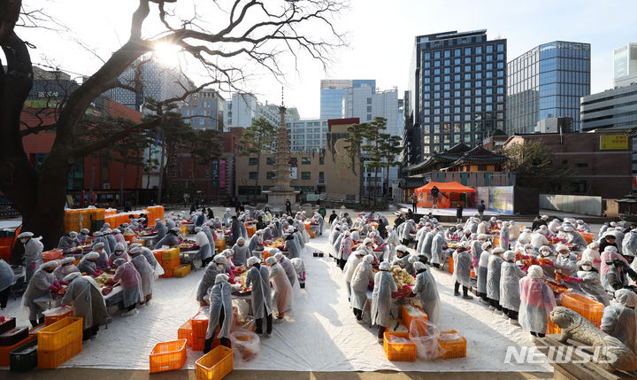ソウル市鍾路区の曹渓寺で29日、僧侶や信徒たちがキムジャン(越冬用のキムチ漬け)ボランティアに臨んだ。曹渓寺と都農交流(都市と農村の地方自治体による交流)中の全羅南道海南郡が後援した白菜でつくったキムチは、鍾路区内の住民センターを通じて恵まれない人たちに配られる。